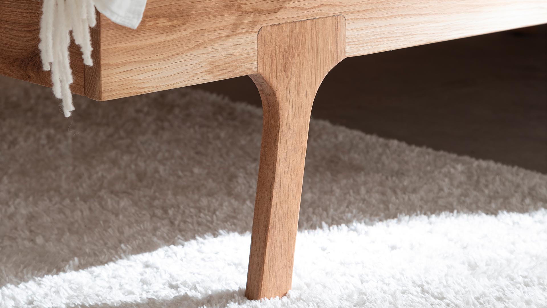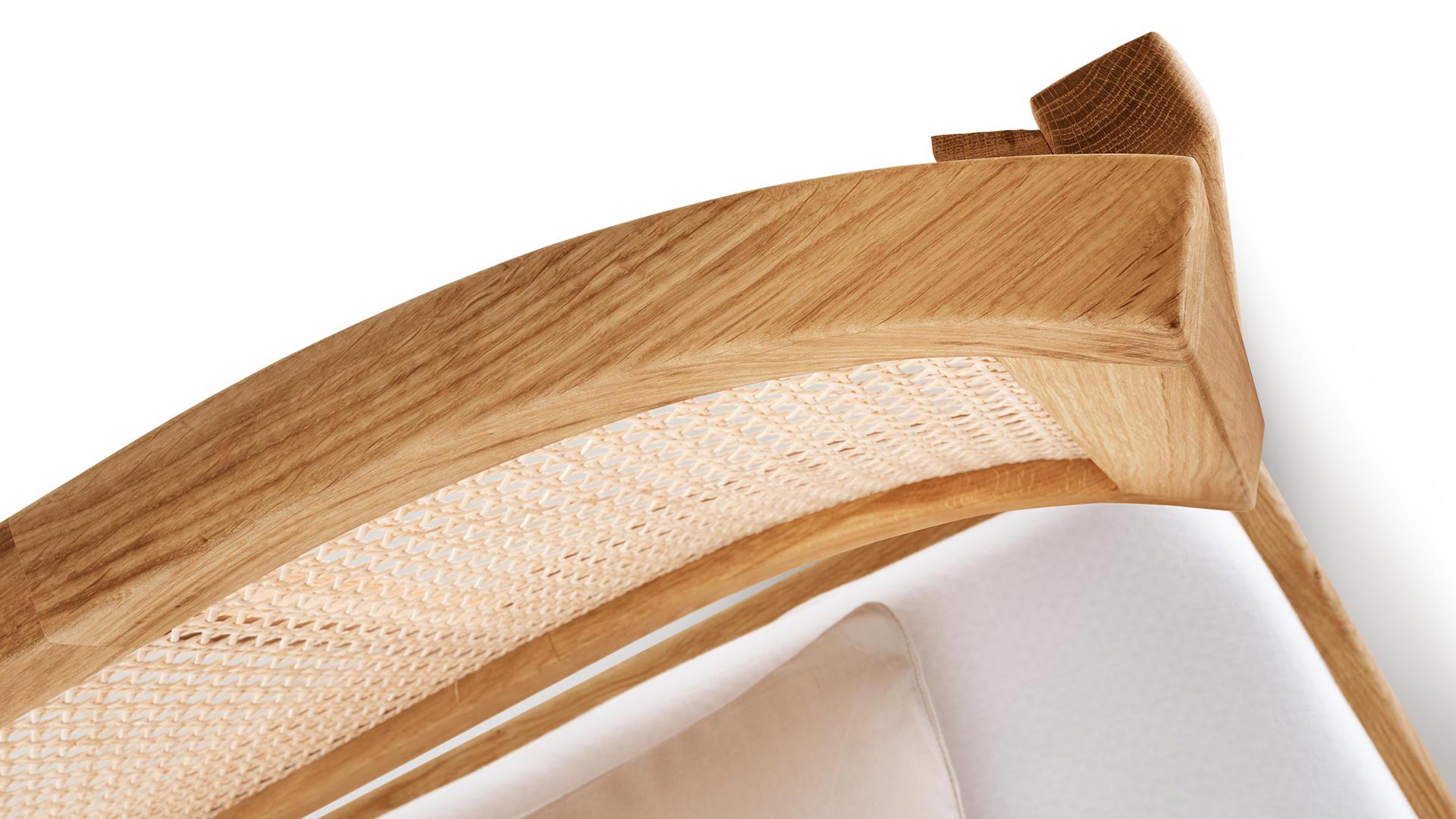 Das kaiserliche Design des Doppelbetts wird durch das edle Wildeichenholz weiter betont. Die leicht geschwungenen Füße sind meisterhaft in die Seitenteile eingearbeitet und verleihen dem Bett zusätzlich eine gewisse Leichtigkeit, da sie nicht direkt am Bett-Ende platziert sind. Das Highlight des Bettes ist das Kopfteil. Der Holzrahmen ist mit den elegant geschwungenen Seiten kunstvoll verarbeitet und schafft in Verbindung mit dem Wiener Geflecht ein einzigartiges Aussehen. "Belvedere" kombiniert das Wiener Geflecht mit einer modernen Formsprache und interpretiert so diesen Klassiker der Möbelbaukunst ganz neu.