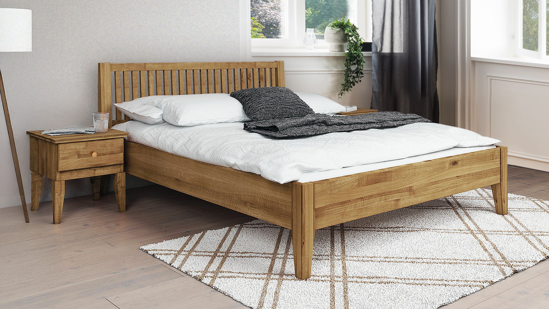 Das Kopfteil ist mit aufwendigen, vertikalen Sprossen akzentuiert und die konisch zulaufenden Füße sind markant am Bettrahmen angebracht. Das schadstoffgeprüfte Massivholzbett erhalten Sie in lebhafter Kernbuche oder edler Wildeiche.