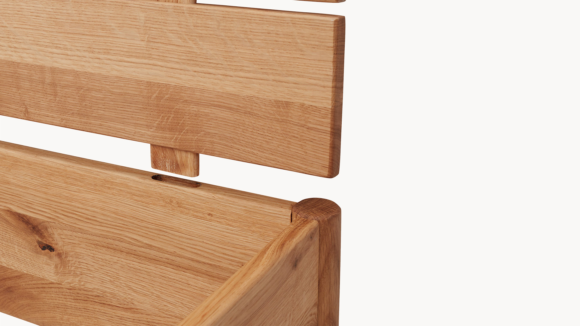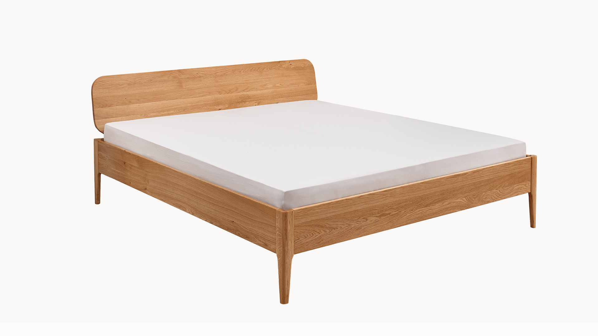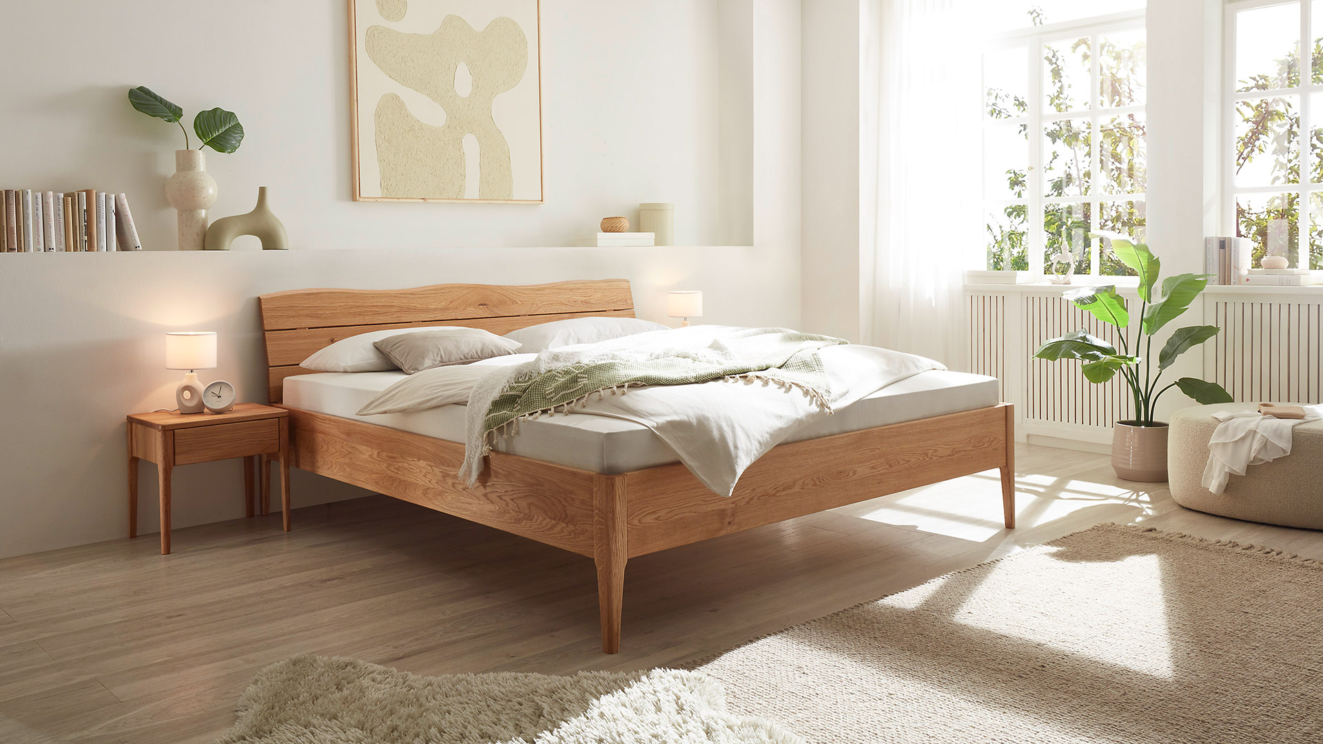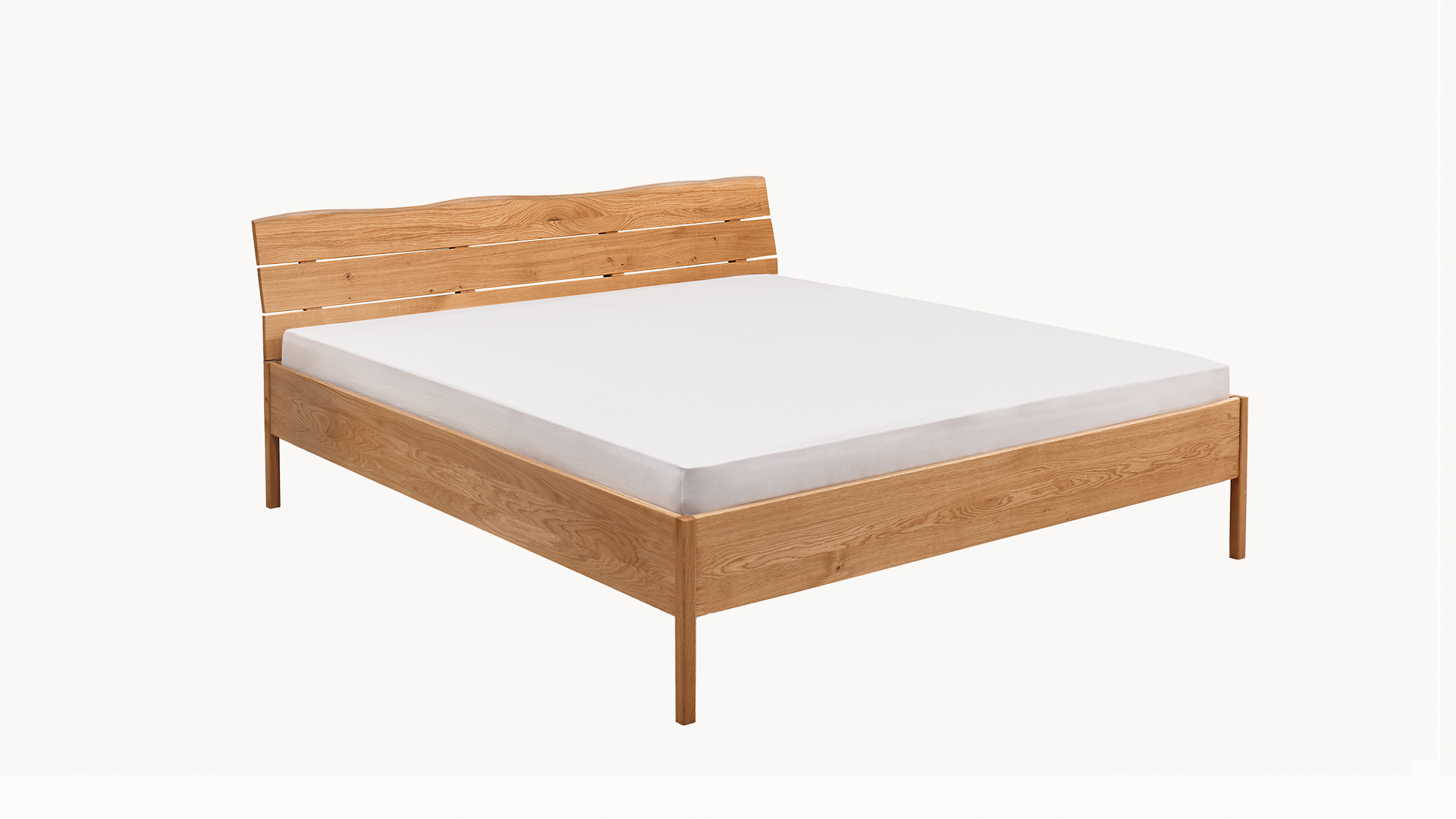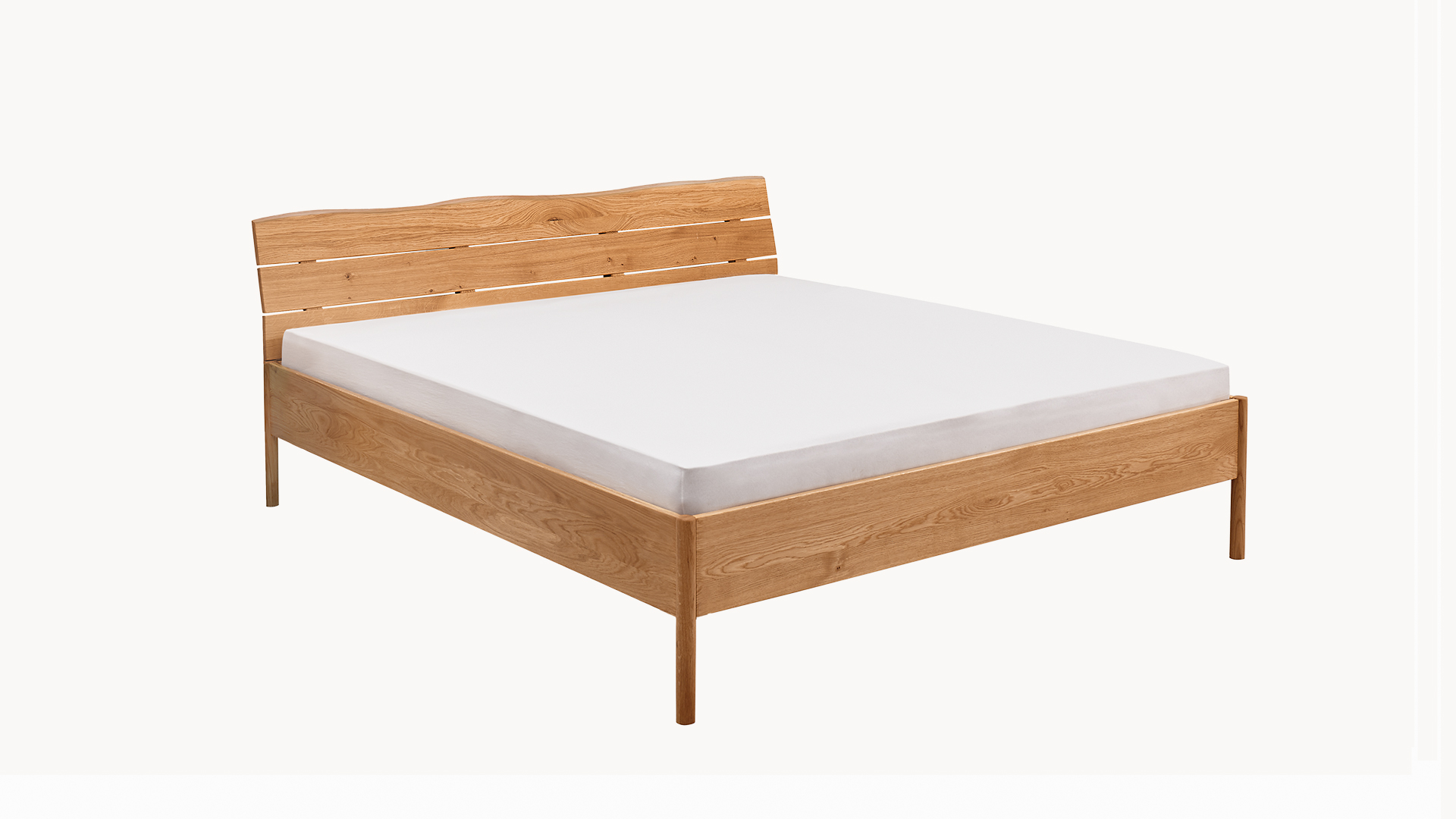 Massivholzbett "Elaria" erfüllt Ihr Schlafzimmer mit dem natürlichen Charme von massiver Wildeiche. Es ist komplett metallfrei verarbeitet und schenkt Ihnen ein rundum entspanntes Schlafgefühl. Die komfortable Rahmenhöhe von 45 cm erleichtert das Aufstehen spürbar und unterstützt Ihren Rücken. Wählen Sie Ihr Wunschdesign aus 3 Kopfteilen und 3 Fußvarianten – ganz nach Ihrem Stil. Ob geradlinig, mit Baumkante, abgerundet oder ohne Kopfteil: "Elaria" verbindet zeitlosen Stil und solides Handwerk.