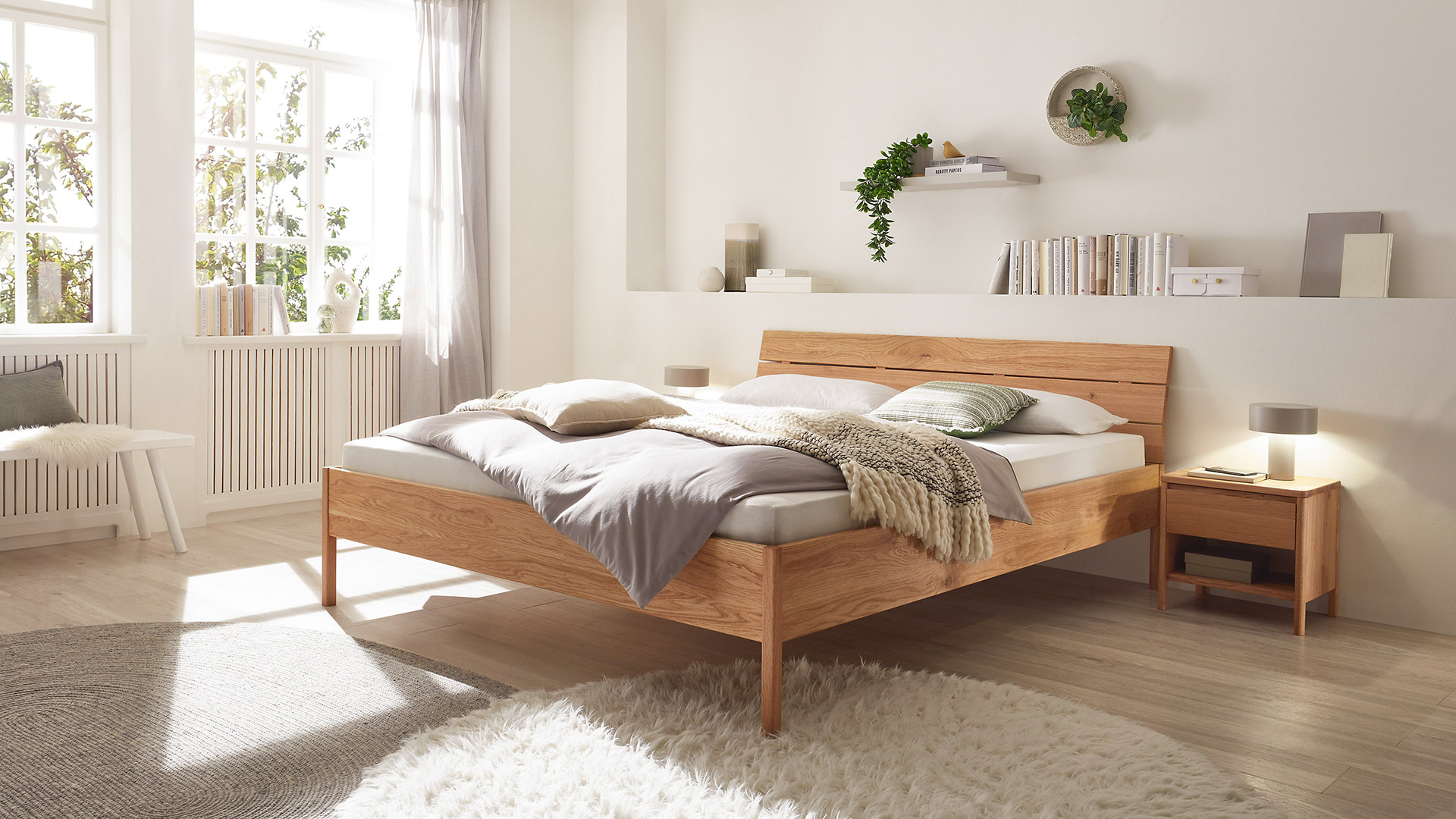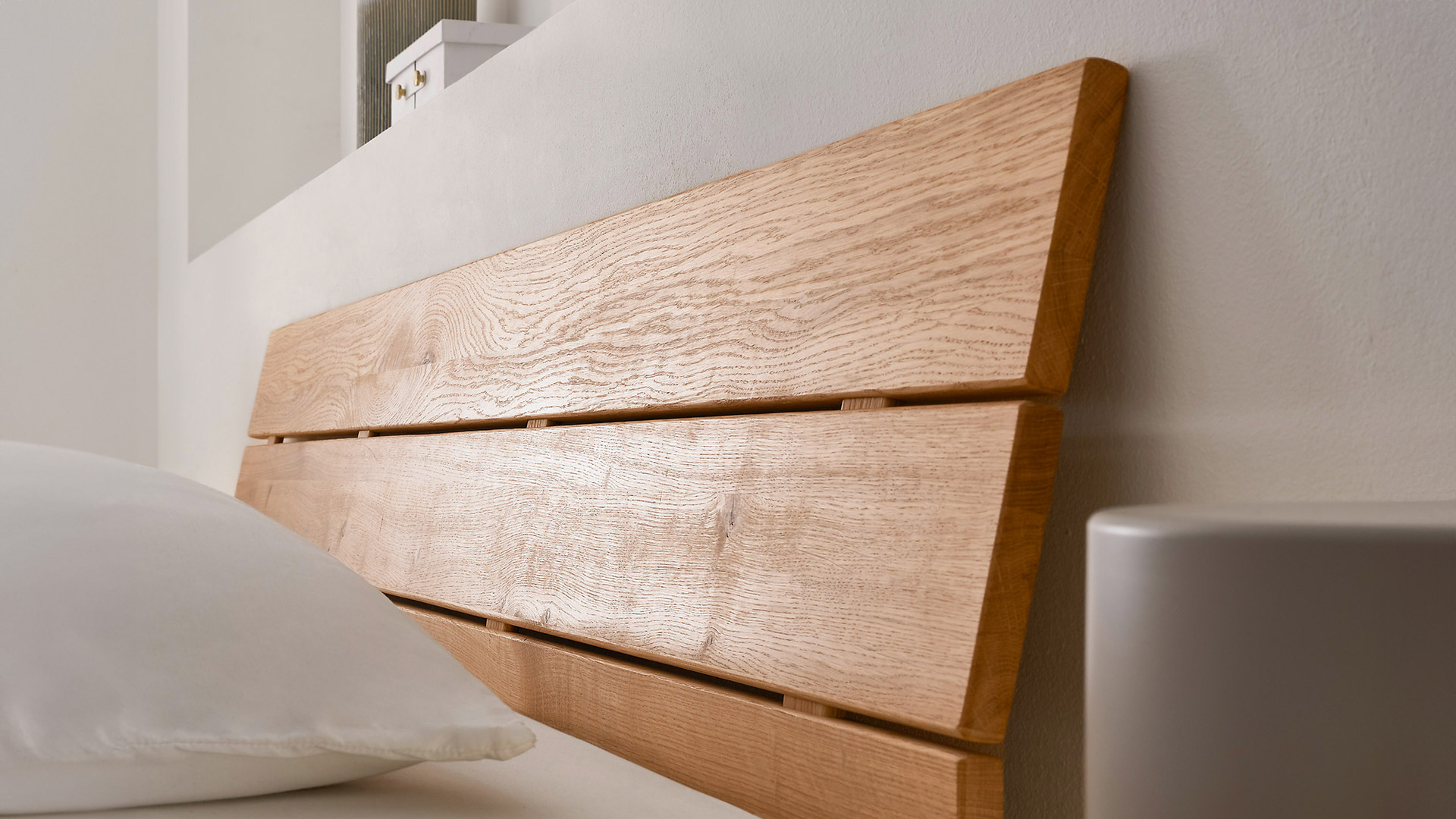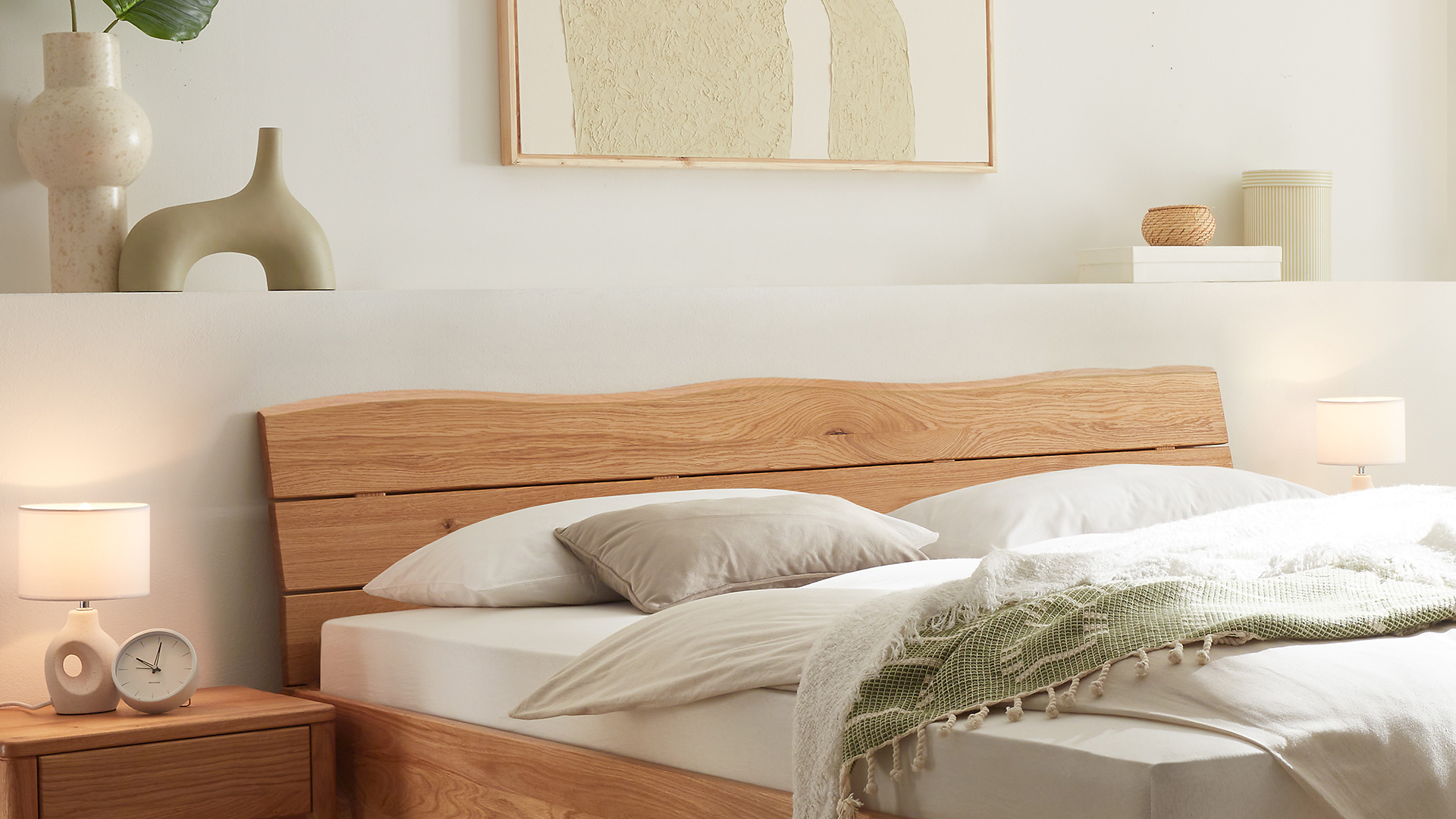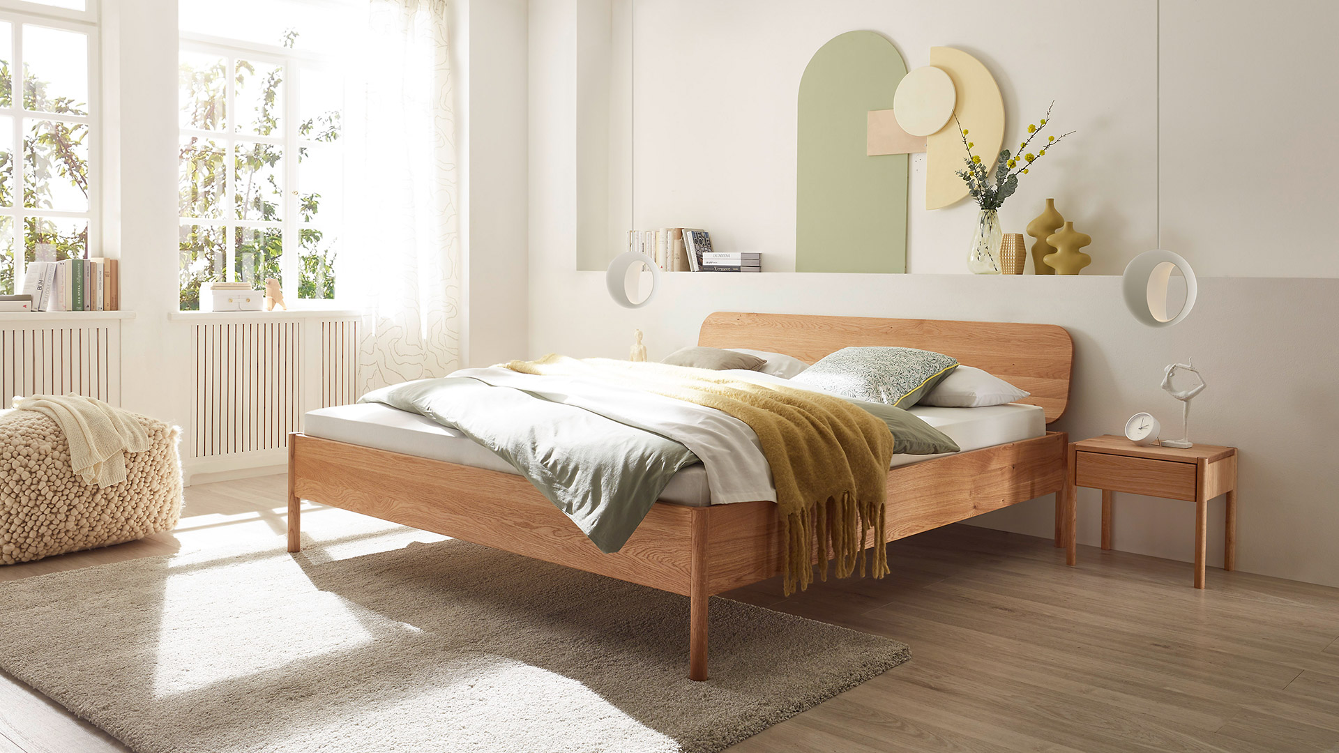 Massivholzbett "Elaria" erfüllt Ihr Schlafzimmer mit dem natürlichen Charme von massiver Wildeiche. Es ist komplett metallfrei verarbeitet und schenkt Ihnen ein rundum entspanntes Schlafgefühl. Die komfortable Rahmenhöhe von 45 cm erleichtert das Aufstehen spürbar und unterstützt Ihren Rücken. Wählen Sie Ihr Wunschdesign aus 3 Kopfteilen und 3 Fußvarianten – ganz nach Ihrem Stil. Ob geradlinig, mit Baumkante, abgerundet oder ohne Kopfteil: "Elaria" verbindet zeitlosen Stil und solides Handwerk.