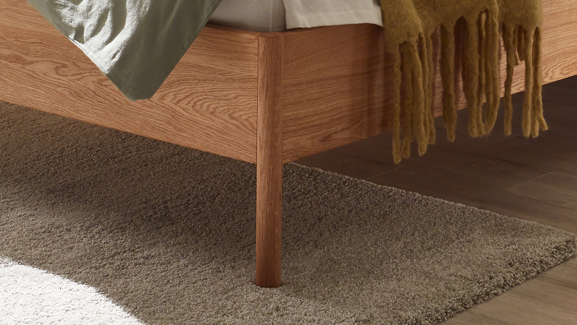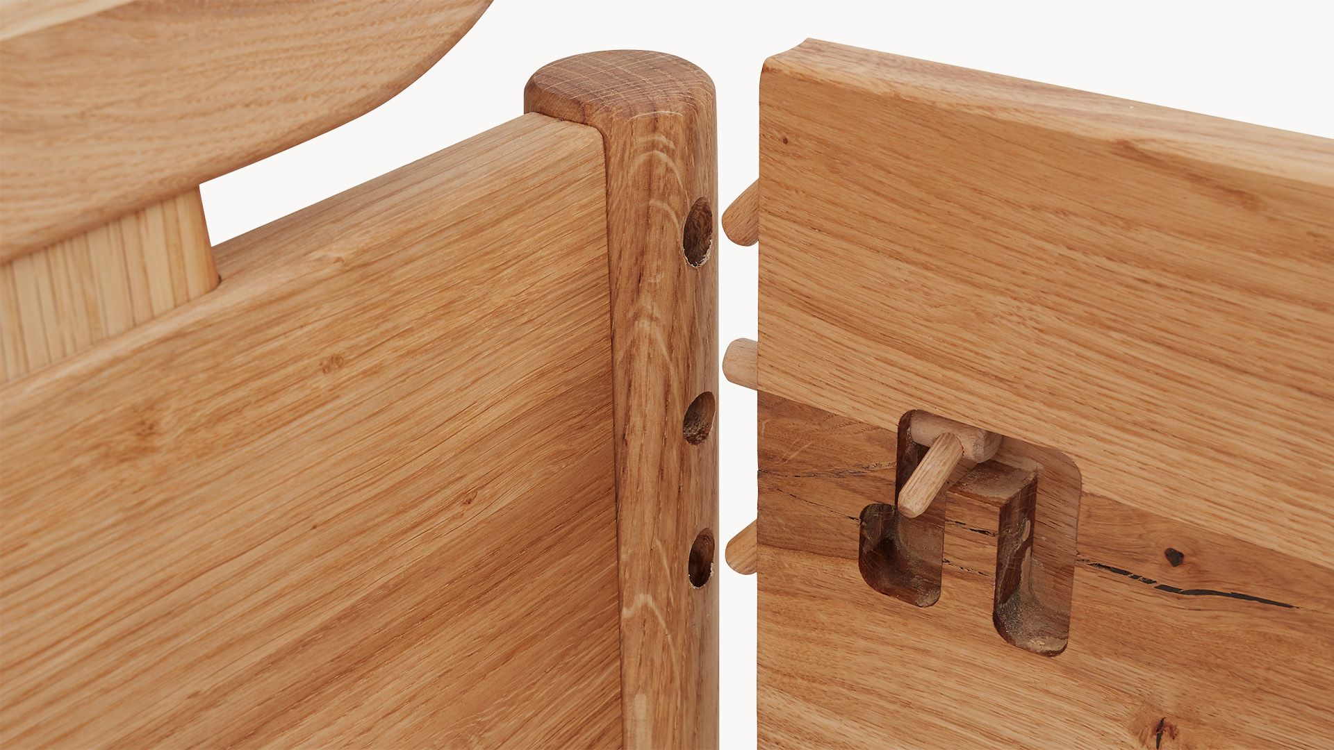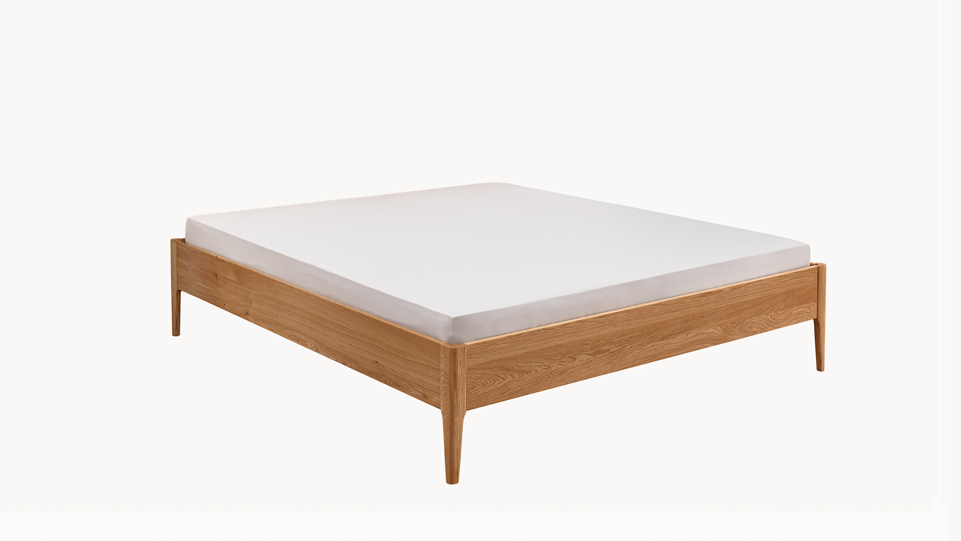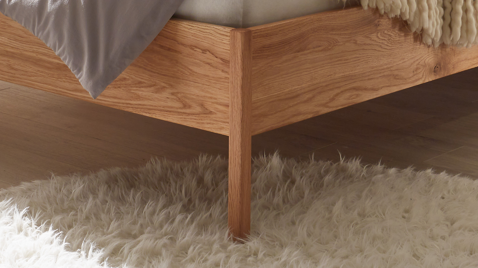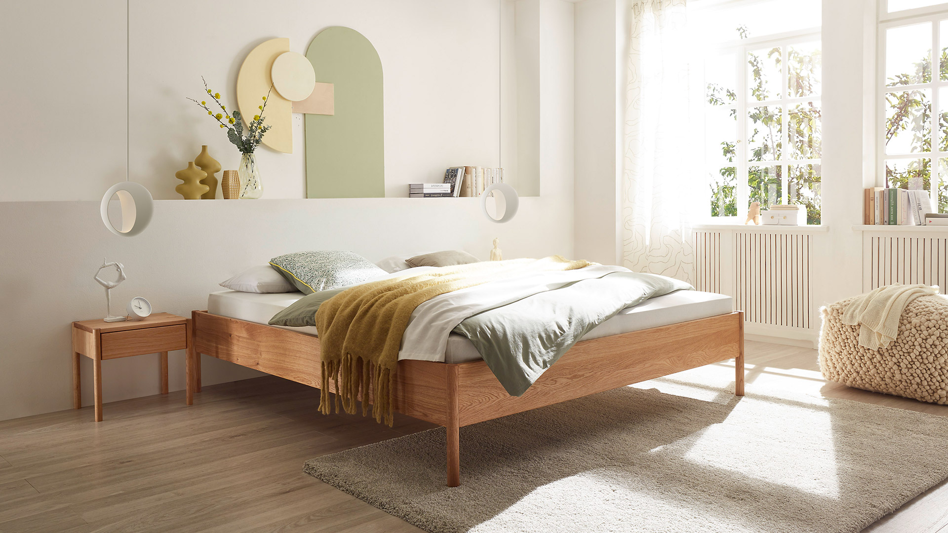 Massivholzbett "Elaria" erfüllt Ihr Schlafzimmer mit dem natürlichen Charme von massiver Wildeiche. Es ist komplett metallfrei verarbeitet und schenkt Ihnen ein rundum entspanntes Schlafgefühl. Die komfortable Rahmenhöhe von 45 cm erleichtert das Aufstehen spürbar und unterstützt Ihren Rücken. Wählen Sie Ihr Wunschdesign aus 3 Kopfteilen und 3 Fußvarianten – ganz nach Ihrem Stil. Ob geradlinig, mit Baumkante, abgerundet oder ohne Kopfteil: "Elaria" verbindet zeitlosen Stil und solides Handwerk.