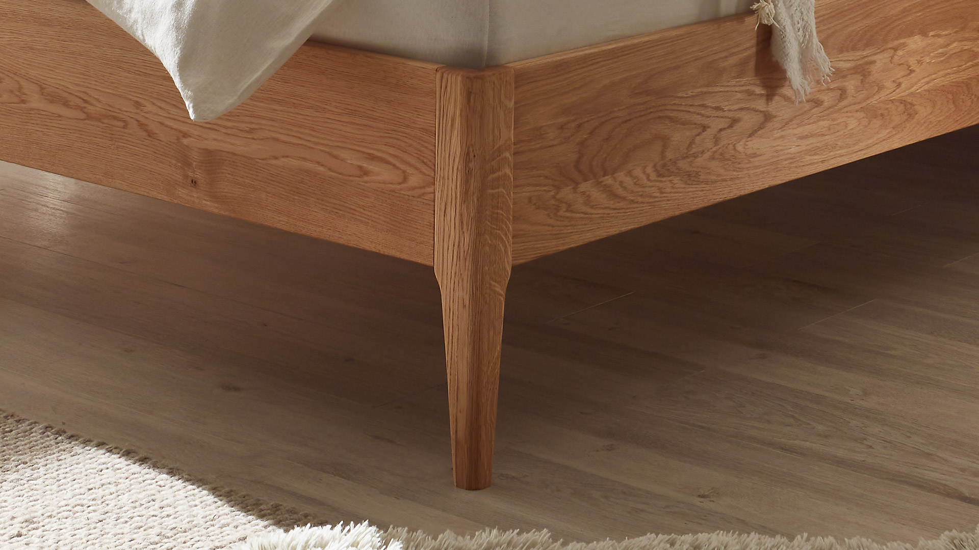 Metallfreies Massivholzbett "Elaria" mit konisch zulaufenden Füßen und Baumkanten-Kopfteil