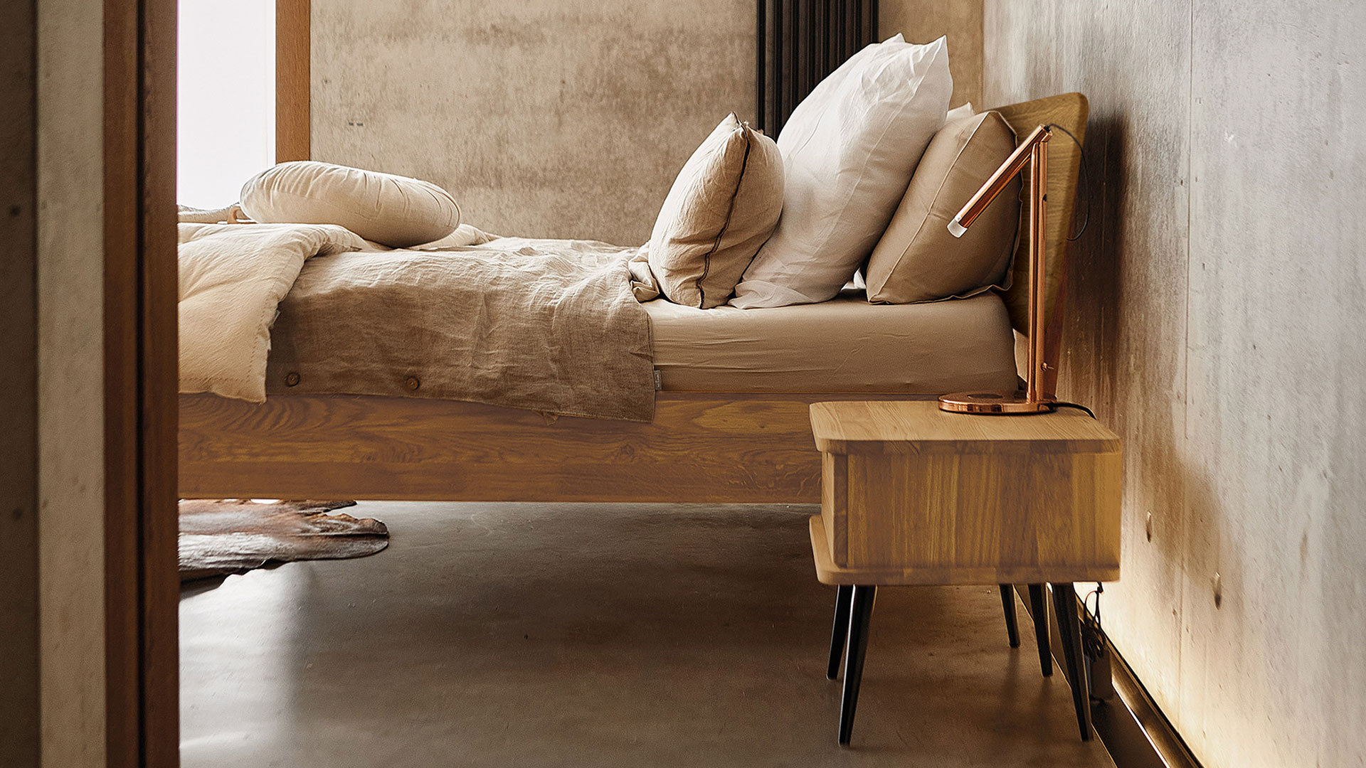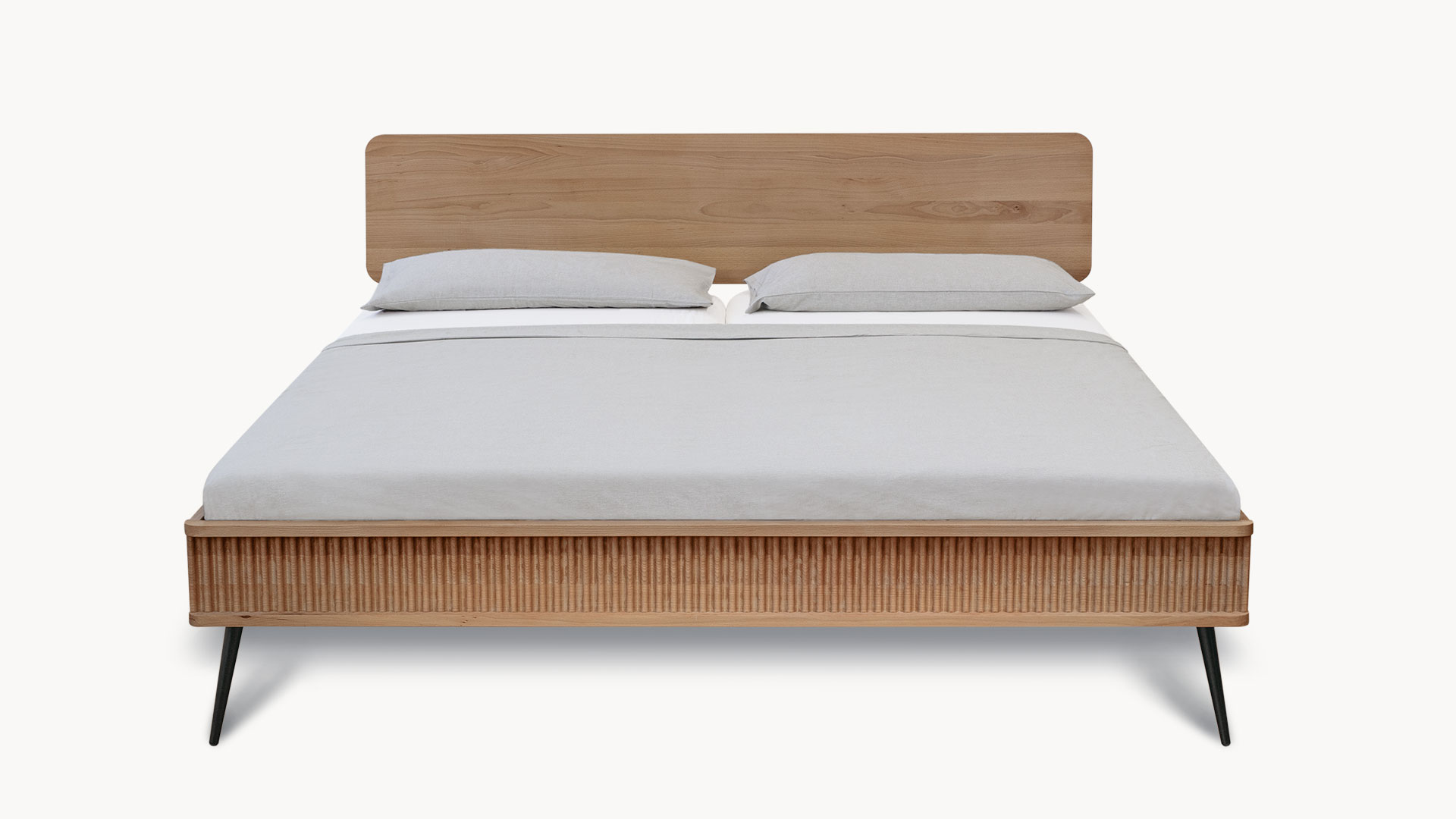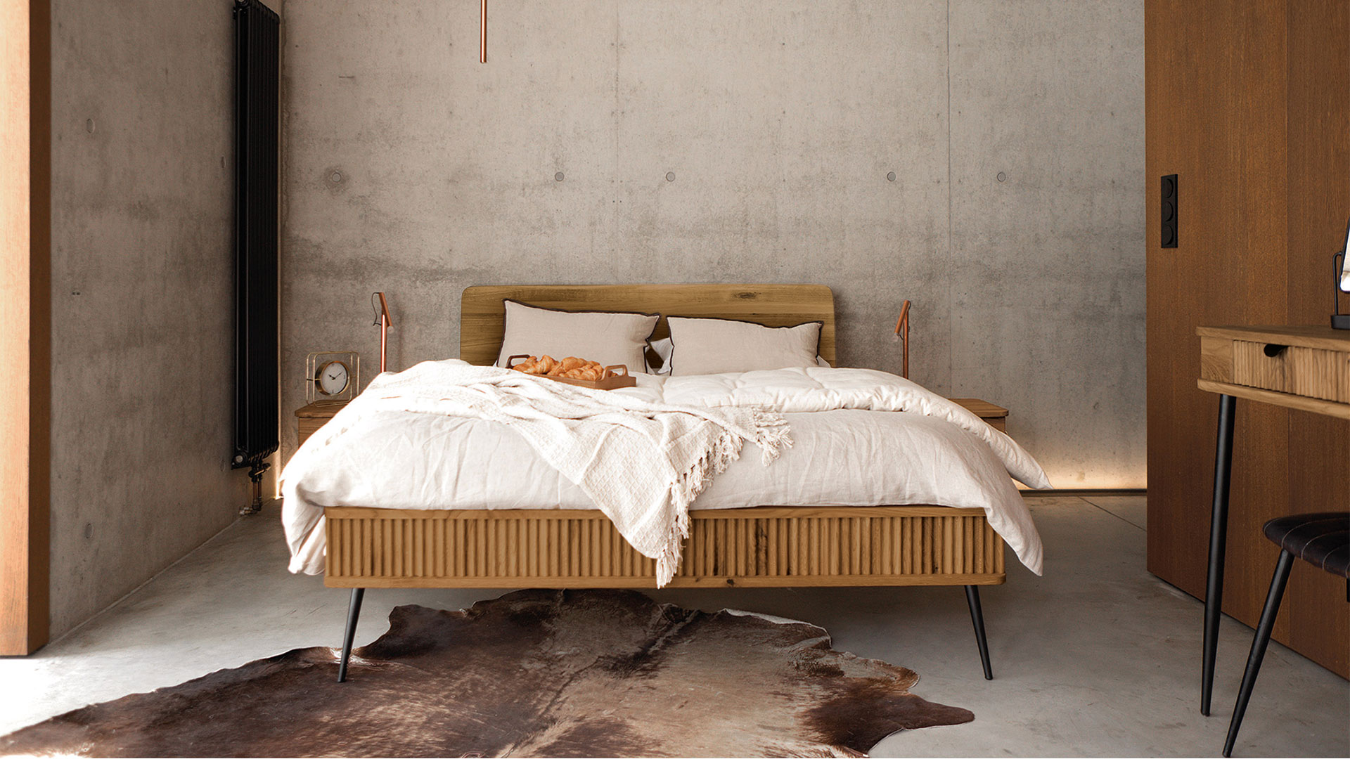 Das Massivholzbett "Ondas" lädt Sie mit seinen runden Formen und dem einzigartigen Wellen-Relief am Fußende zu stilvollen und erholsamen Stunden ein.