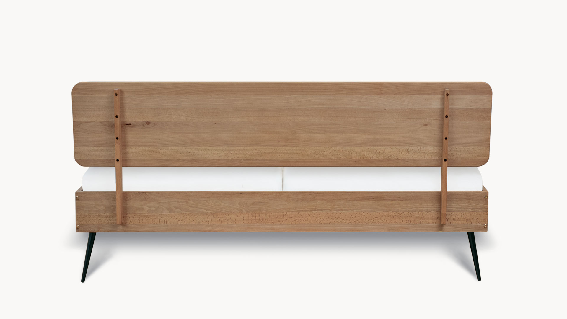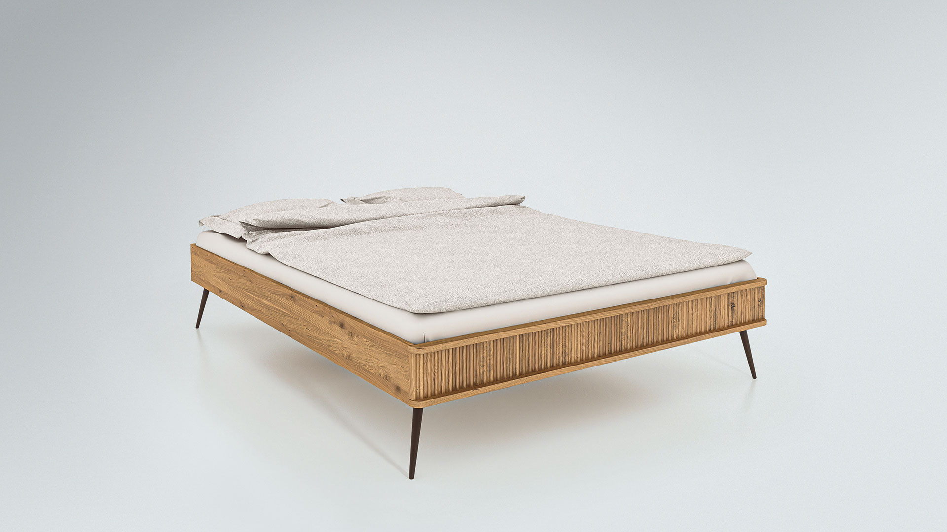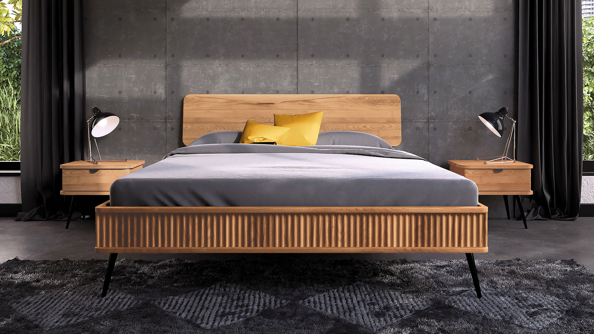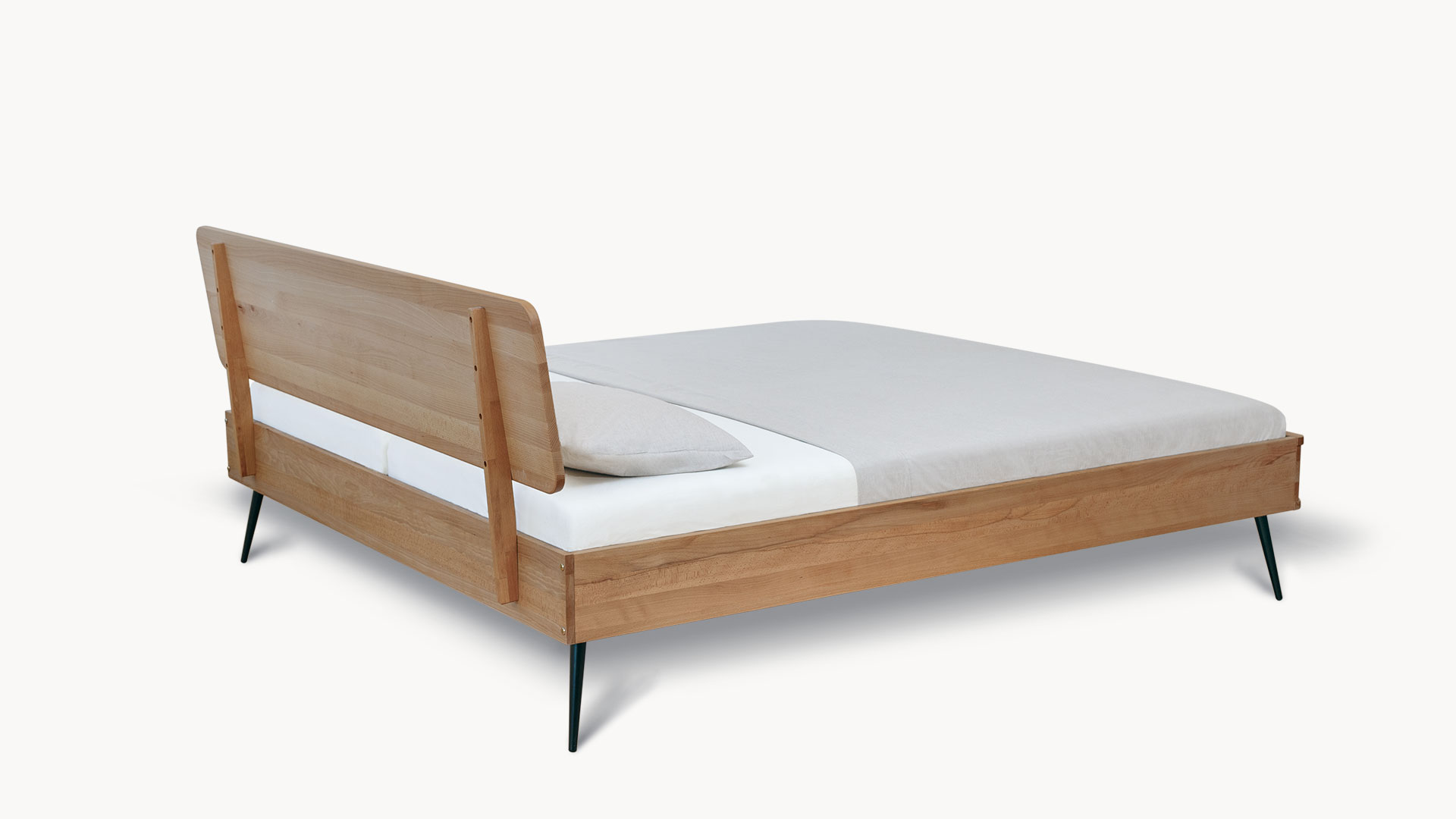 Die Ober- und Unterkanten des Bettrahmens greifen das runde Design des Wellen-Reliefs gekonnt auf und geben dem Bett ein harmonisches Aussehen. Das Kopfteil aus Massivholz stellt die einzigartige Maserung des massiven Wildeichen- oder Kernbuchenholzes in den Mittelpunkt. Die Bettfüße aus schwarzem Metall schenken dem Bett eine optische Leichtigkeit und lenken die Blicke auf den hochwertig gefertigten Holzrahmen.