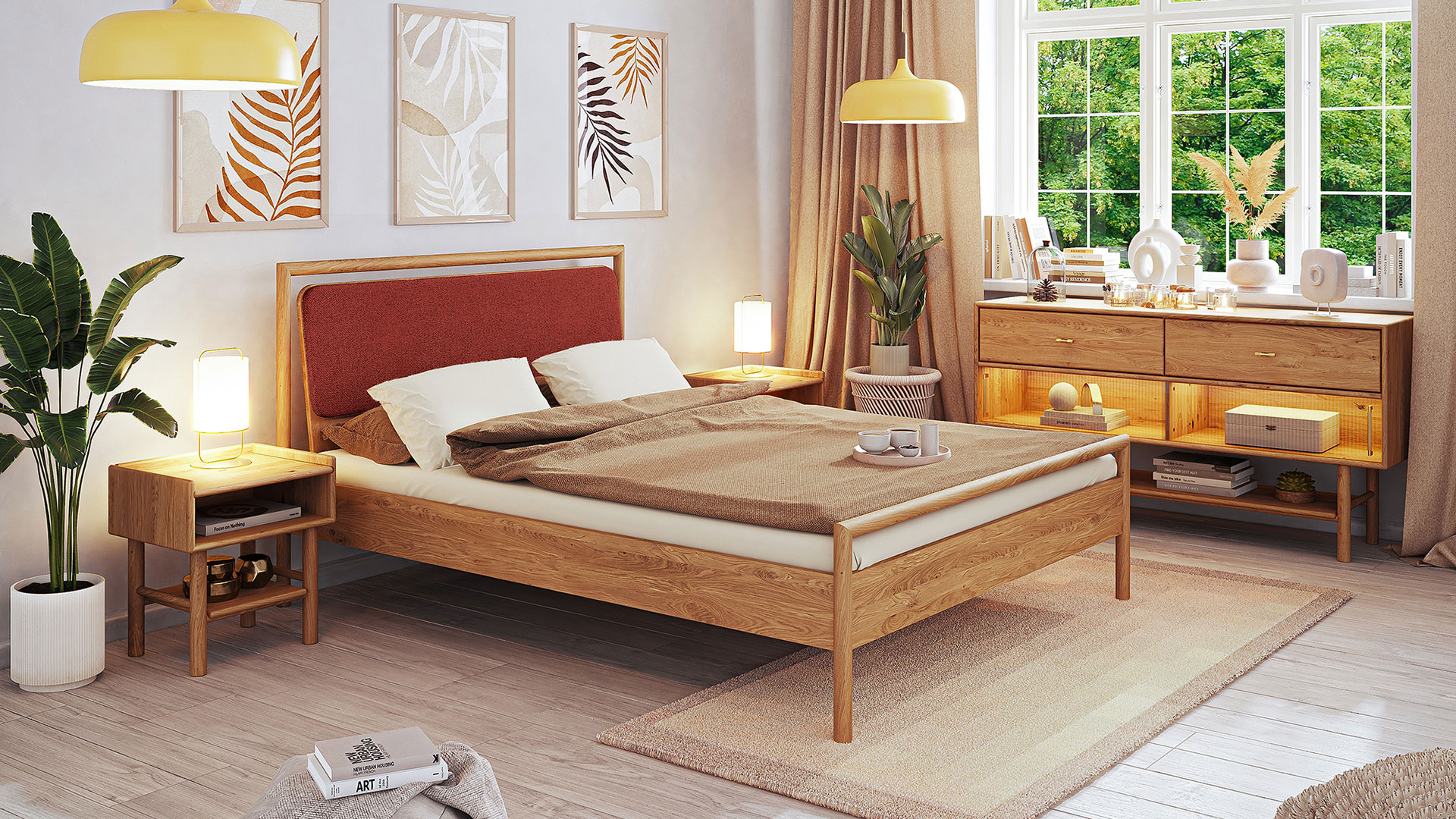Starten Sie jeden Tag mit einem Lächeln: Das Massivholzbett "Serea" verbindet den Charme des Mid-Century-Stils mit der Wärme edler Naturhölzer. Die klaren Linien und das sorgfältig verarbeitete Massivholz in Kernbuche, Wildeiche oder Wildeiche mokka verleihen Ihrem Schlafzimmer eine Atmosphäre voller Ruhe und Harmonie.
