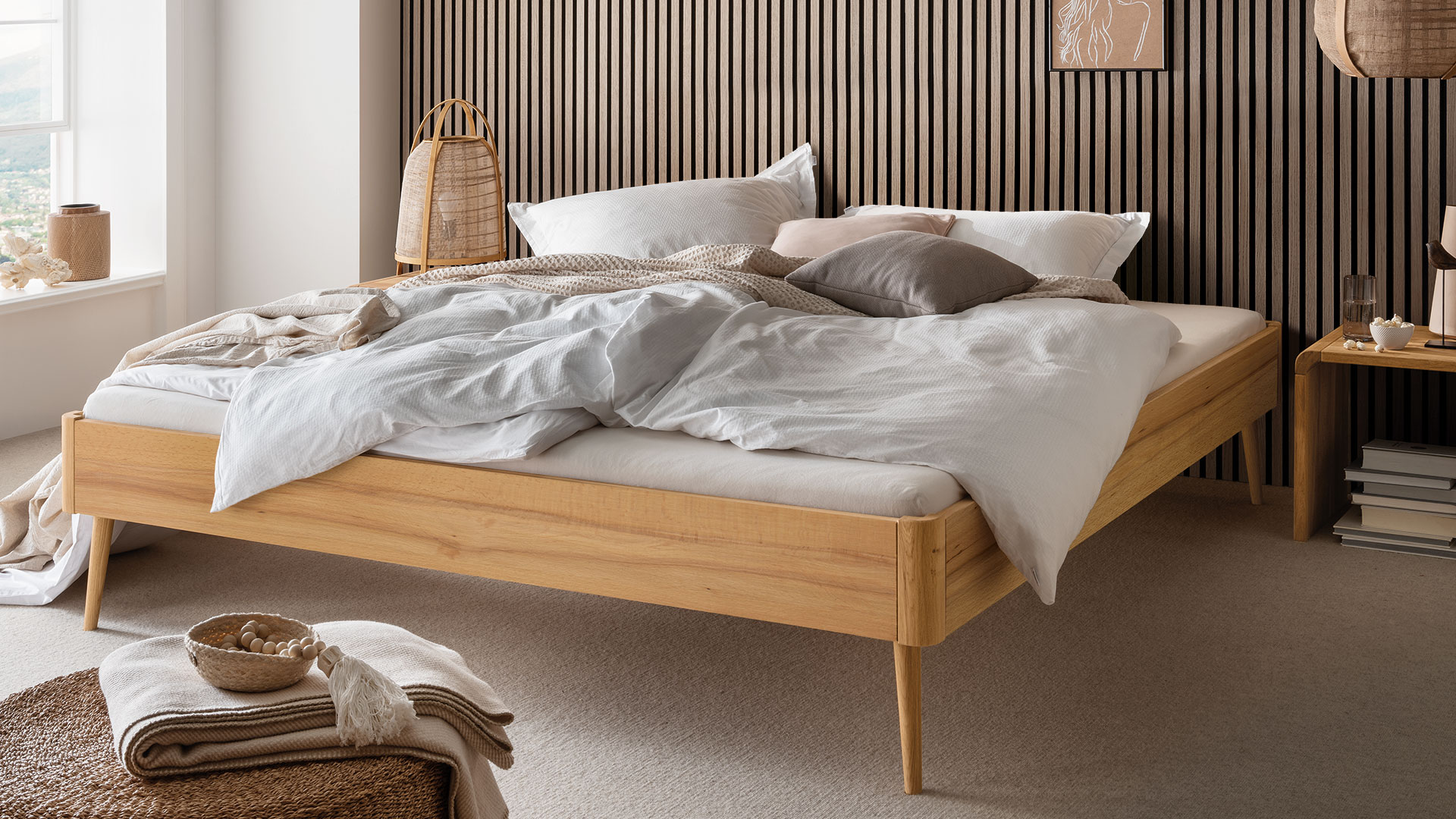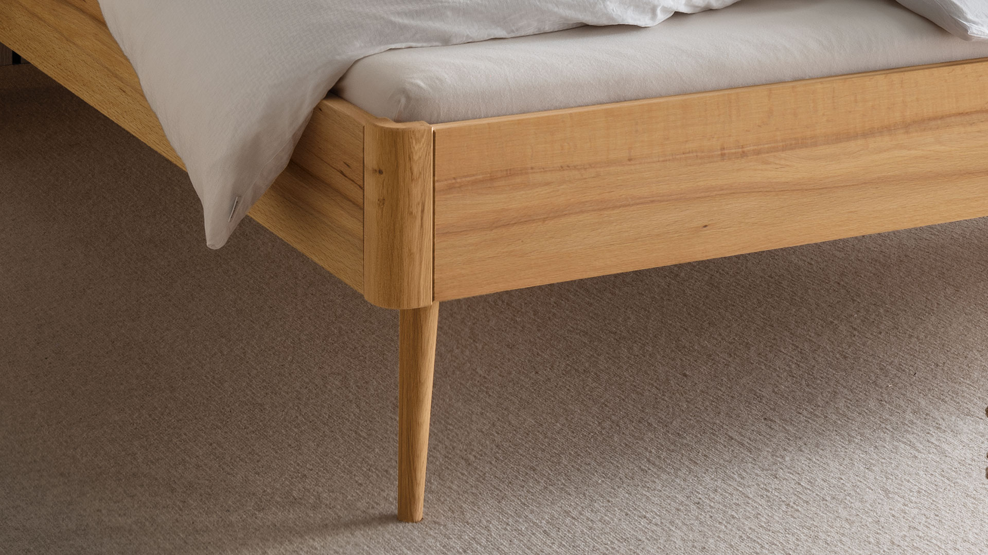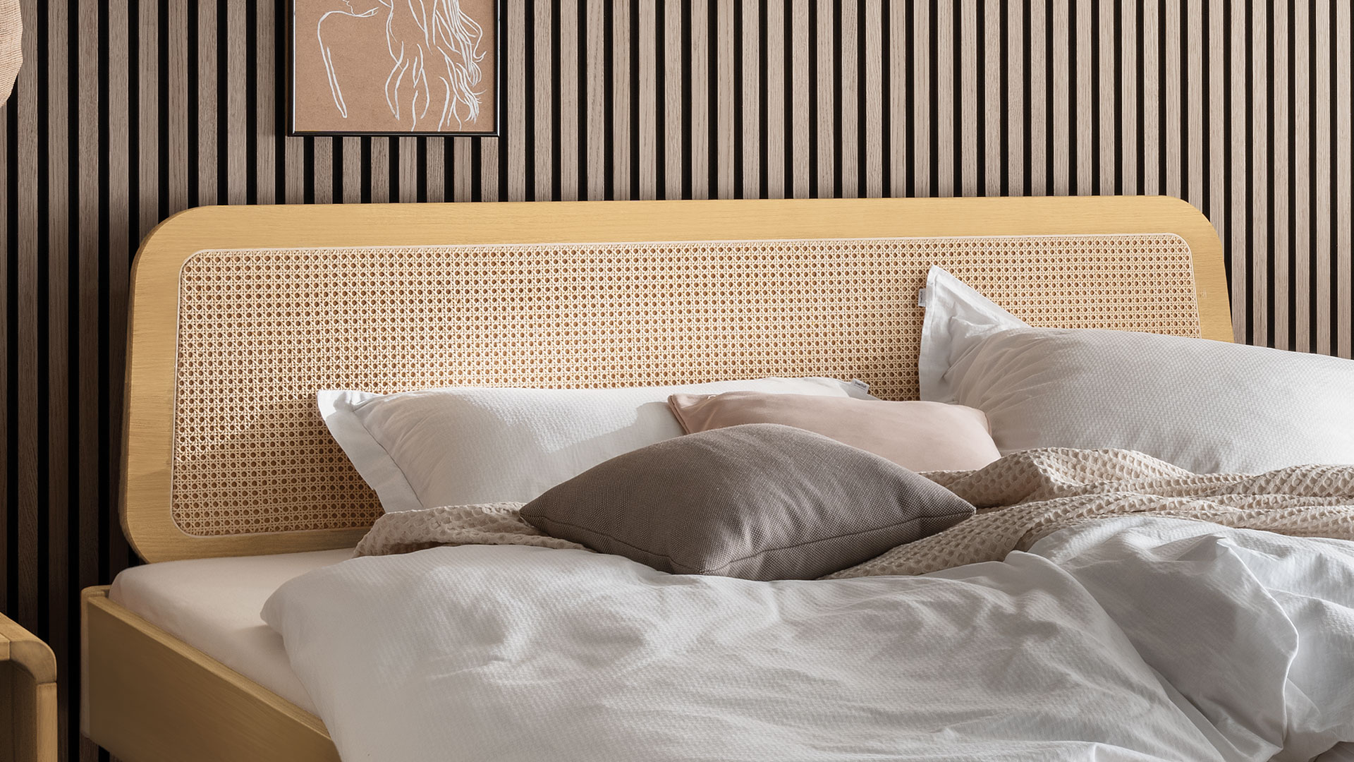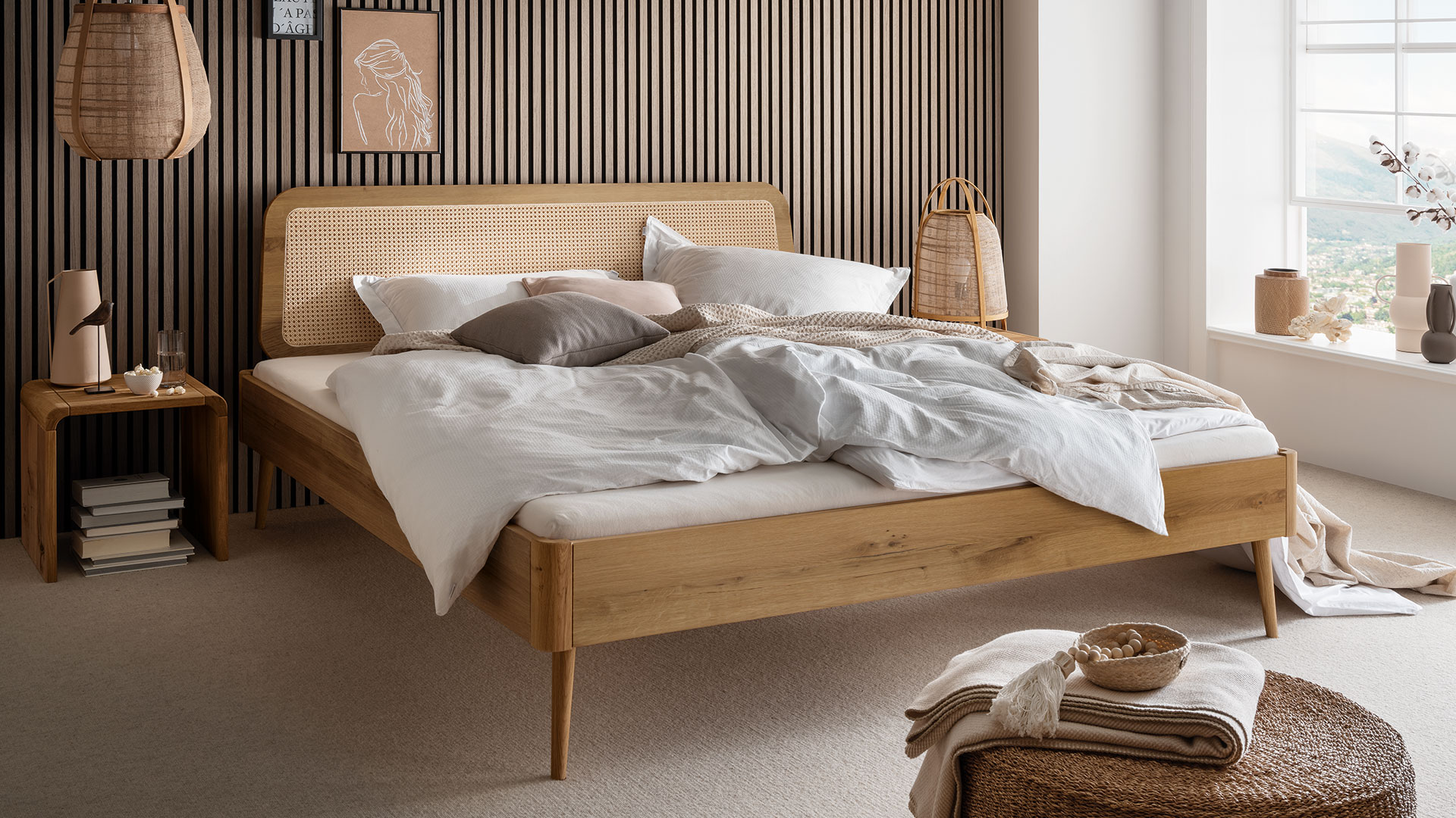 Je nach Lust und Laune kann das Kopfteil unkompliziert gewendet werden. Auf der einen Seite haben Sie das klassische Wiener Geflecht, auf der anderen ist das Kopfteil aus durchgehendem Massivholz. Was ist Ihr Favorit? Wiener Kaffeehaus-Stimmung oder ein klassisch reduziertes Design? Wenn Ihnen nur der hochwertig gefertigte Rahmen gefällt oder das Bett unter einer Dachschräge stehen soll, ist das auch kein Problem: Das Bett ist auch als Liege, also komplett ohne Kopfteil, verfügbar. Beim Holz haben Sie die Wahl zwischen robuster Buche, eleganter Kernbuche und markanter Wildeiche.