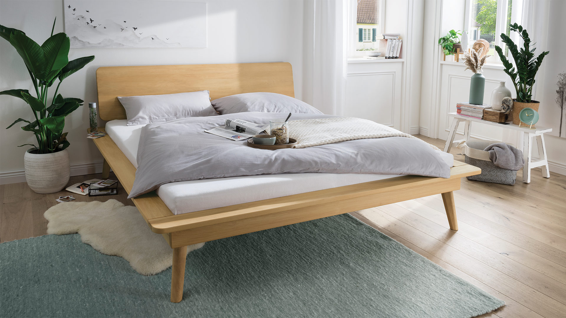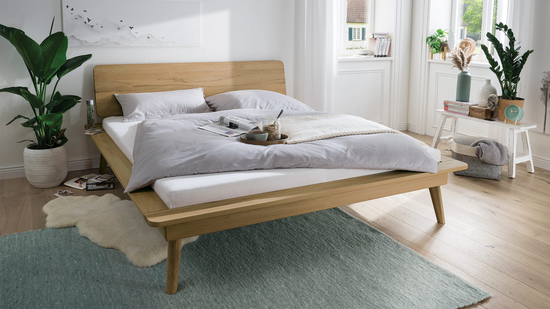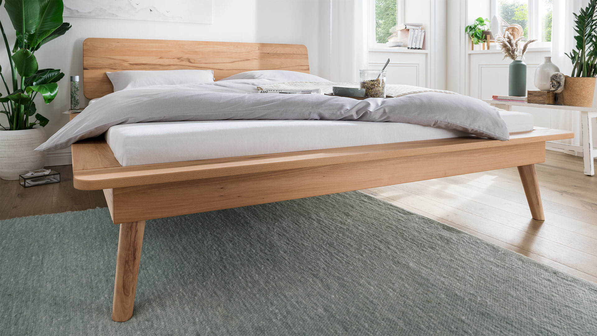 Die breite Umrandung präsentiert stolz die Maserung des edlen Massivholzes, die geringe Stärke verleiht "Zanira" trotzdem ein filigranes Aussehen. Die schräg angesetzten, schlanken und konisch zulaufenden Bettfüße sorgen optisch für eine faszinierende Leichtigkeit.