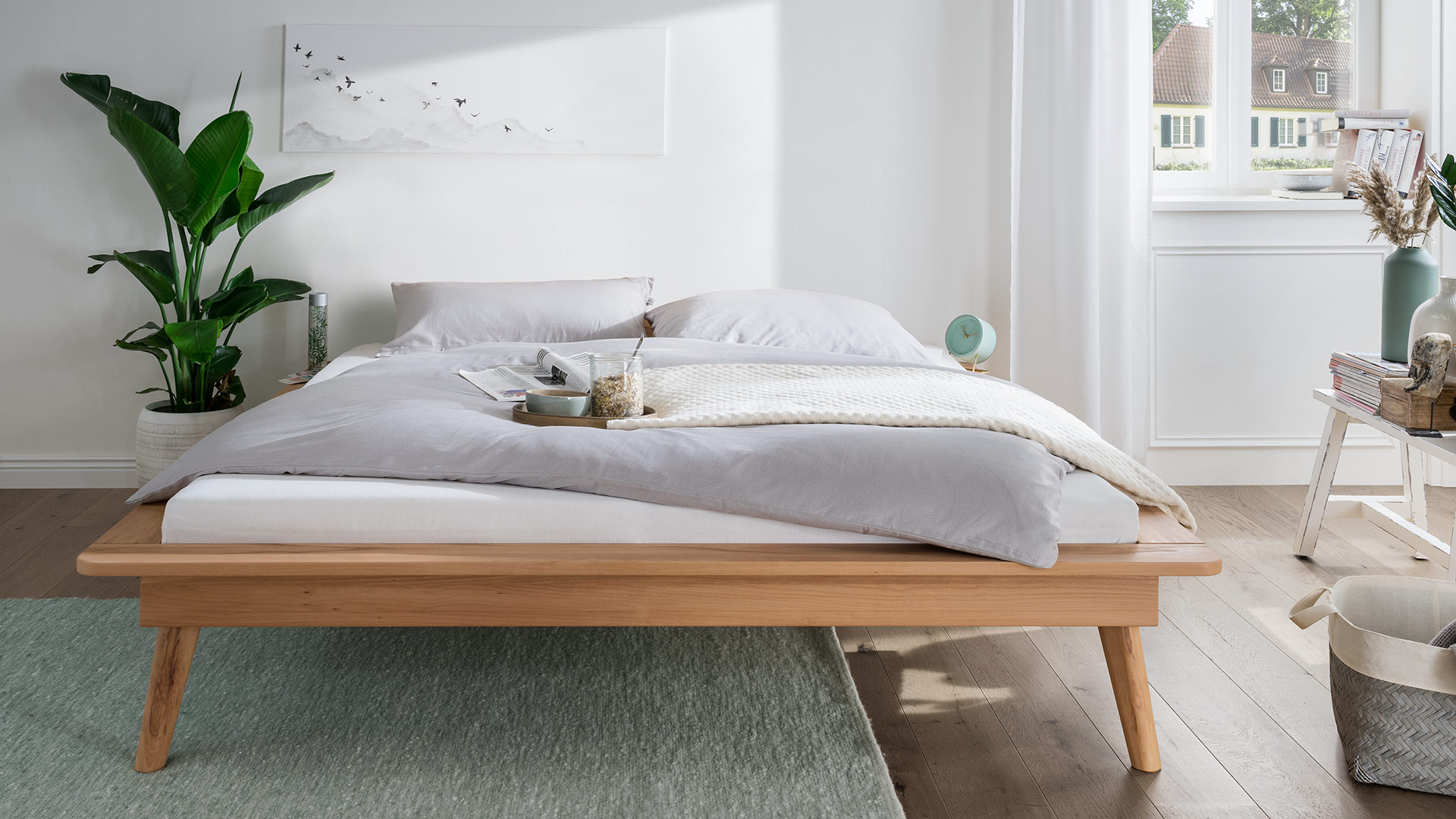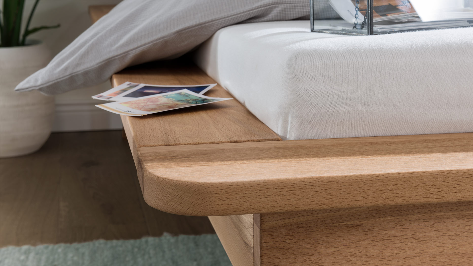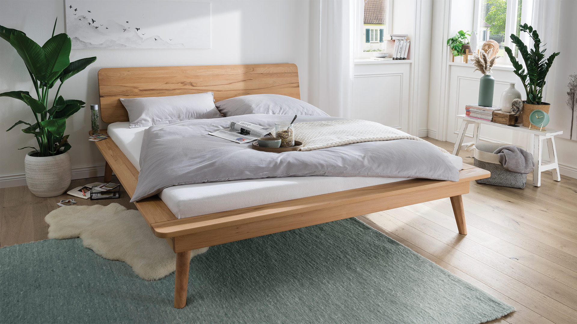 Die breite Umrandung präsentiert stolz die Maserung des edlen Massivholzes, die geringe Stärke verleiht "Zanira" trotzdem ein filigranes Aussehen. Die schräg angesetzten, schlanken und konisch zulaufenden Bettfüße sorgen optisch für eine faszinierende Leichtigkeit.