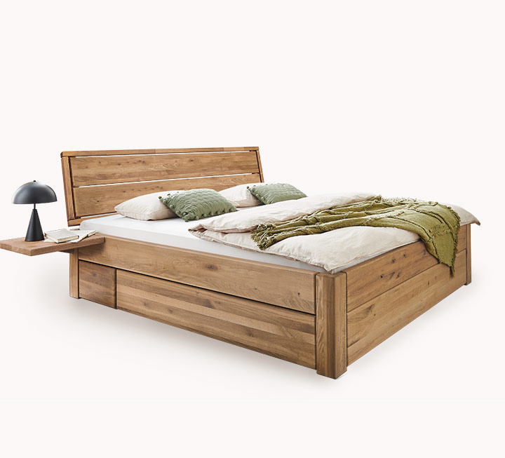 Unsere Betten aus massivem Eichenholz sind zeitlos schön und begeistern durch ihre markante Gestaltung. Eine biologische Oberflächen-Behandlung mit ausgewählten Ölen schützt das edle Holz und gibt ihm einen matten Glanz. Mit wohnlich warmem Massivholz schaffen Sie eine gesunde Atmosphäre mit viel Lebensqualität, in der Sie sich besser erholen und entspannen können. Viele Modelle sind auch in Überlänge erhältlich.