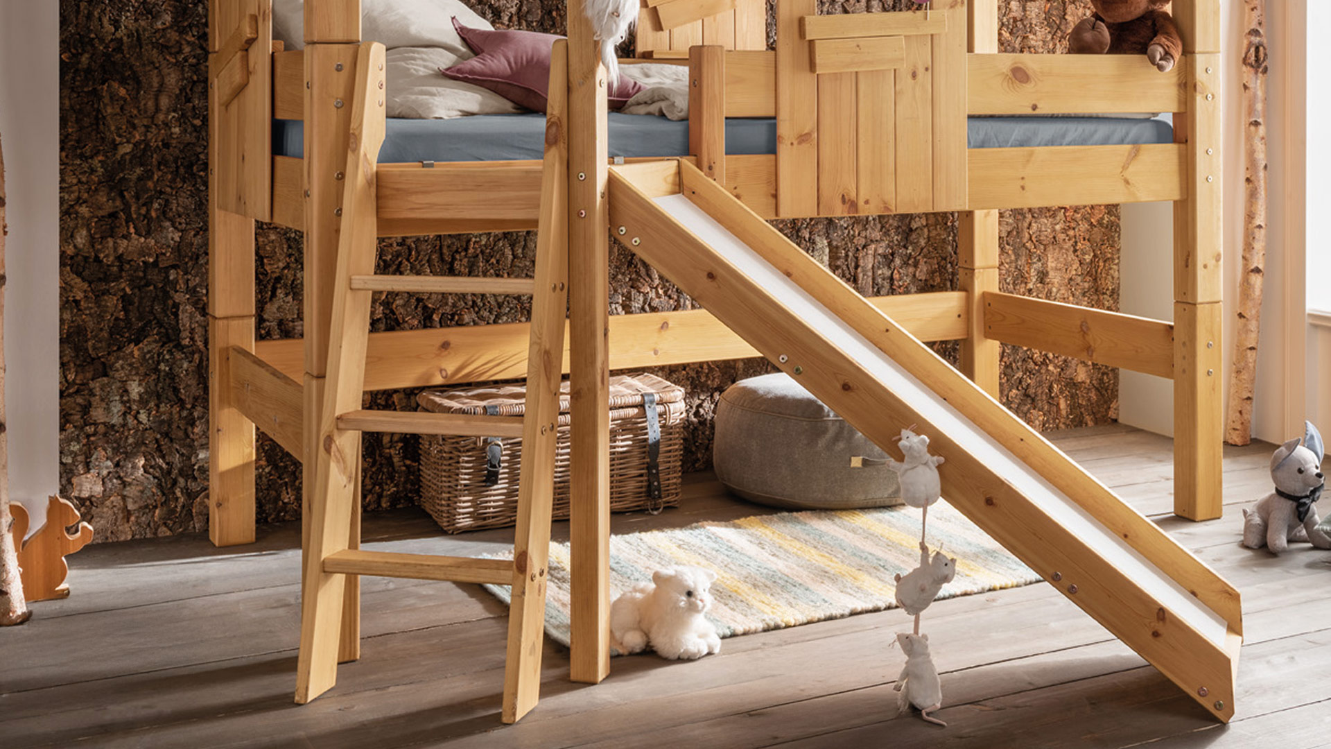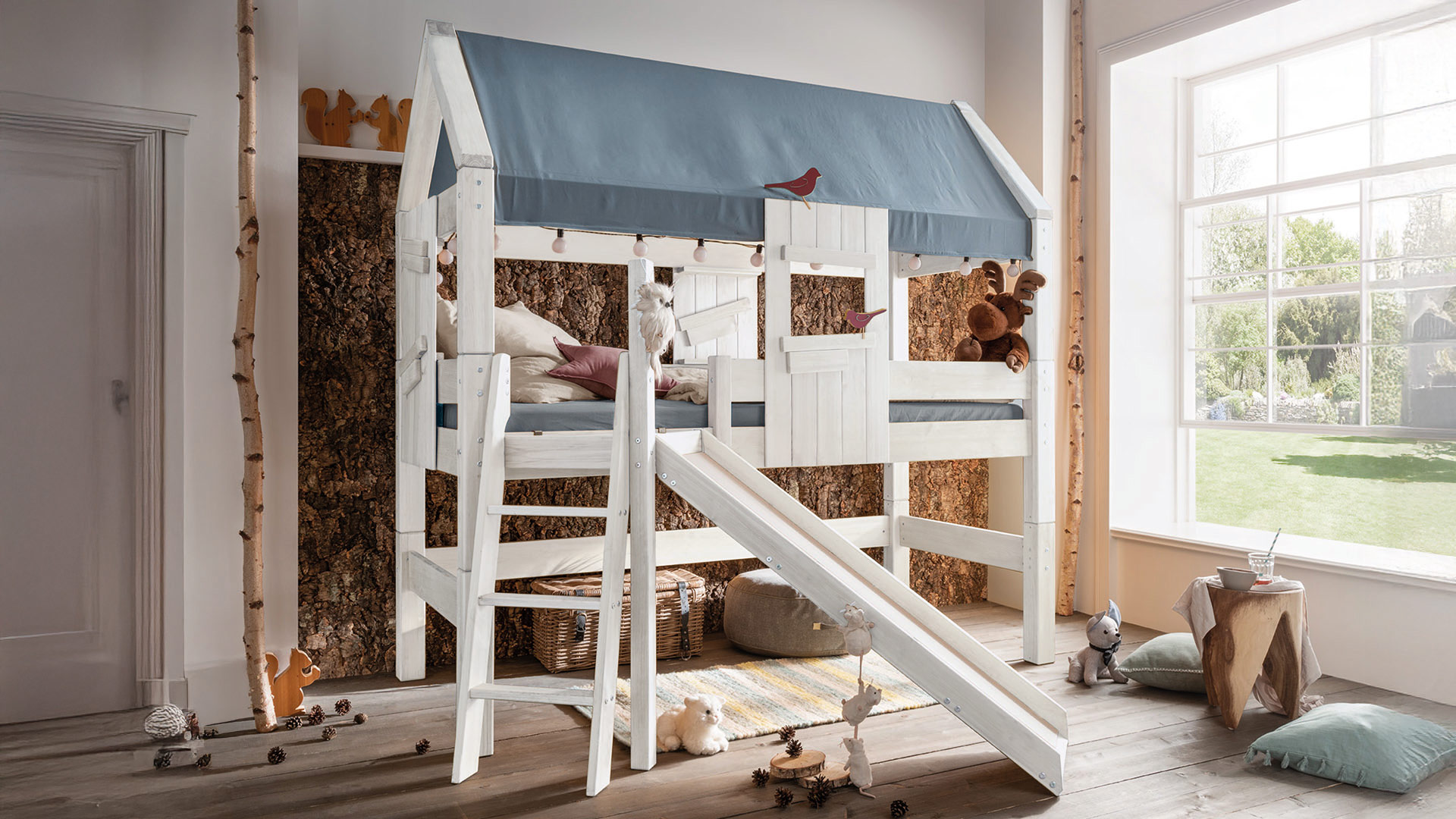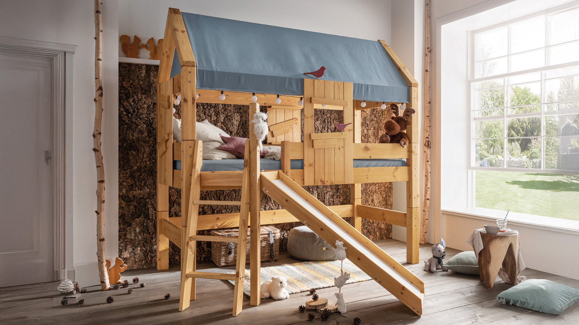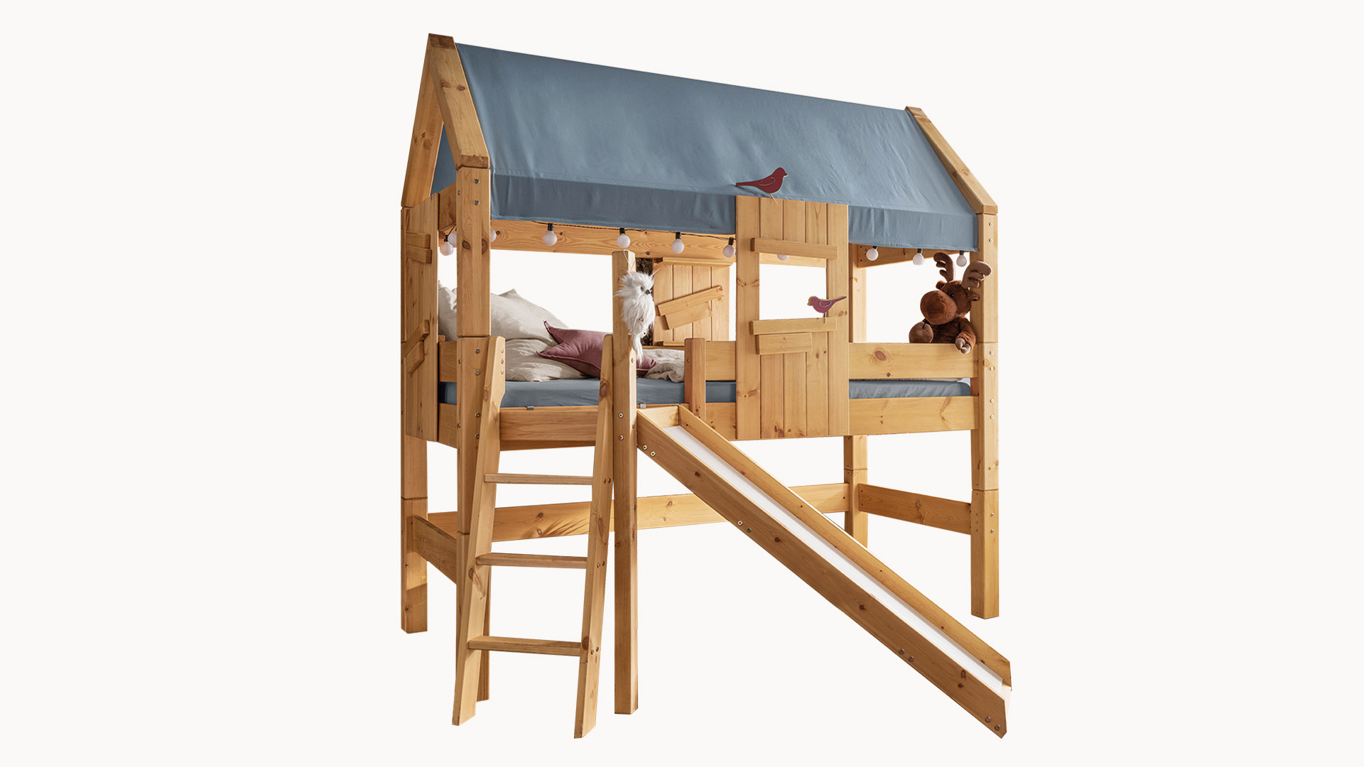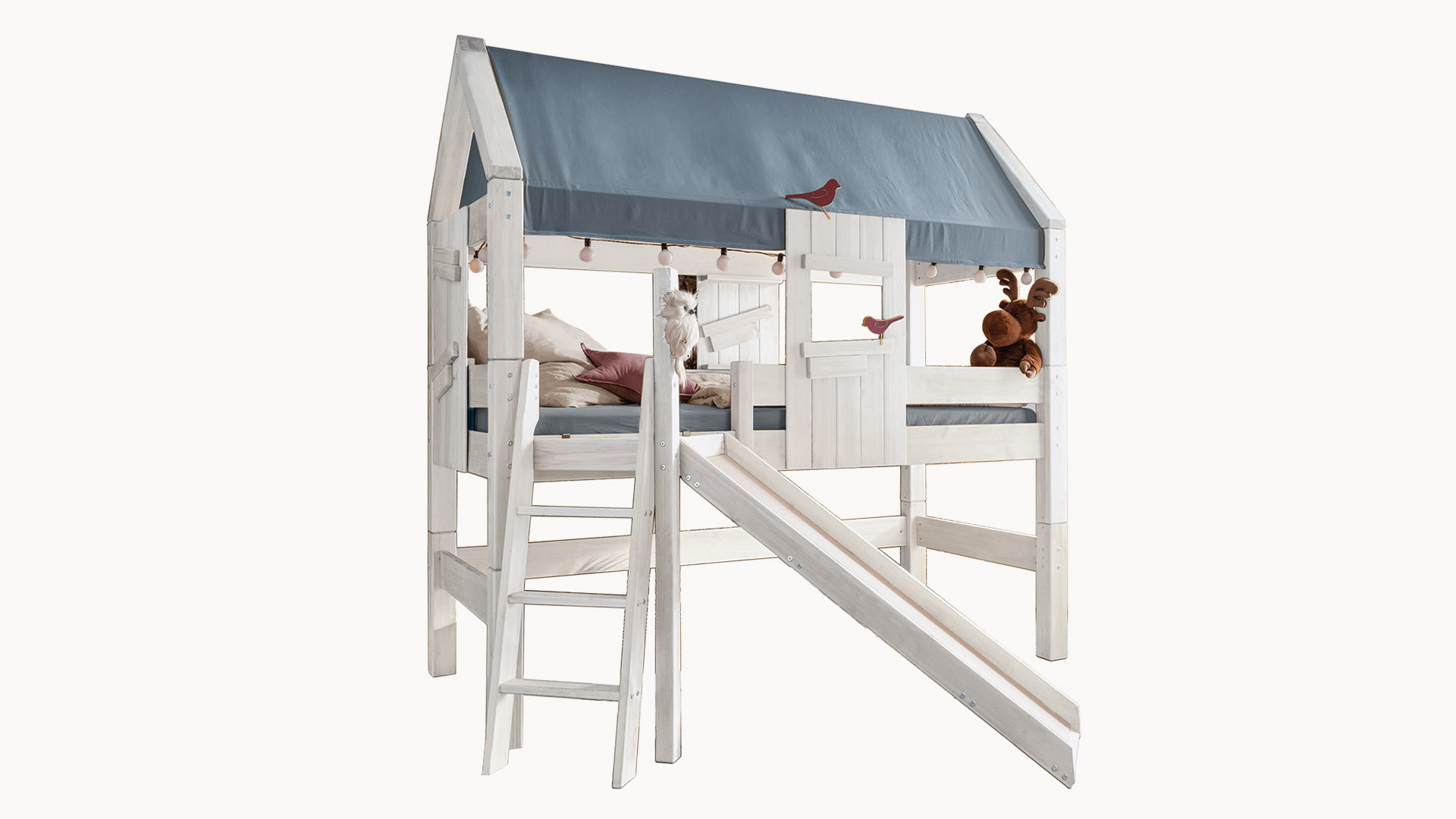 Ein eigenes Baumhaus – direkt im Kinderzimmer. Mit dem Mini-Hochbett "Casalito" wird dieser Kindheitstraum Wirklichkeit. Hinter den kleinen Fensterläden und unter dem schönen Stoffdach warten Geschichten, die nur Ihr Kind erfinden kann. Morgens wird über die Rutsche in den Tag gestartet, nachmittags verwandelt sich das Häuschen in ein Piratenschiff, eine Waldhütte oder ein Märchenschloss.
