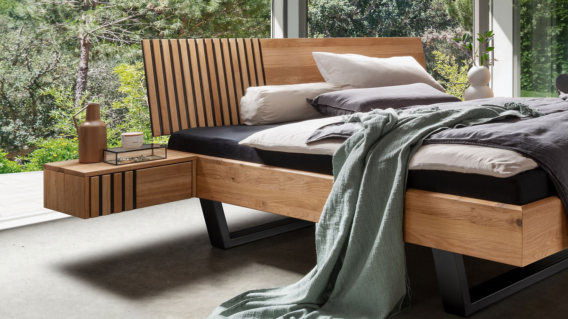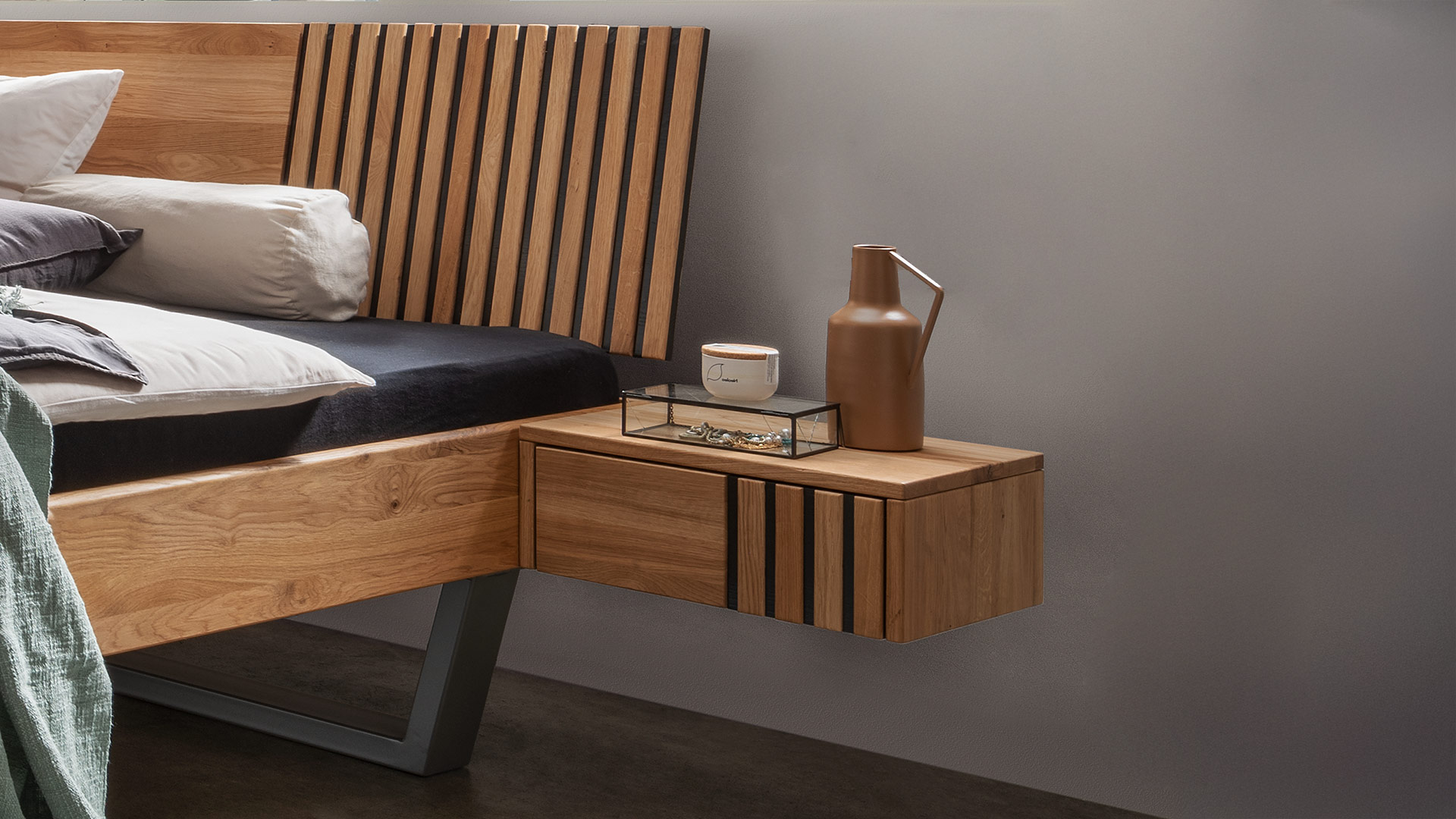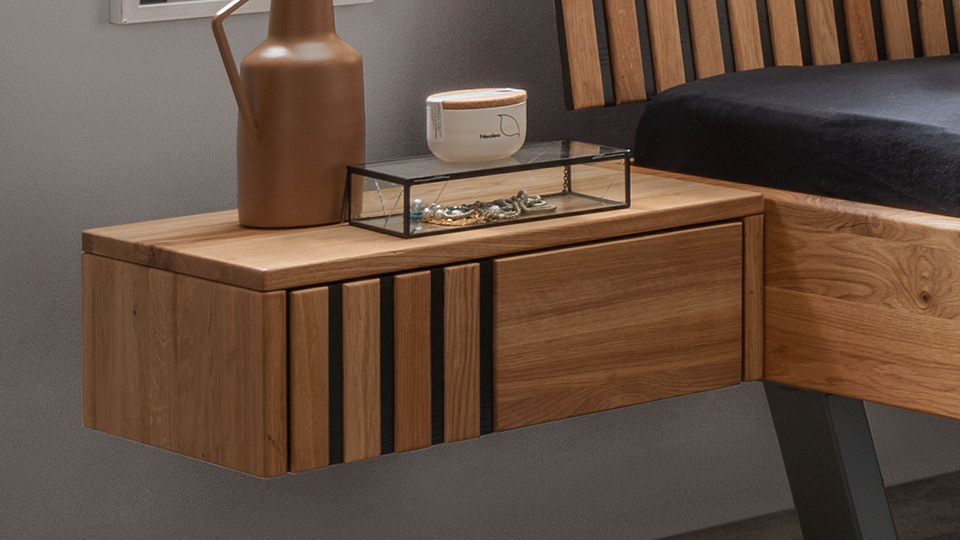 Als perfekte Ergänzung zum Schwebebett "Acustica" darf diese Nachtkonsole aus Wildeiche mit praktischer Schublade nicht fehlen. Dieser attraktive Hingucker verleiht Ihrem Bett durch die elegante Akustikpanel-Optik mit schlanken Lamellen auf dunklem Hintergrund das gewisse Etwas.