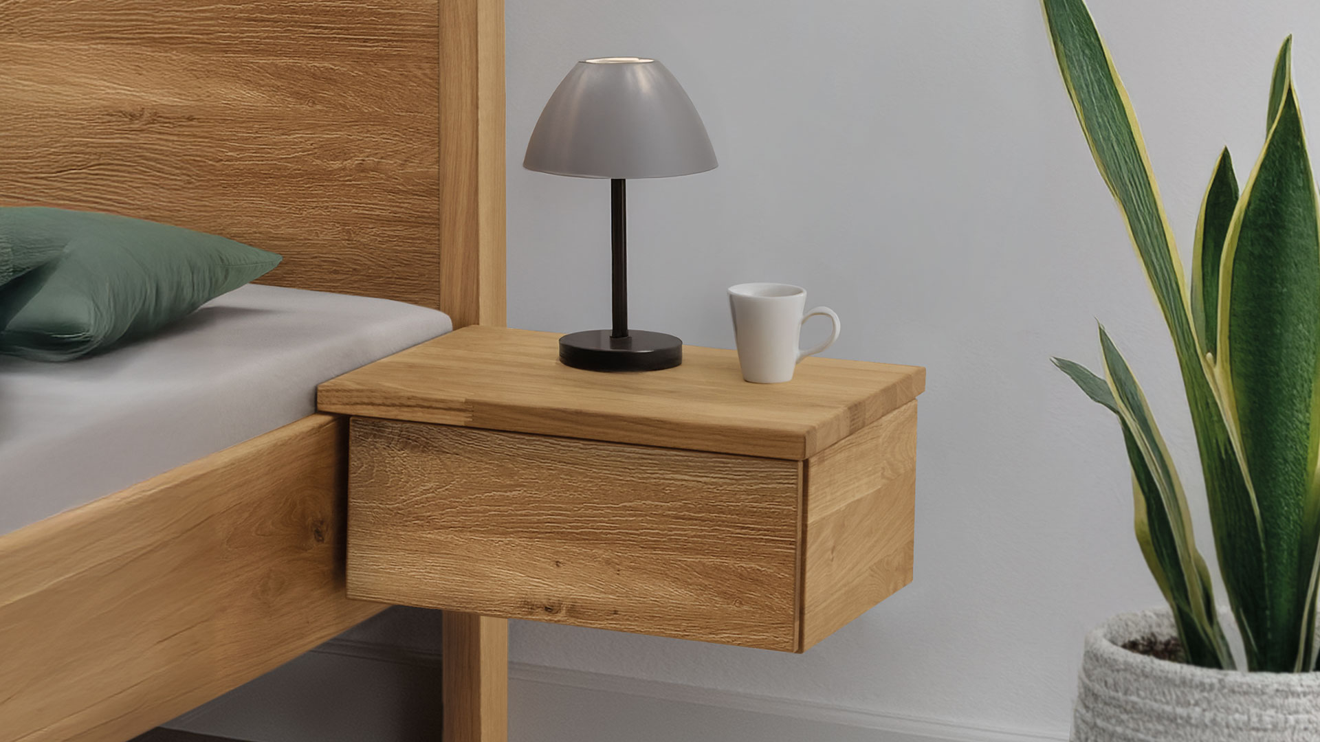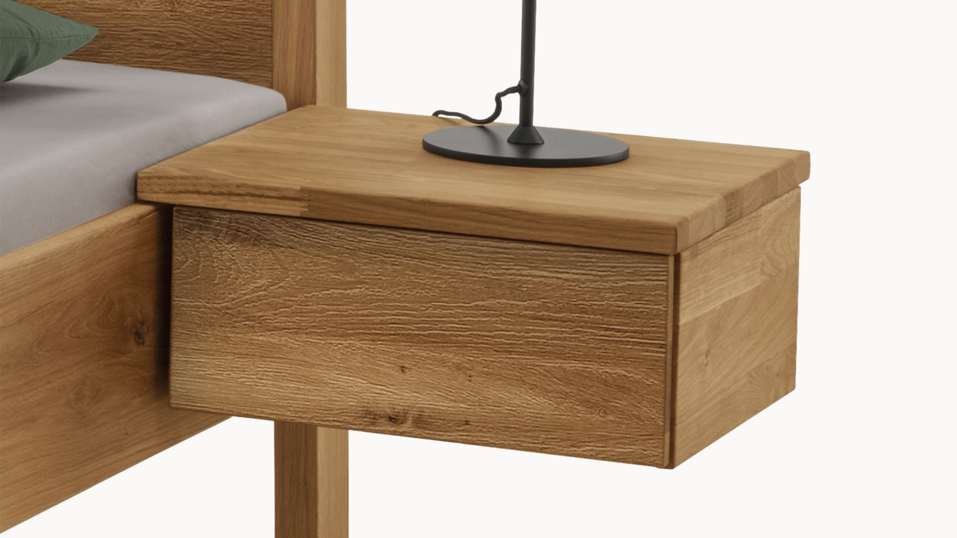Die Nachtkonsole "Capania" ist das perfekte Zubehör für das gleichnamige Massivholzbett. Die praktische Schublade bietet Platz für Dies und Das. Wecker und Nachttischlampe finden auf der Ablagefläche ein neues Zuhause. Die Nachtkonsole ist aus massivem Wildeichenholz gefertigt und hat gebürstete Schubladen-Fronten, die eine natürliche Atmosphäre vermitteln. Die Nachtkonsole "Capania" wird einfach am Bettrahmen befestigt und ist im 2er-Set erhältlich.