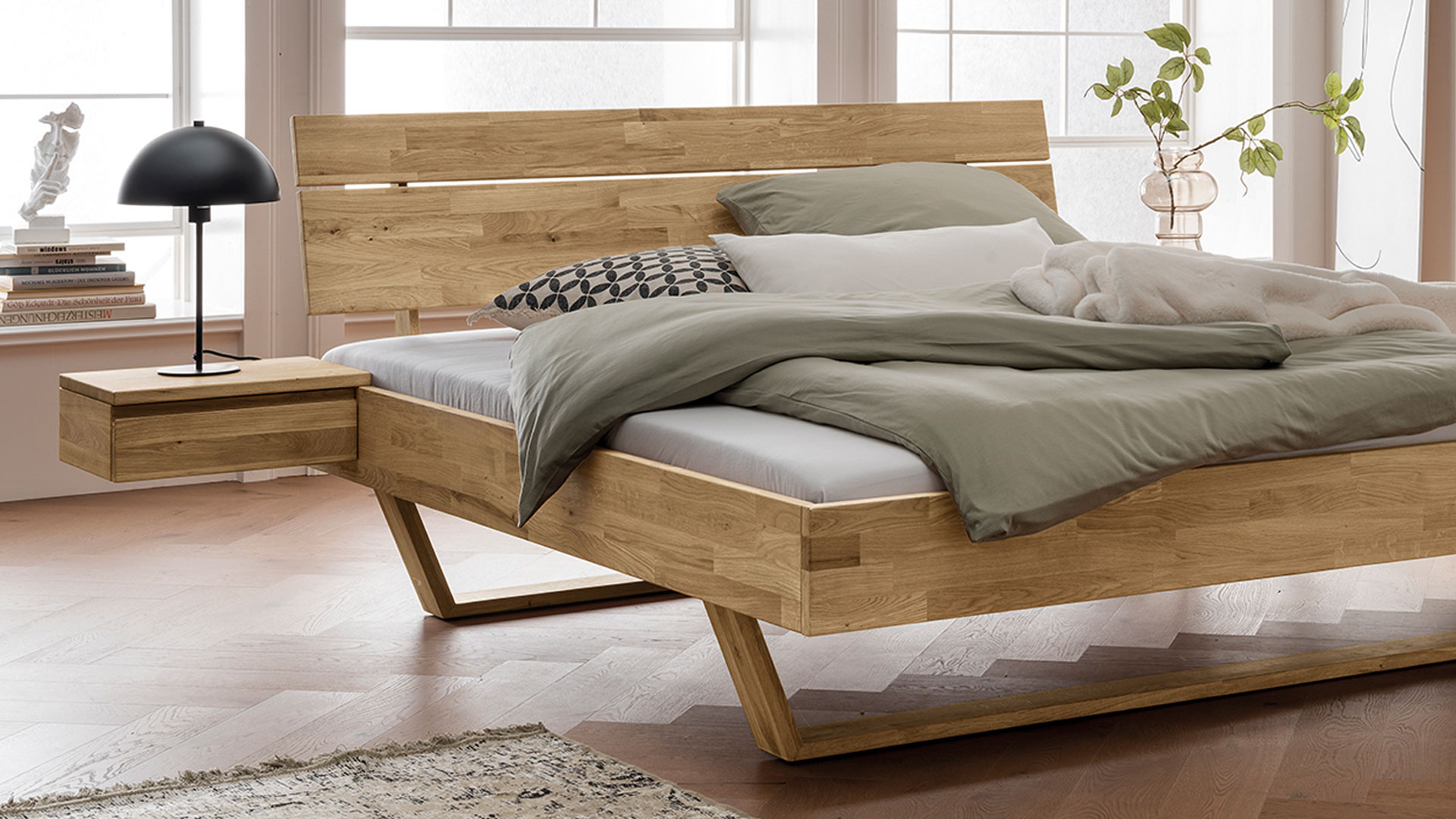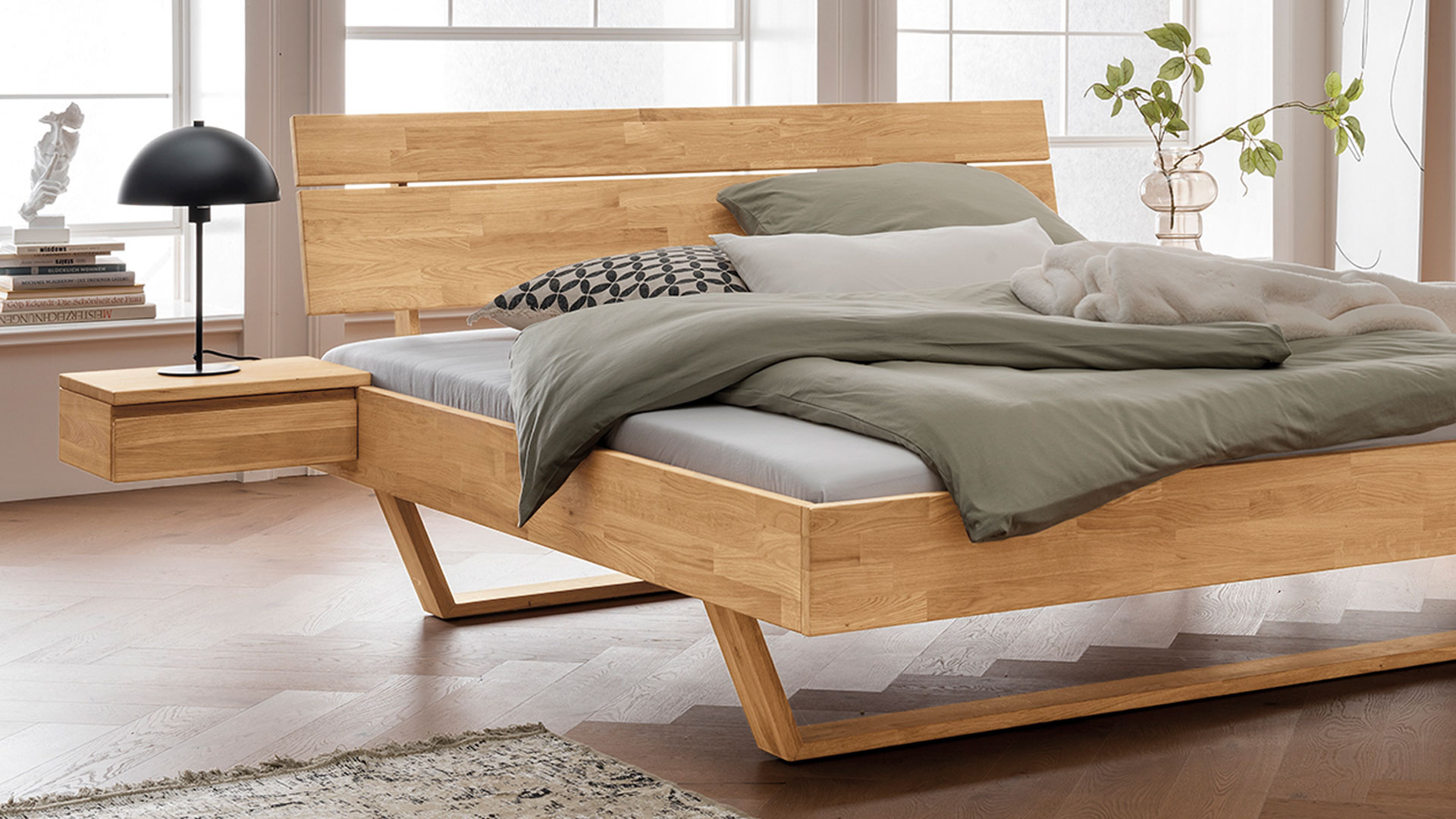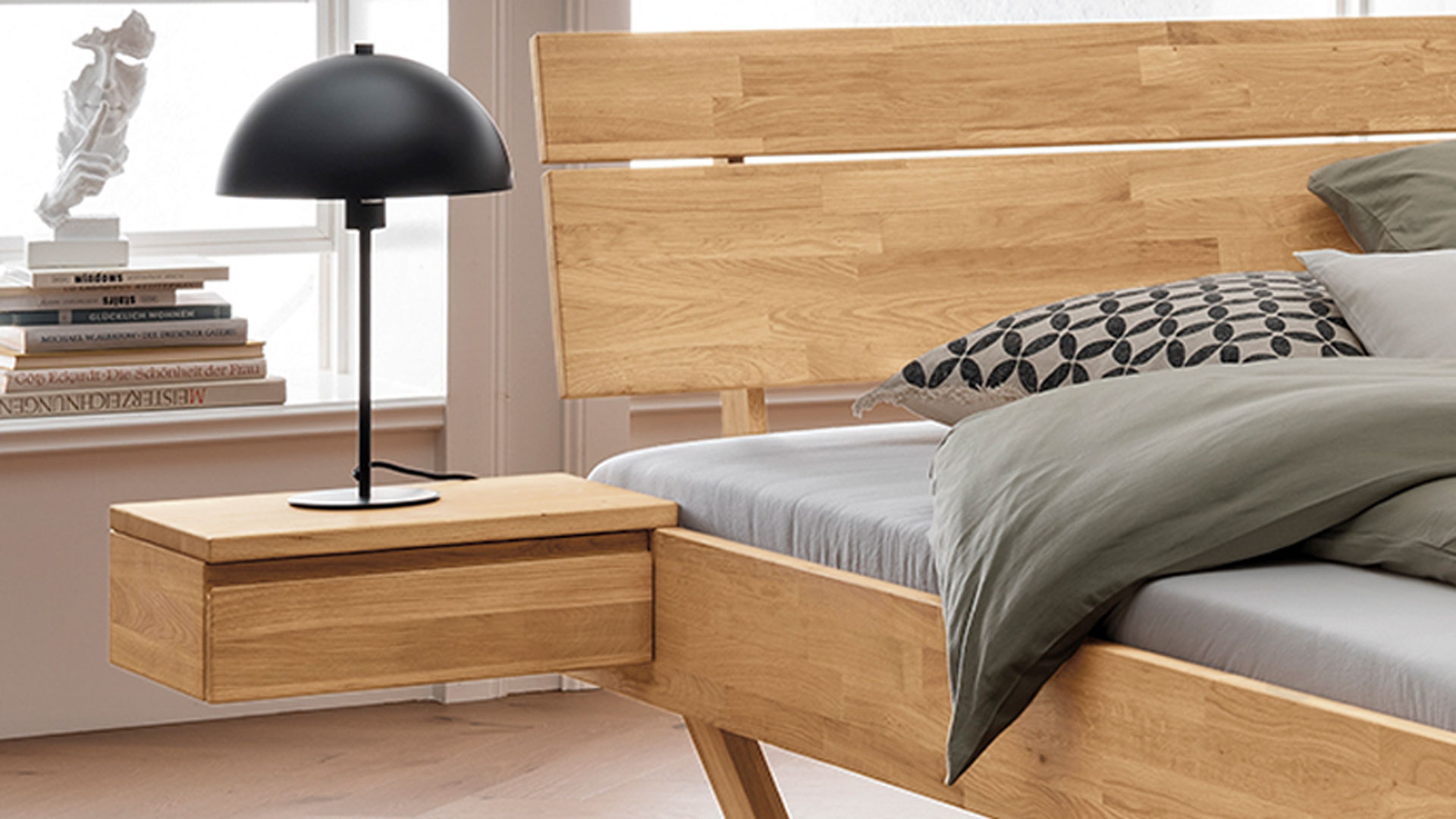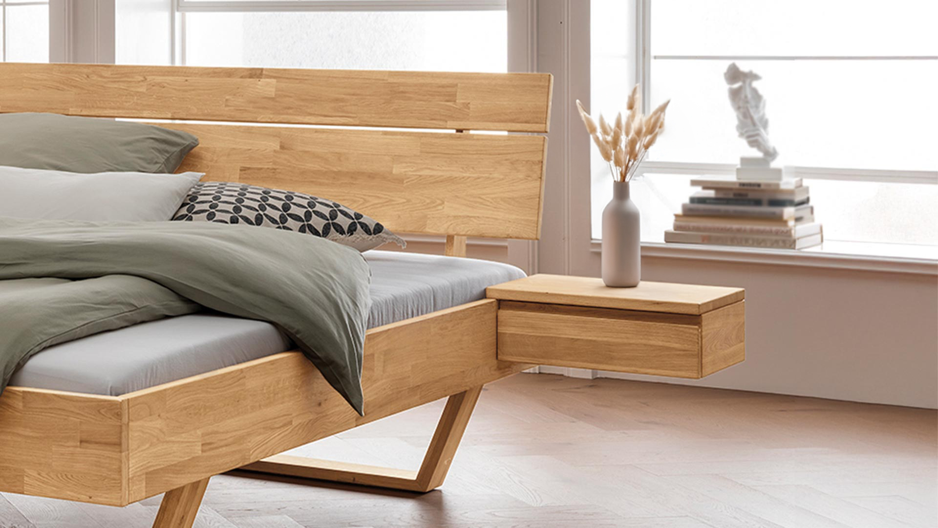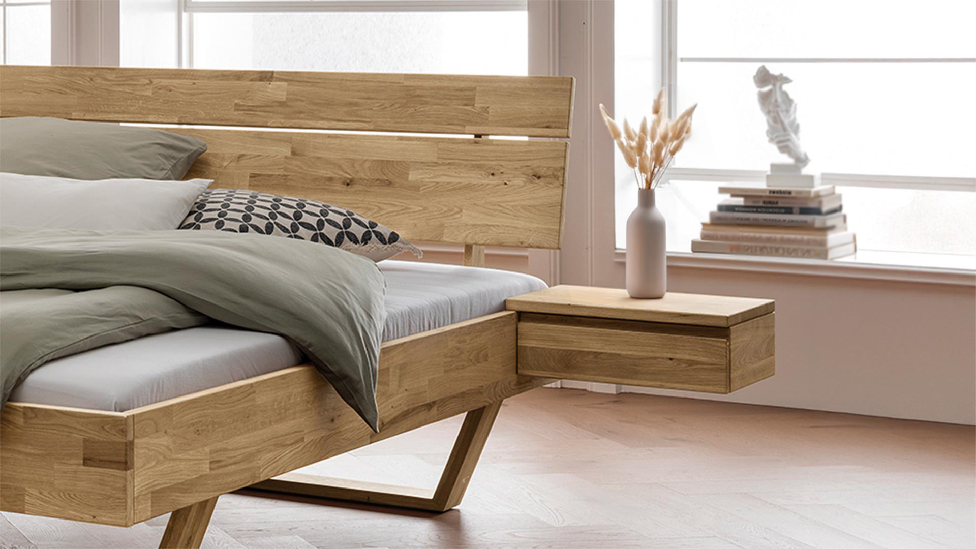 Diese Nachtkonsole erhalten Sie in lebhafter Kernbuche oder edler Wildeiche. Sie ist die perfekte Ergänzung zu Ihrem Schwebebett "Golaro".