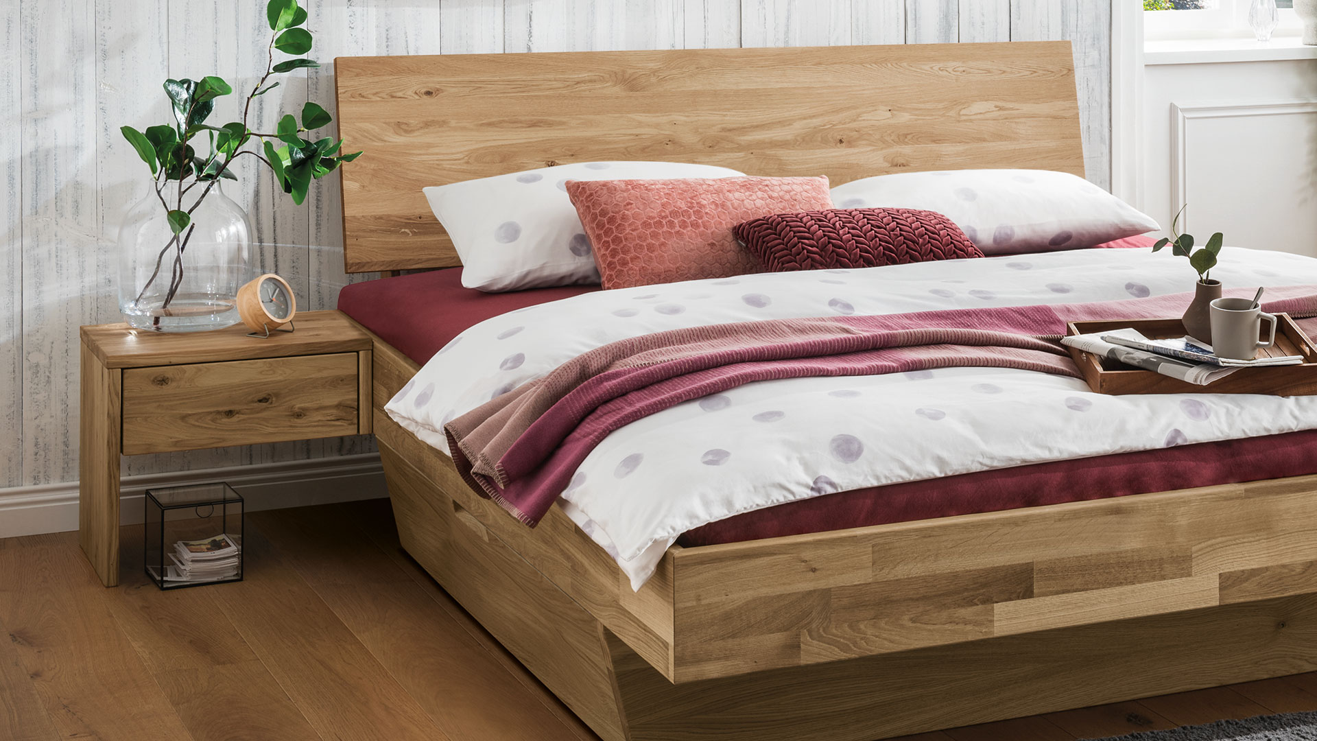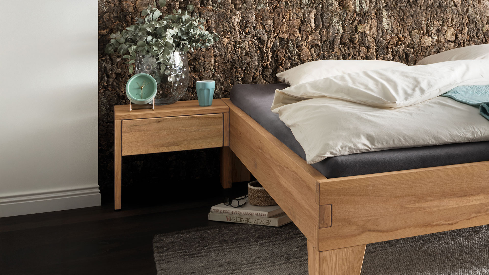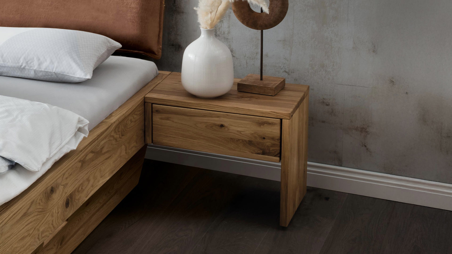 Der schöne Anlehn-Nachttisch wird mit einer Seite stabil am Bettrahmen befestigt. An der anderen Seite steht er fest auf seinem breiten Standbein. Die geräumige Schublade ist grifflos mit Tipp-on-Funktion gestaltet und gleitet auf sanften Druck heraus.