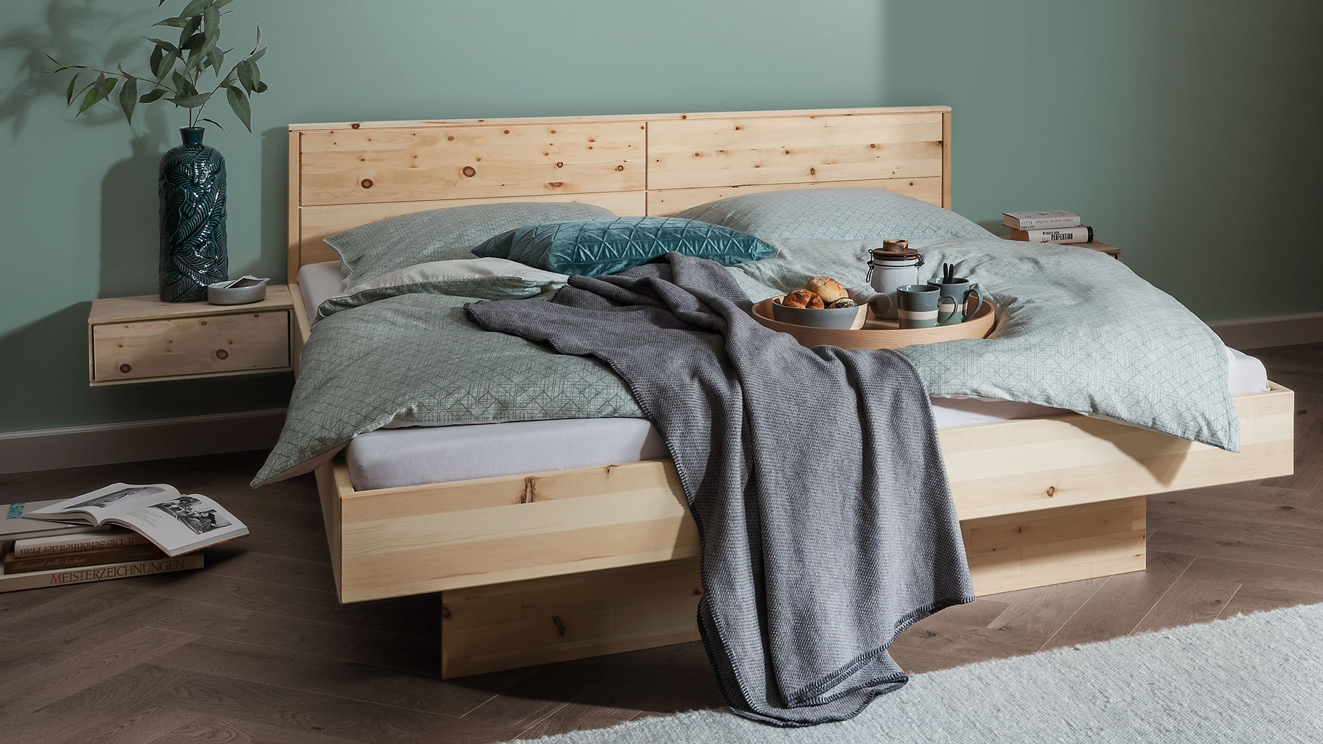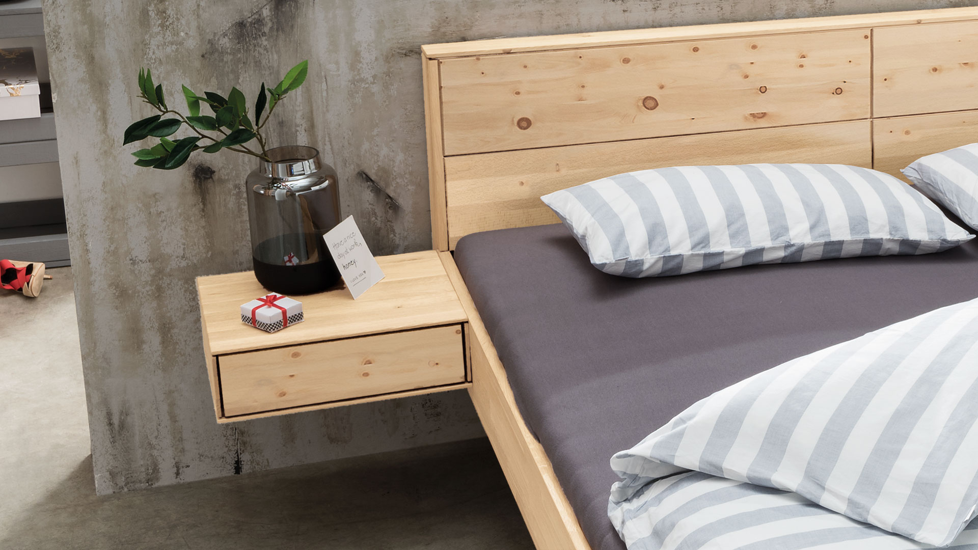 Die perfekte Ergänzung zu Schwebebett "Cervino" ist dieser schöne Hänge-Nachttisch. Die praktische Schublade mit komfortabler Tip-On-Funktion braucht keinen Griff, sondern öffnet bereits auf leichten Druck. Auf der geräumigen Ablage ist genügend Platz für Wecker und Lämpchen.