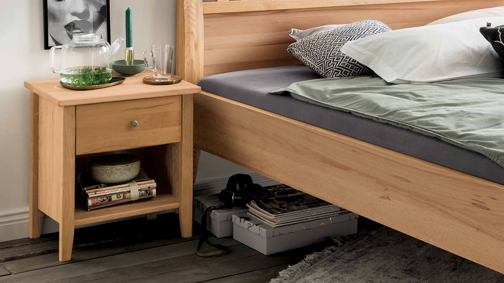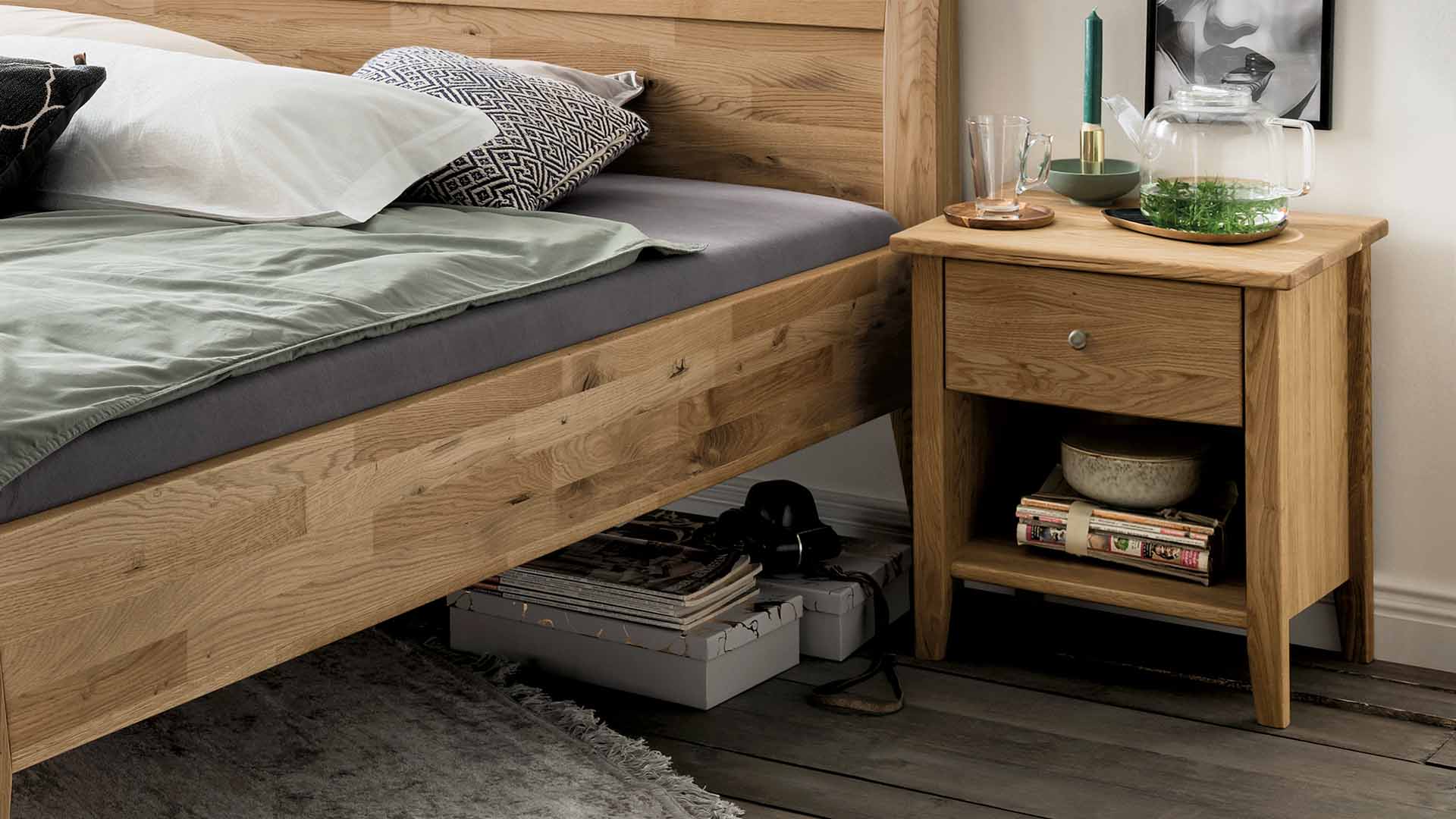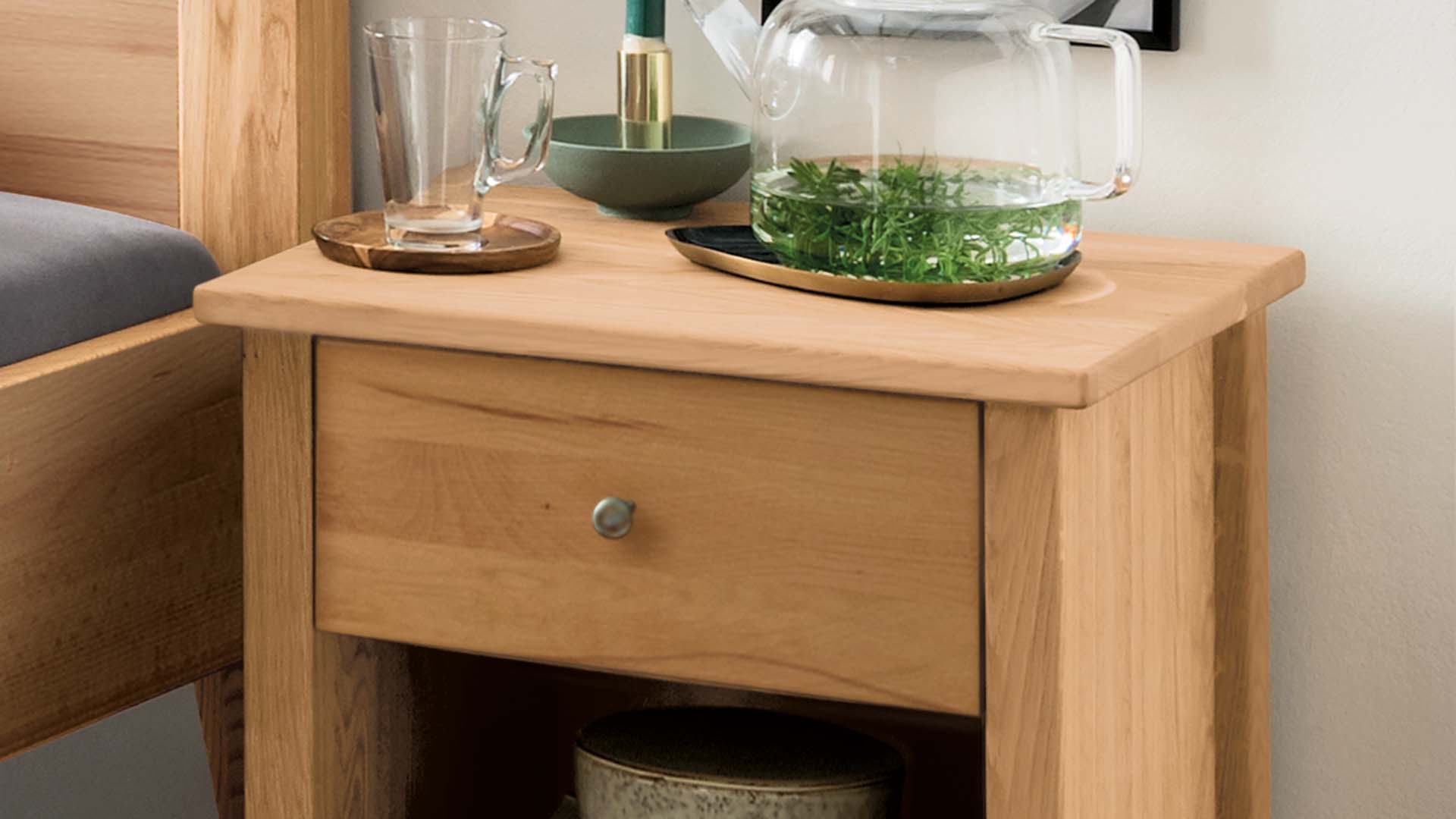 Nachttisch "Divina" passt mit seinem eleganten Design nicht nur zum gleichnamigen Bett, sondern zu vielen Modellen aus Kernbuche oder Wildeiche. Die leicht überstehende Tischplatte, die sich verjüngenden Füße und der hübsche Knopfgriff aus Metall betonen die klassische Linie. Eine Schublade und ein praktischer Zwischenboden lassen keine Wünsche offen.