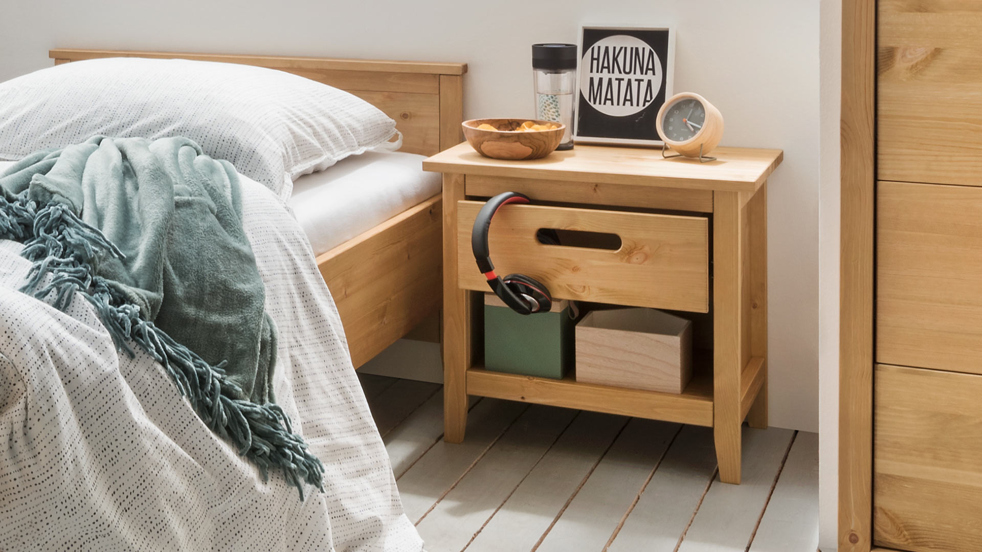 ...ist der attraktive Nachttisch "Lucena". Dieser nützliche Helfer ist der perfekte Platz für Nachttischlampe, Bettlektüre & Co. In der praktischen Schublade ist noch allerhand Platz für wichtige, aber nicht dekorative Dinge wie z.B. Medikamente und Taschentücher. Perfekte und sinnvolle Ergänzung zu Einzelbett "Lucena".