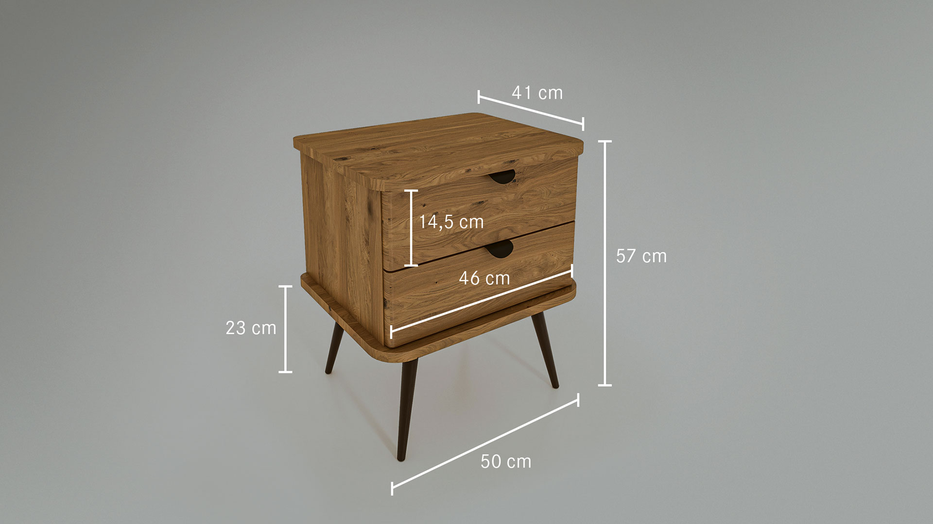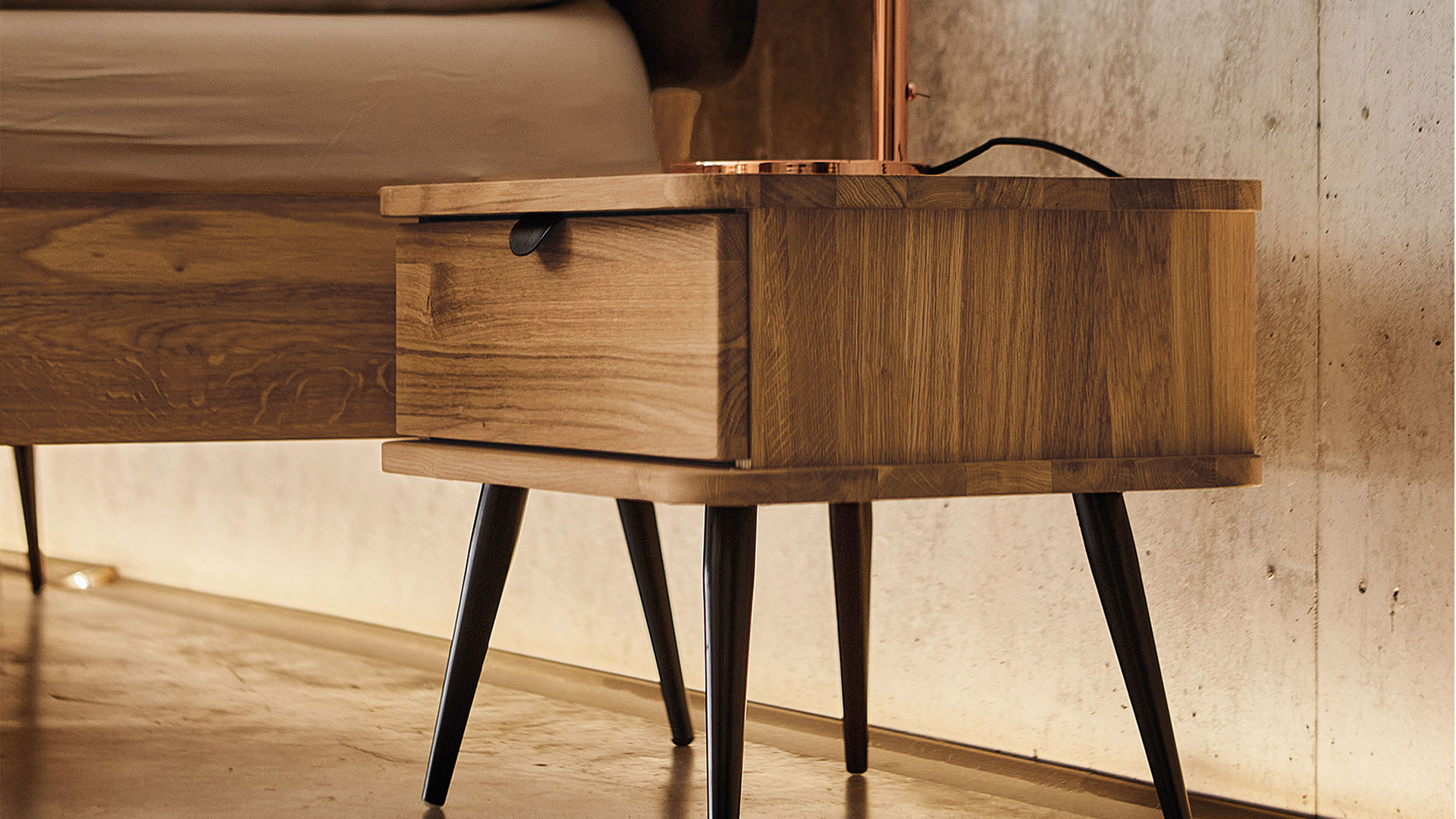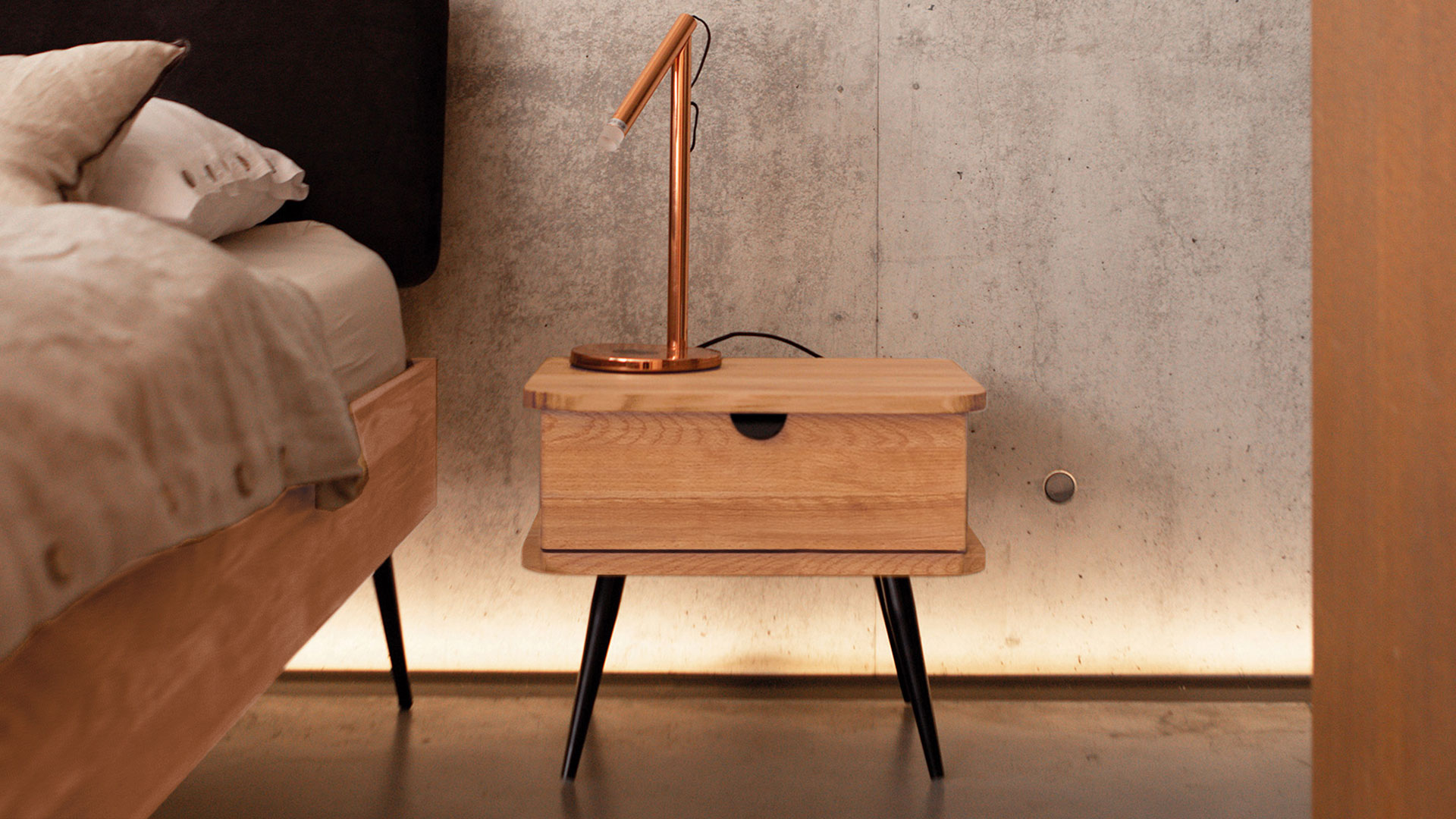Aber nicht nur mit seinen inneren Werten, weiß der Nachttisch zu überzeugen: Der Korpus aus massiver Wildeiche oder Kernbuche hat eine charmant abgerundete Form. Die Griffe und Füße sind aus schwarzem Metall und schaffen so einen interessanten Materialmix. "Ondas" gibt es mit 1 oder 2 Schubladen - je nachdem wie viel Stauplatz Sie am Bett benötigen.