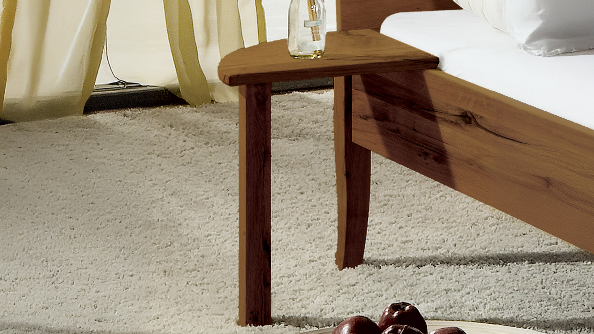 Der Nachttisch sollte zum Bett passen und gut aussehen. Das tut er. Da er nur am Bettrand eingehängt wird, müssen wir allerdings etwas aufpassen, wenn wir beim Beziehen der Betten die Matraze anheben.Nachttisch "Ravenna"