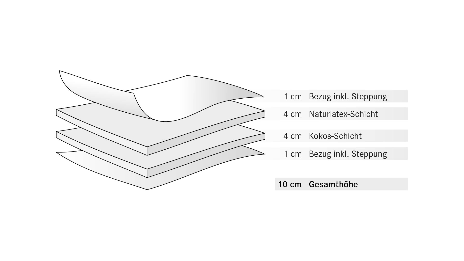 Eine Kernhälfte der Matratze besteht aus einem ca. 4 cm hohen Kokos-Kern, der mit Naturkautschuk latexiert ist. Die Latexierung verleiht dem Kokos zusätzliche Elastizität.
