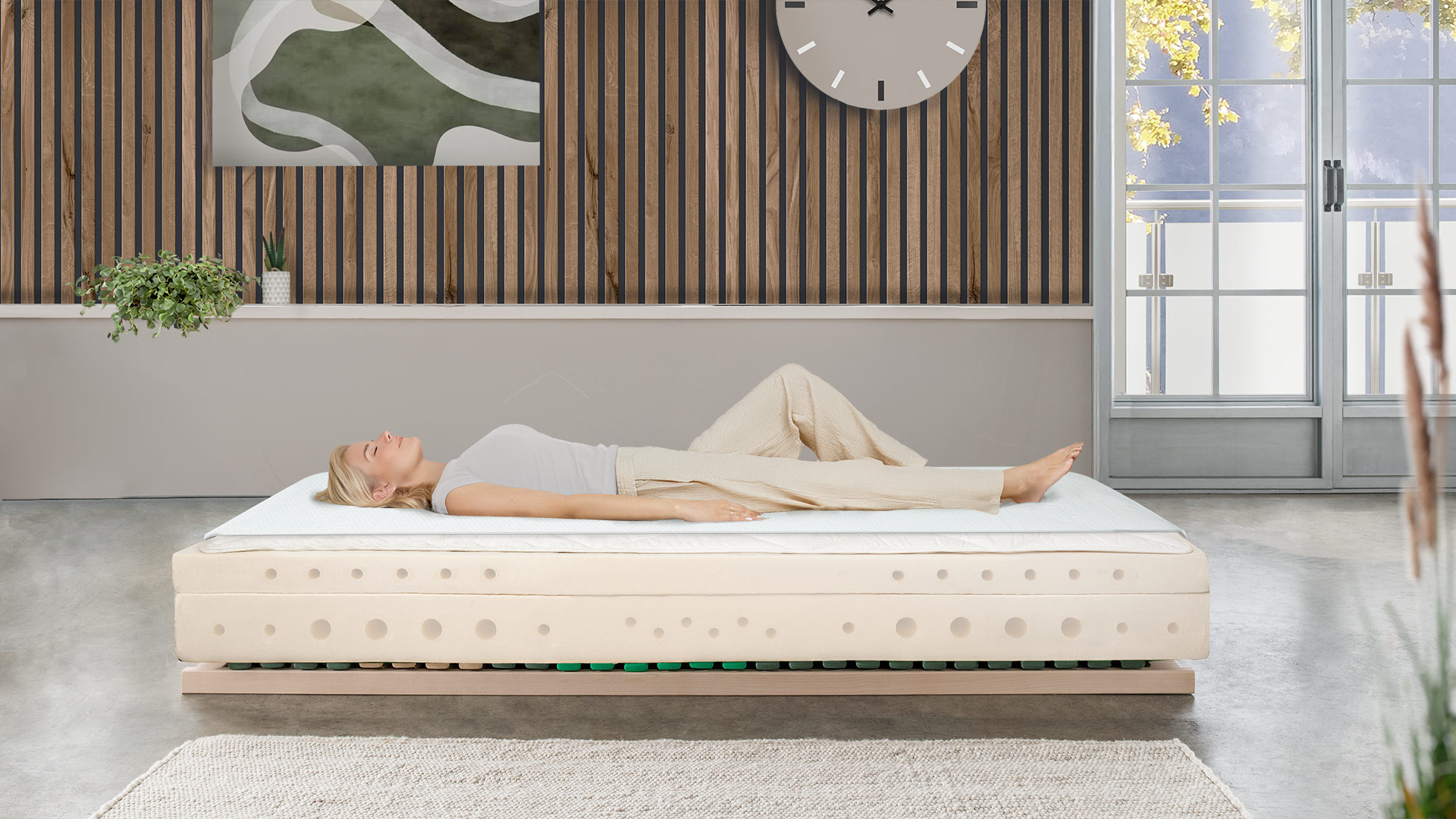 7-Zonen-Stift-Naturlatex aus 100 % Naturkautschuk mit integrierter Schulterabsenkung und Becken-Komfortzone.