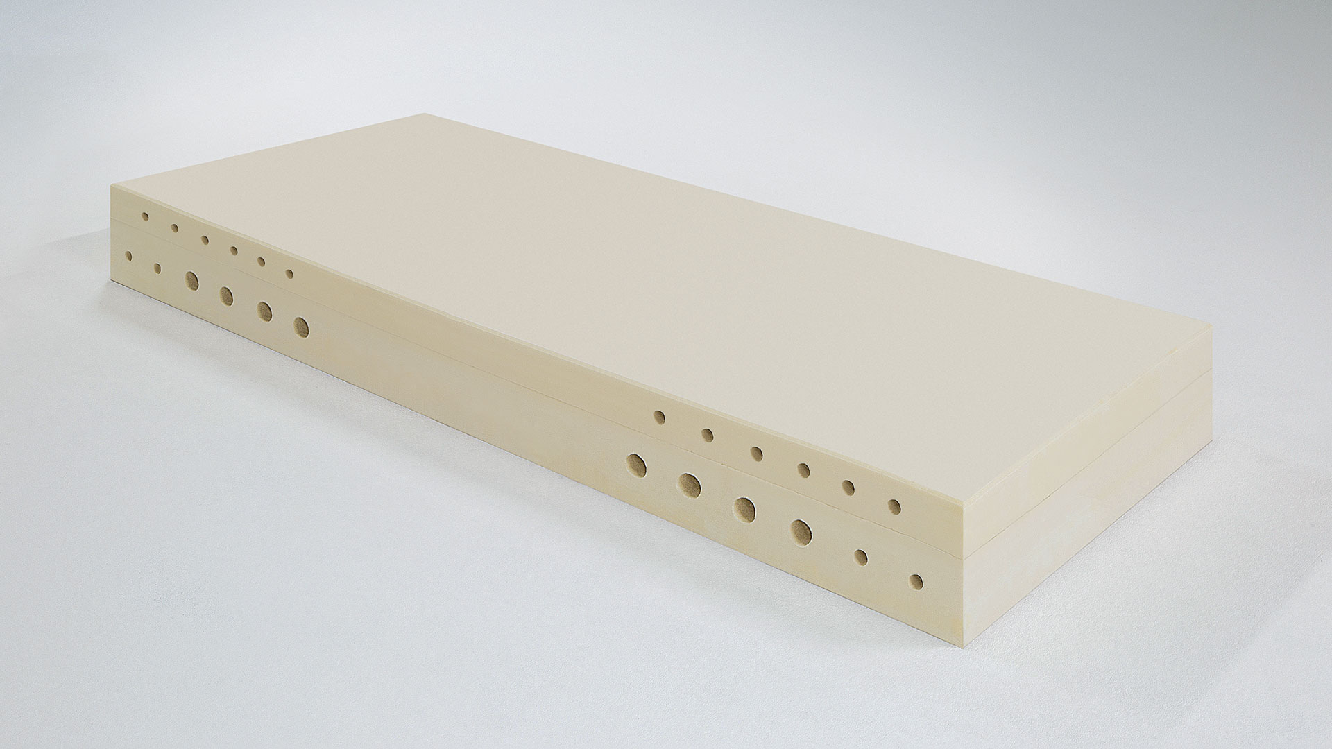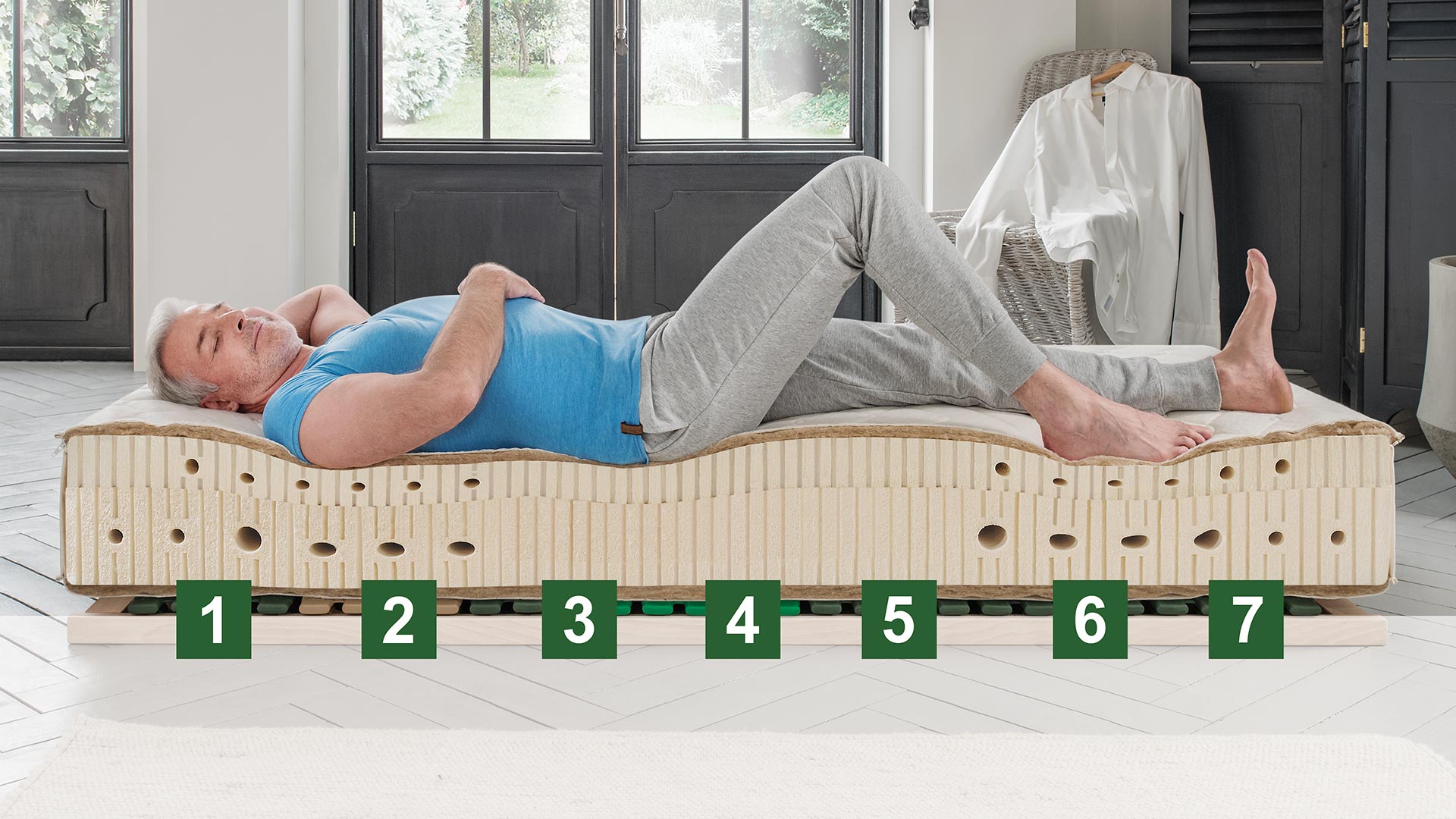 Stiftlatex aus 100 % Naturkautschuk mit 7-Zonen-Körperstützsystem und integrierter Schulterabsenkung. Perfektes, punktelastisches Einsinken des Körpers.