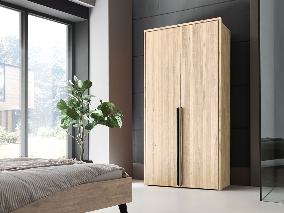 Das massive Wildeichenholz von Drehtüren-Kleiderschrank "Albero" versprüht charmante Natürlichkeit, welche durch die langen Winkelgriffe aus schwarzem Metall stilvoll akzentuiert wird. Wenn Sie einen helleren, moderneren Look bevorzugen, treffen Sie mit der Bianco-Oberfläche die perfekte Wahl - sie lässt den Schrank optisch leichter wirken und sorgt für eine frische, zeitlose Eleganz. Mit der geölten Oberfläche hingegen bleibt die natürliche Maserung des Holzes besonders lebendig und verleiht Ihrem Schlafzimmer eine warme, einladende Atmosphäre.