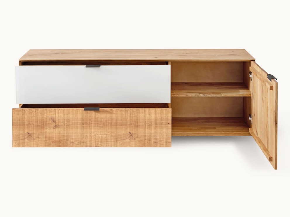 Mit Lowboard "Eterna" verleihen Sie Ihrem Wohnzimmer eine einzigartig charmante Note. Die Hobelschlag-Struktur der Fronten schafft einen eindrucksvollen und ungewöhnlichen Look, der gekonnt von der klassischen Formgebung abgerundet wird. Wenn Sie einen modernen Akzent setzen möchten, entscheiden Sie sich für eine Schublade mit Anthrazitglas oder Weißglas, die sich schön von dem natürlichen Farbton des massiven Wildeichenholzes absetzen.