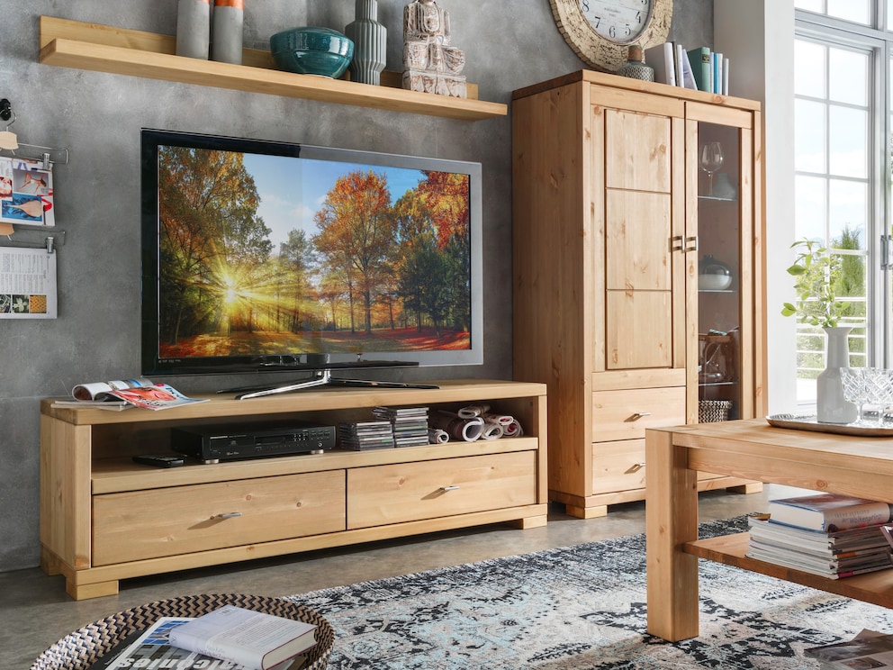 In der Rückwand ist bereits ein praktischer Kabelauslass vorhanden. Zudem können Sie jegliches Zubehör, wie Fernbedienungen, Kopfhörer, DVDs und dergleichen in den 2 geräumigen Schubladen mit Vollauszug verstauen. Die Schubladen des Lowboards "Mascella" lassen sich an formschönen Metall-Griffen öffnen, die vor allem auf der warmen, gelaugt/geölten Oberfläche einen kühlen, metallischen Akzent setzen. Nicht minder attraktiv präsentieren sich die stilvollen Griffe auf der weiß-lasierten Kiefer.