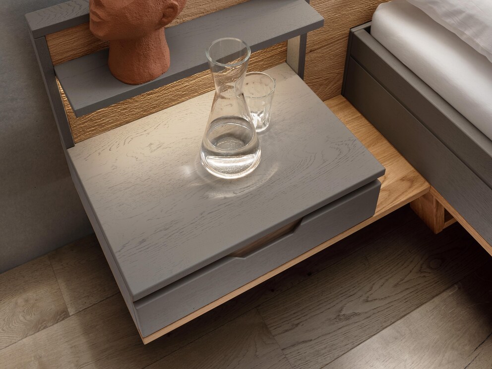 Nachtkonsole Gravia vereint tolle Optik mit praktischem Stauraum direkt am Bett, hier die linke in Grau
