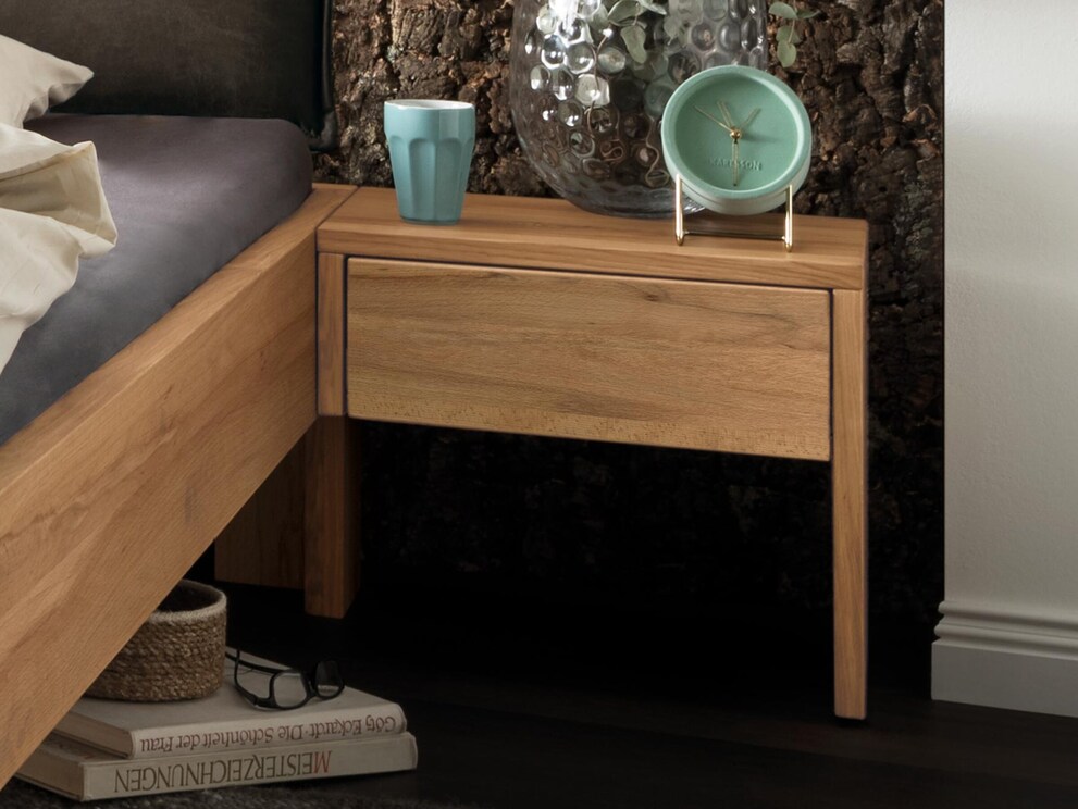 Der schöne Anlehn-Nachttisch wird mit einer Seite stabil am Bettrahmen befestigt. An der anderen Seite steht er fest auf seinem breiten Standbein. Die geräumige Schublade ist grifflos mit Tipp-on-Funktion gestaltet und gleitet auf sanften Druck heraus.