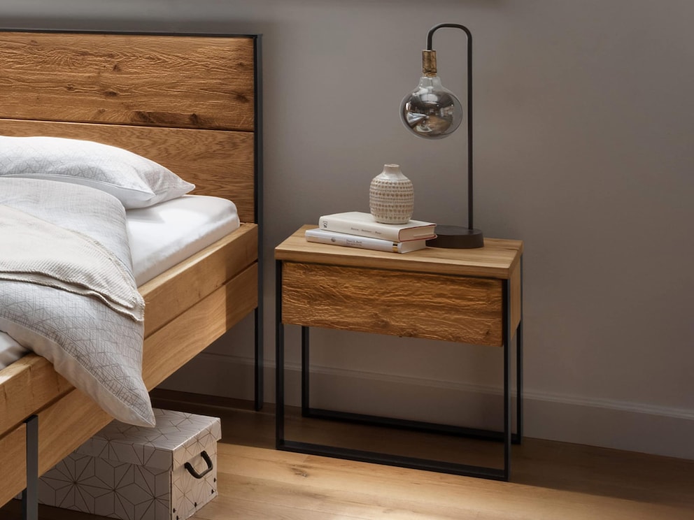 Markant gezeichnetes Massivholz trifft auf kühl schwarzes Metall. Nachttisch "Fira" präsentiert Industrial Design in Reinform und ist damit auch die perfekte Ergänzung zum gleichnamigen Bett.