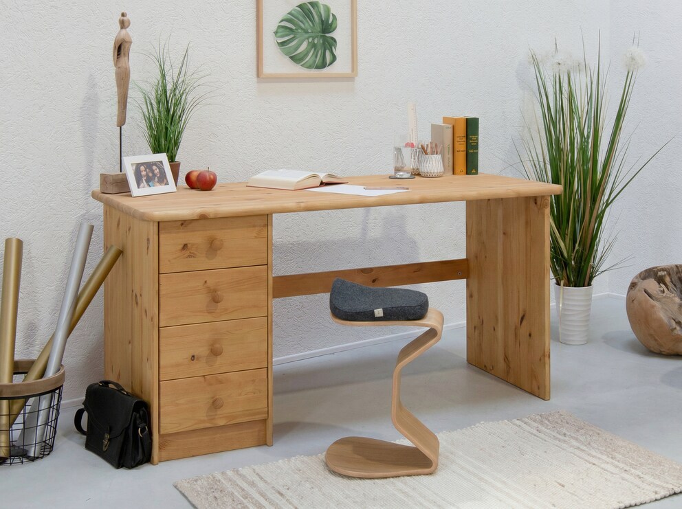 Dieser praktische Schreibtisch ist ideal für Ihr Heimbüro und auch als Jugend-Schreibtisch bestens geeignet. Die schöne Tischplatte hat eine komfortable Tiefe von 68 cm und bietet viel Platz für das Schulbuch und das Heft oder andere gerade benötigte Unterlagen. In den geräumigen Schubladen mit schönen Holzknöpfen sind Stifte und Papier gut aufgehoben.