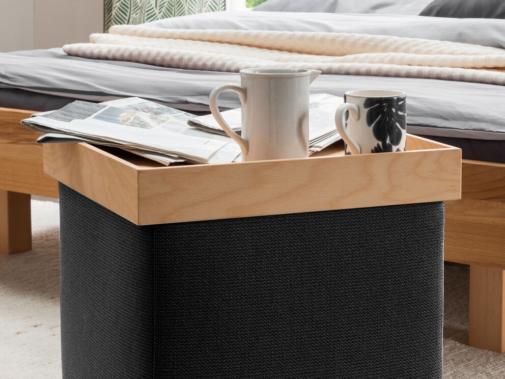 Mit Hocker "Juan" und dem passenden Tablett ist das kein Problem mehr! Ergänzen Sie Ihren Hocker "Juan" einfach um ein praktisches Tablett aus massivem Buchen- oder Eichenholz. Nicht nur fürs Frühstück am Bett, sondern auch als zusätzliche Ablagefläche für ein Glas Wasser, ein Buch oder ein paar Taschentücher ist das Tablett des flexiblen Hockers geeignet. Auch im Wohnzimmer dient das Tablett "Juan" als zusätzliche Tisch-Ablagefläche für Fernbedienung oder ein paar Leckereien bei einem gemütlichen Fernsehabend.