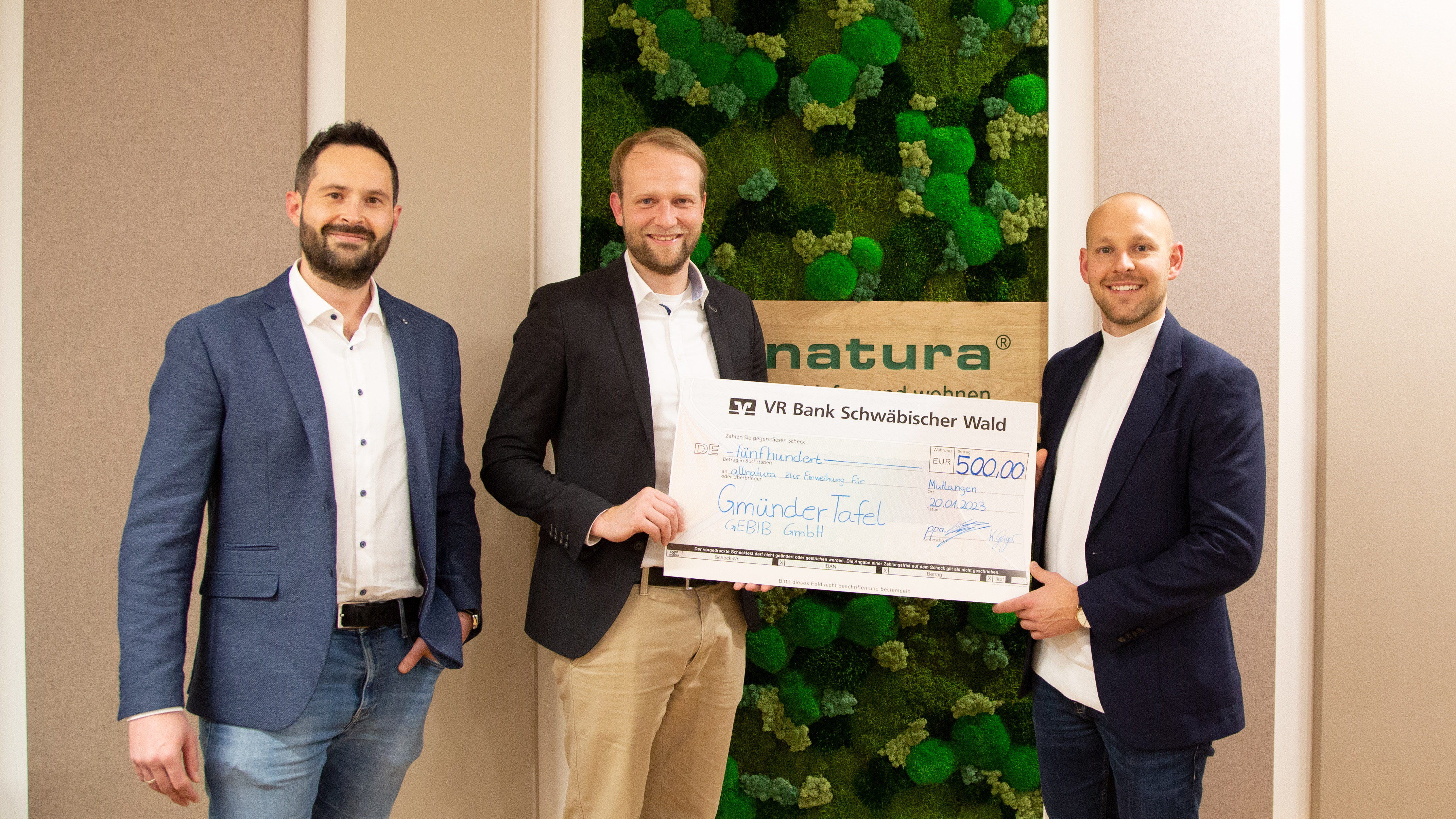 Anlässlich der baulichen Erweiterung des bestehenden Firmengebäudes zum allnatura-Campus, stellt die VR Bank Schwäbischer Wald als langjähriger Partner einen Spendenscheck in Höhe von 500 Euro aus. Der Empfänger der Spende wurde vorab gemeinsam festgelegt: die Gmünder Tafel. allnatura weiß diese großzügige Geste zu schätzen und beschließt direkt, den Betrag zu verdoppeln. Die Gmünder Tafel erhält somit insgesamt eine Spendensumme von 1.000 Euro.