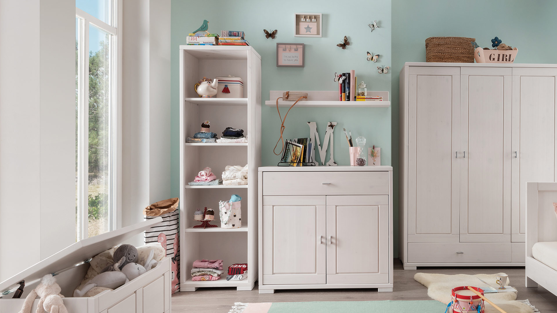 Neben diesem praktischen Regal bieten wir Ihnen zudem einen schönen Kleiderschrank in 2-türiger oder 3-türiger Ausführung, ein hübsches Kinderbett und eine sehr praktische sowie schöne Wickelkommode an.
