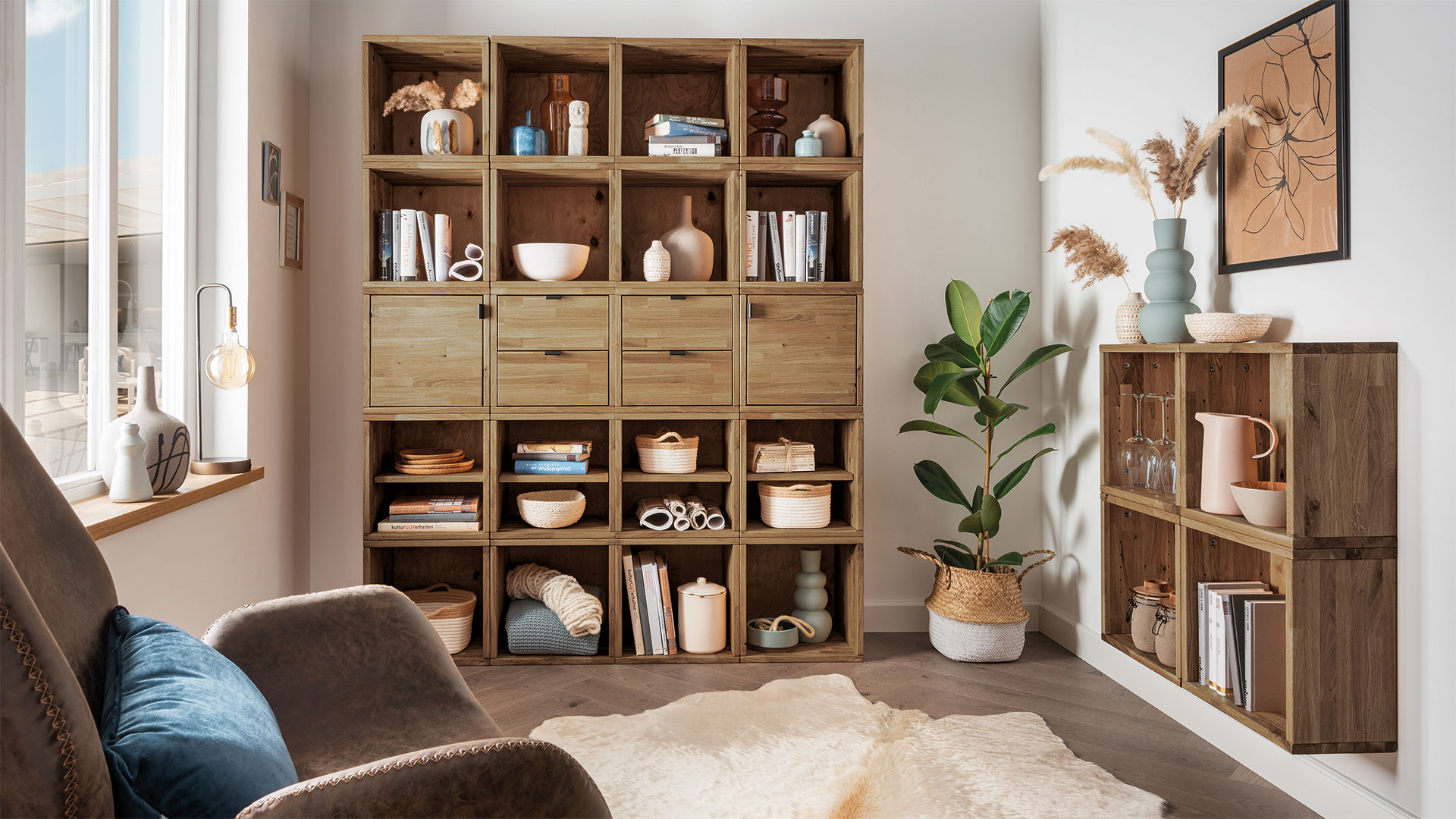 Vielseitig, elegant und edel - dieses hochwertig verarbeitete Massivholz-Regalsystem passt sich spielend Ihrer Raumsituation an! Die praktischen Würfel in 2 unterschiedlichen Tiefen sind flexibel kombinierbar und verwandeln auch Dachschrägen und Nischen in praktische Regalwände.