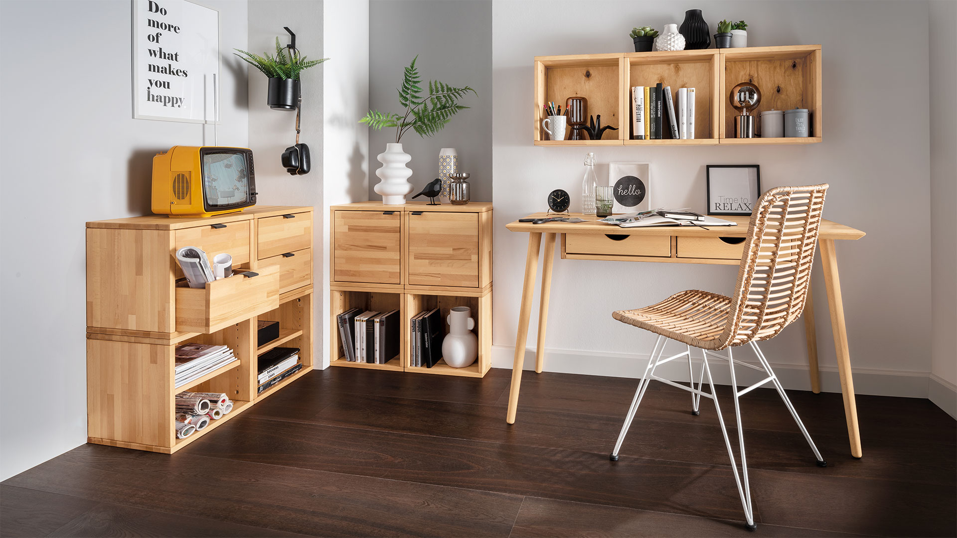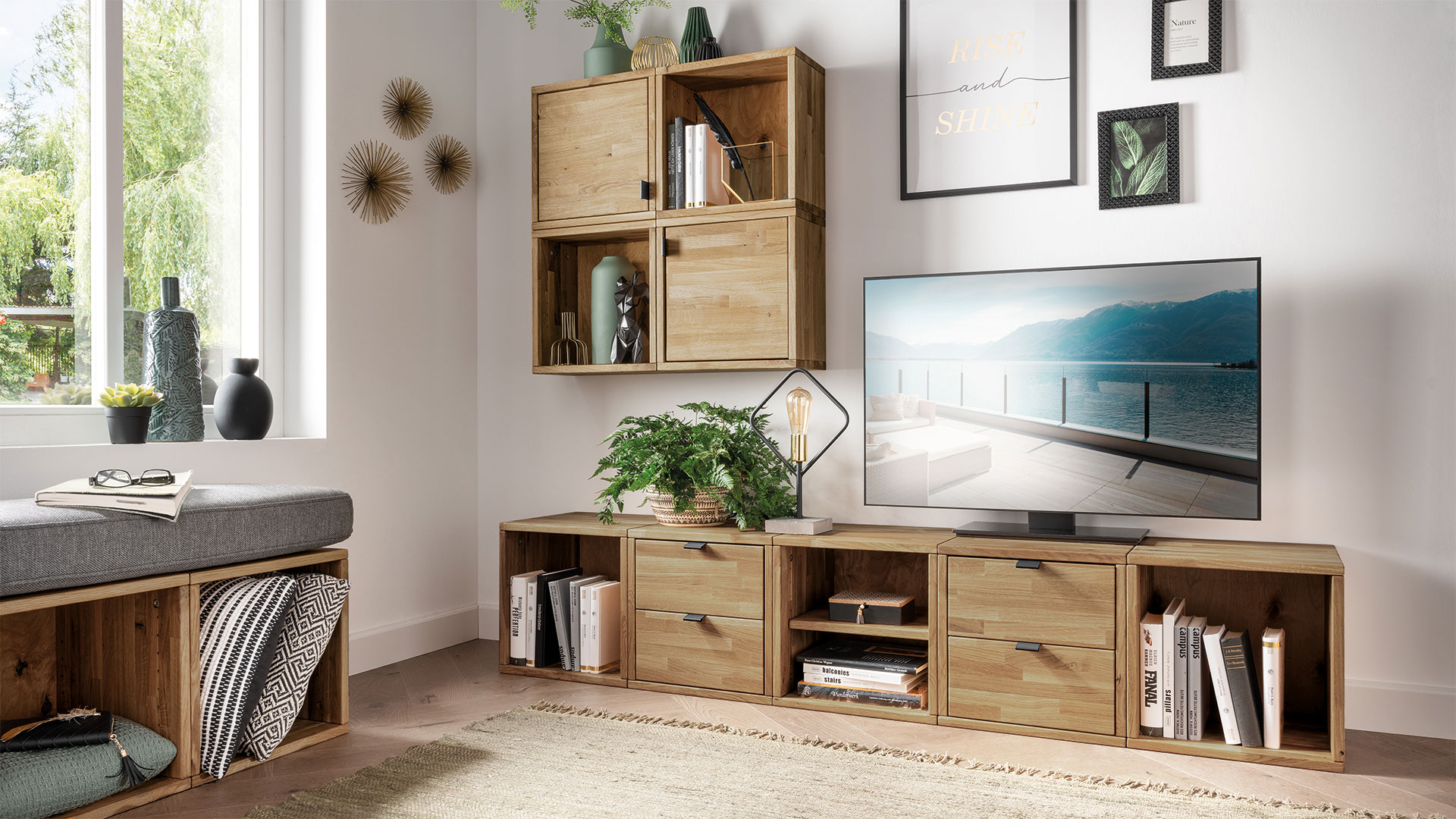 Sie brauchen ein Lowboard, ein Sideboard oder einen Hängeregal? Die Antwort für Ihren Wohnwunsch heißt "Talis"! Denn die praktischen Würfel lassen sich sehr einfach an den eingearbeiteten Hängebeschlägen an der Wand montieren oder auch auf den Boden stellen - wahlweise sogar mit kleinen Füßen. Für verdeckten Stauraum ergänzen Sie einige der schönen Würfel-Elemente einfach mit den passenden Fachböden, Schubladen oder Türen. "Talis" ist auch ideal für Ihr Heimbüro. Denn in dem tieferen Würfel mit 35 cm finden bis zu 4 breite Ordner bequem Platz. Ihr Regalsystem ist wahlweise in Kernbuche oder Eiche erhältlich - ganz, wie es Ihnen gefällt!