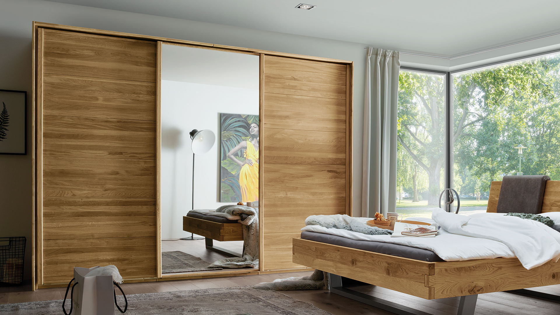 Elegant gemaserte Kernbuche oder markante Wildeiche, auf Wunsch kombiniert mit Spiegel- oder Weißglas. Sie haben beim Schiebetüren-Kleiderschrank "Fiona" die Wahl ...