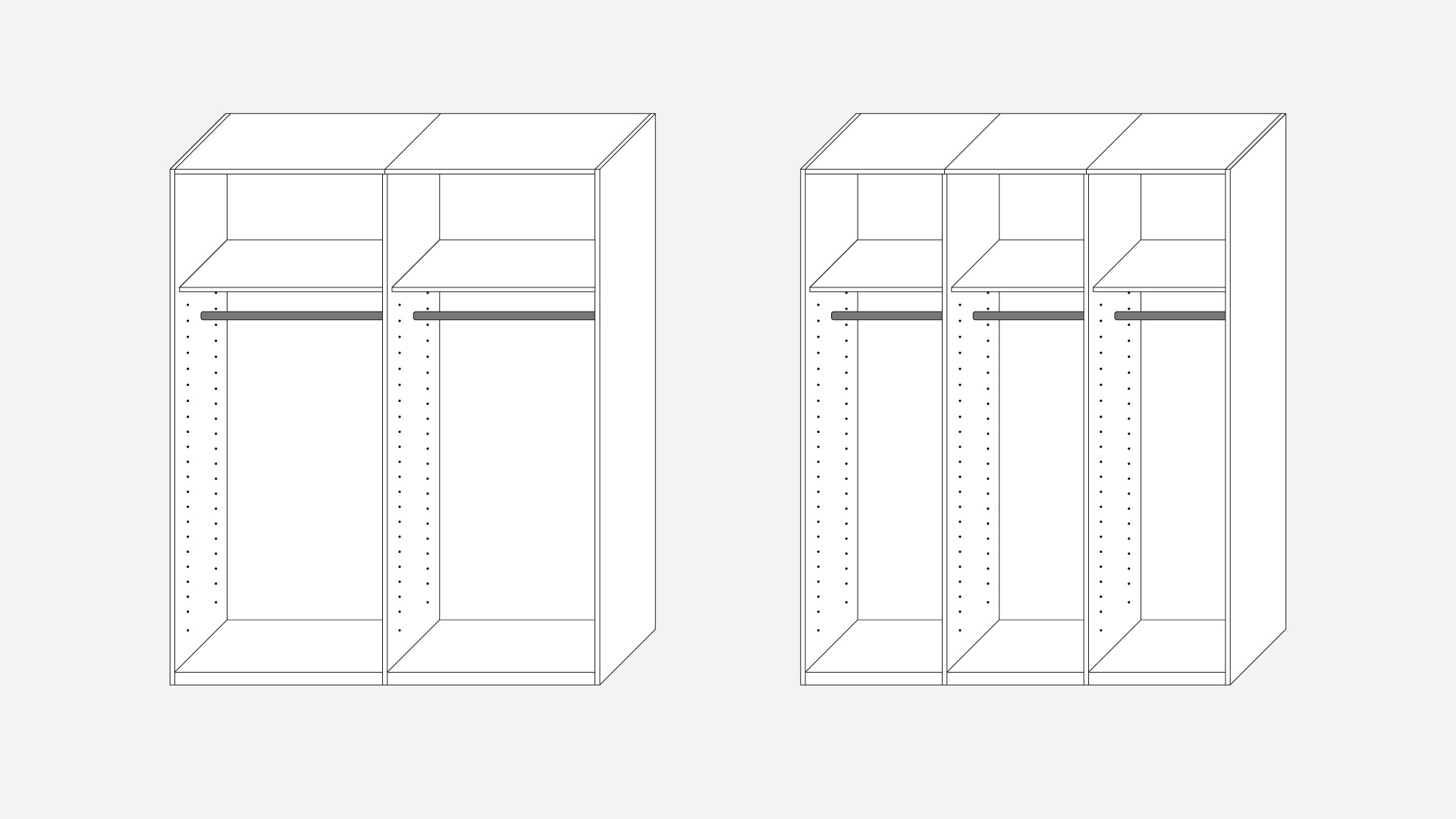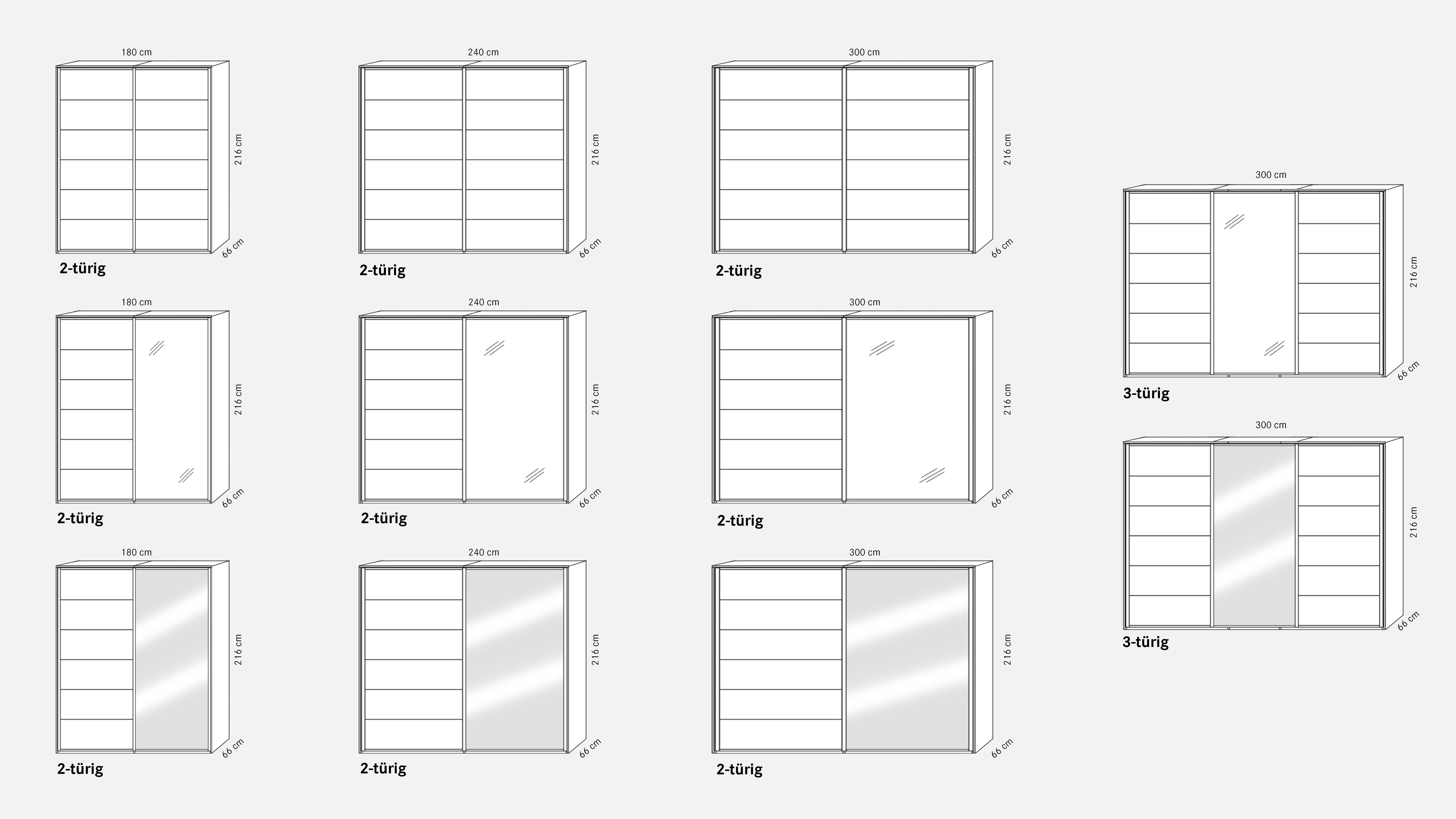 Alle Schrankgrößen erhalten Sie mit 2 Türen. Zudem ist der geräumige Schrank in 3 m Breite auch mit 3 Türen lieferbar - die mittlere Tür ist in diesem Fall eine Weißglas- oder Spiegeltür. Damit Sie auch den Innenraum Ihres "Fiona" ganz nach Ihren Wünschen ausstatten können, bieten wir Ihnen vielfältiges Zubehör an. Das ebenso optional erhältliche Passepartout setzt Ihren Schiebetüren-Kleiderschrank in einen eleganten Rahmen.