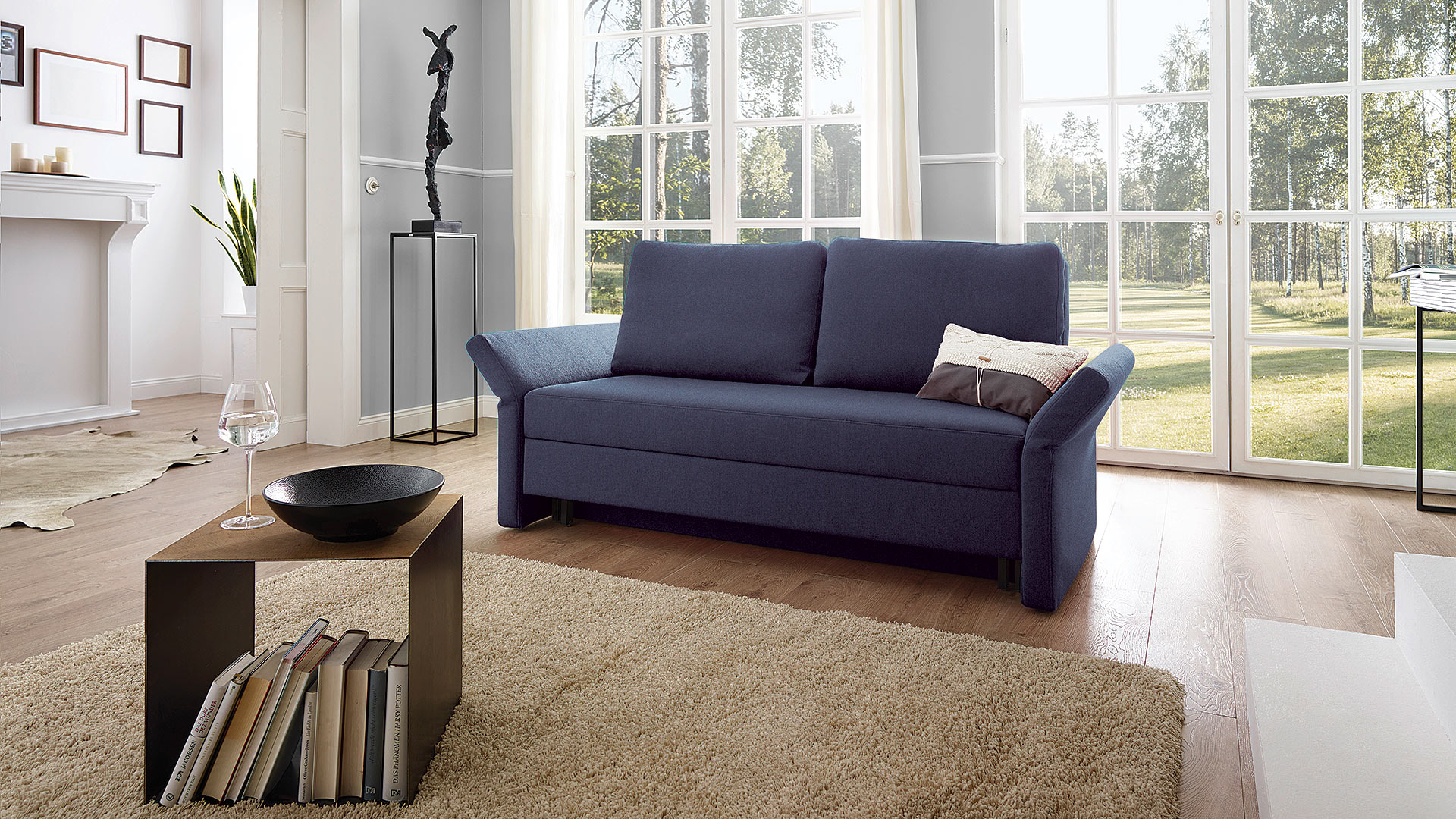 Für die Liegeposition einfach die Sitzblende bis zum Anschlag nach vorne ziehen. Nun ist auch der große Bettkasten sichtbar. Jetzt nur noch den Rücken umklappen und das bequeme Gäste-Doppelbett ist fertig. Genießen Sie den Komfort durch leichteres Aufstehen und Setzen, denn die Liegefläche ist auf Sitzhöhe. Auf Wunsch ist dieses wandelbare Schlafsofa neben einer Polsterung aus Kaltschaum und Wattevlies auch mit Naturlatex-Polsterung lieferbar - Informationen zum Polsteraufbau finden Sie unter "Technische Infos".
