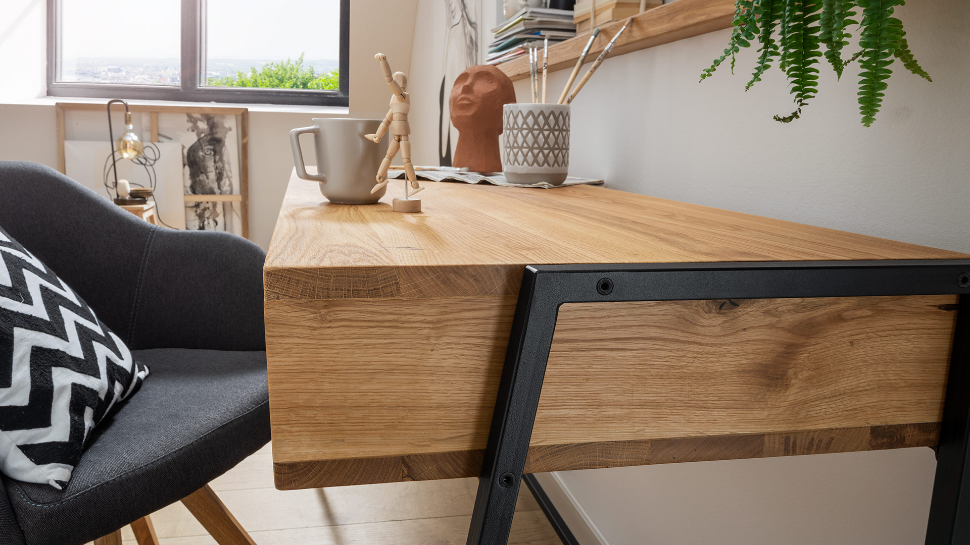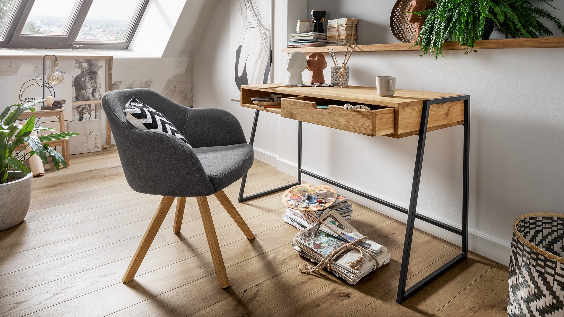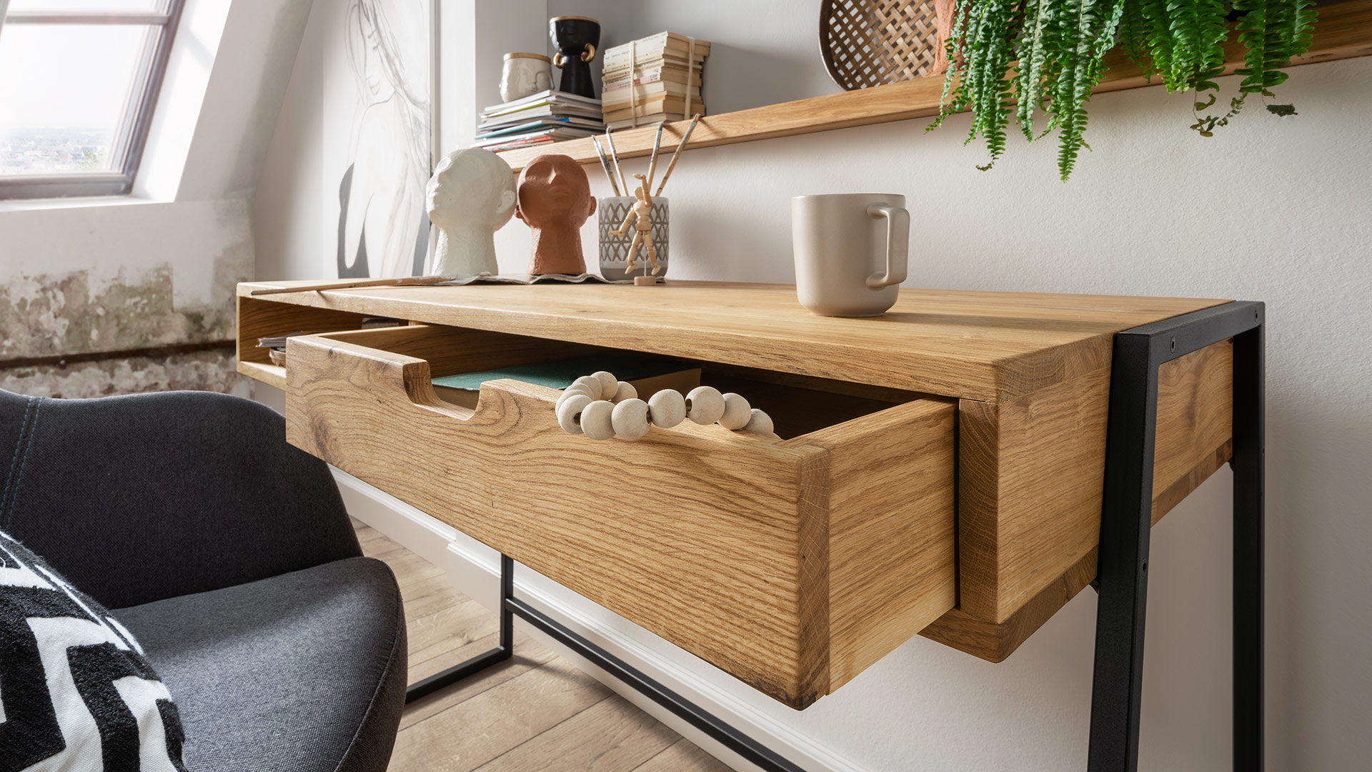 Lebhaft gemasertes Wildeichenholz trifft bei diesem faszinierenden Schreibtisch auf markanten Schwarzstahl. Das geradlinige Design wirkt luftig und leicht und gefällt damit auch in einem kleinen Heimbüro. Das perfekt eingepasste, von außen sichtbar verschraubte Tischelement mit 2 Ablagefächern scheint fast zwischen den Rahmenteilen zu schweben.