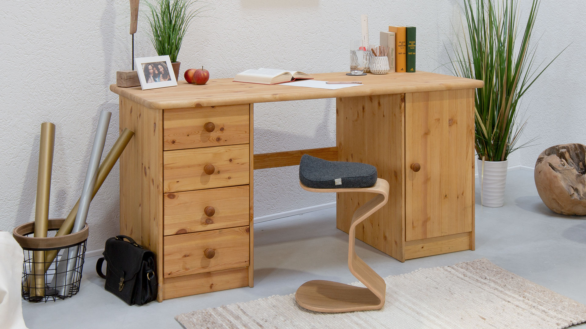 Dieser praktische Schreibtisch ist ideal für Ihr Heimbüro und auch als Jugend-Schreibtisch bestens geeignet. Die schöne Tischplatte hat eine komfortable Tiefe von 68 cm und bietet viel Platz für das Schulbuch und das Heft oder andere gerade benötigte Unterlagen. Sie erhalten "Nino" in 2 unterschiedlich breiten Varianten. Beiden gemeinsam sind geräumige Schubladen mit schönen Holzknöpfen, in denen Stifte und Papier gut aufgehoben sind. Die breitere Variante 02 bietet mit einem Schrankfach zusätzlichen Stauraum für Ordner und Schulzeug.