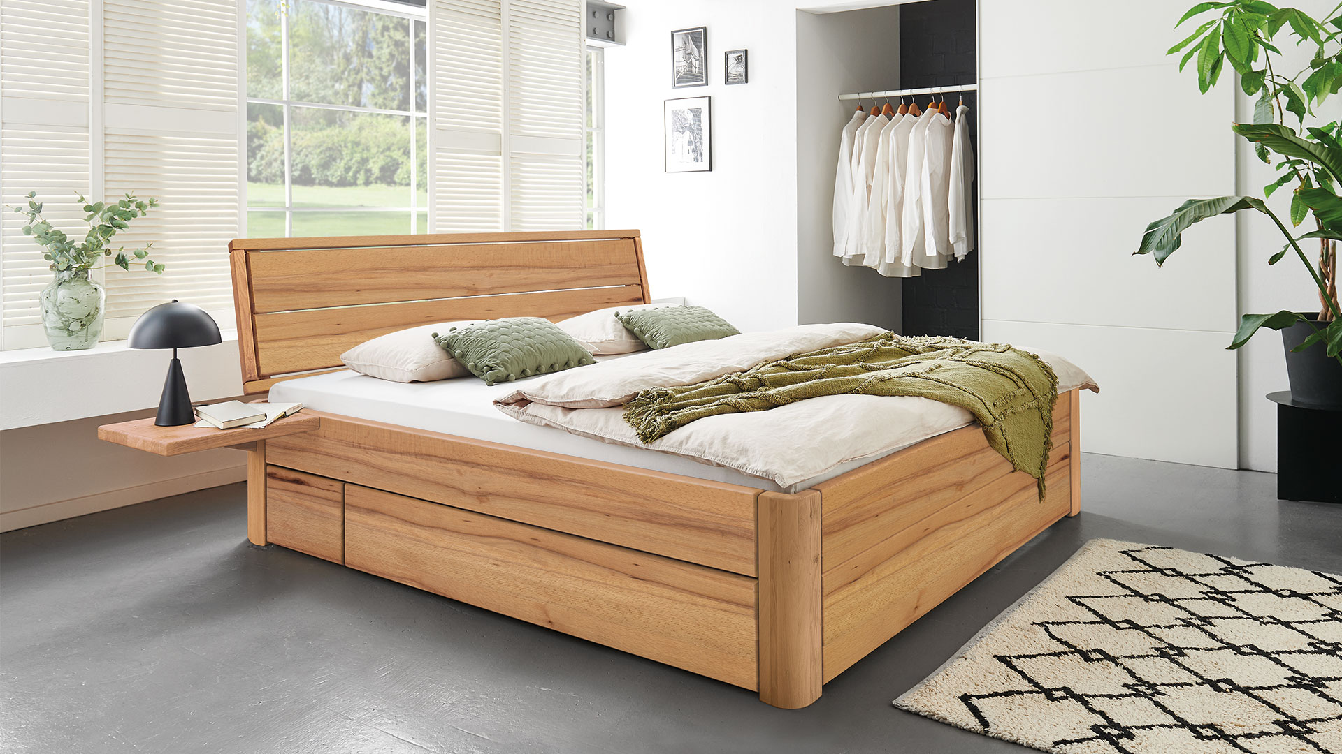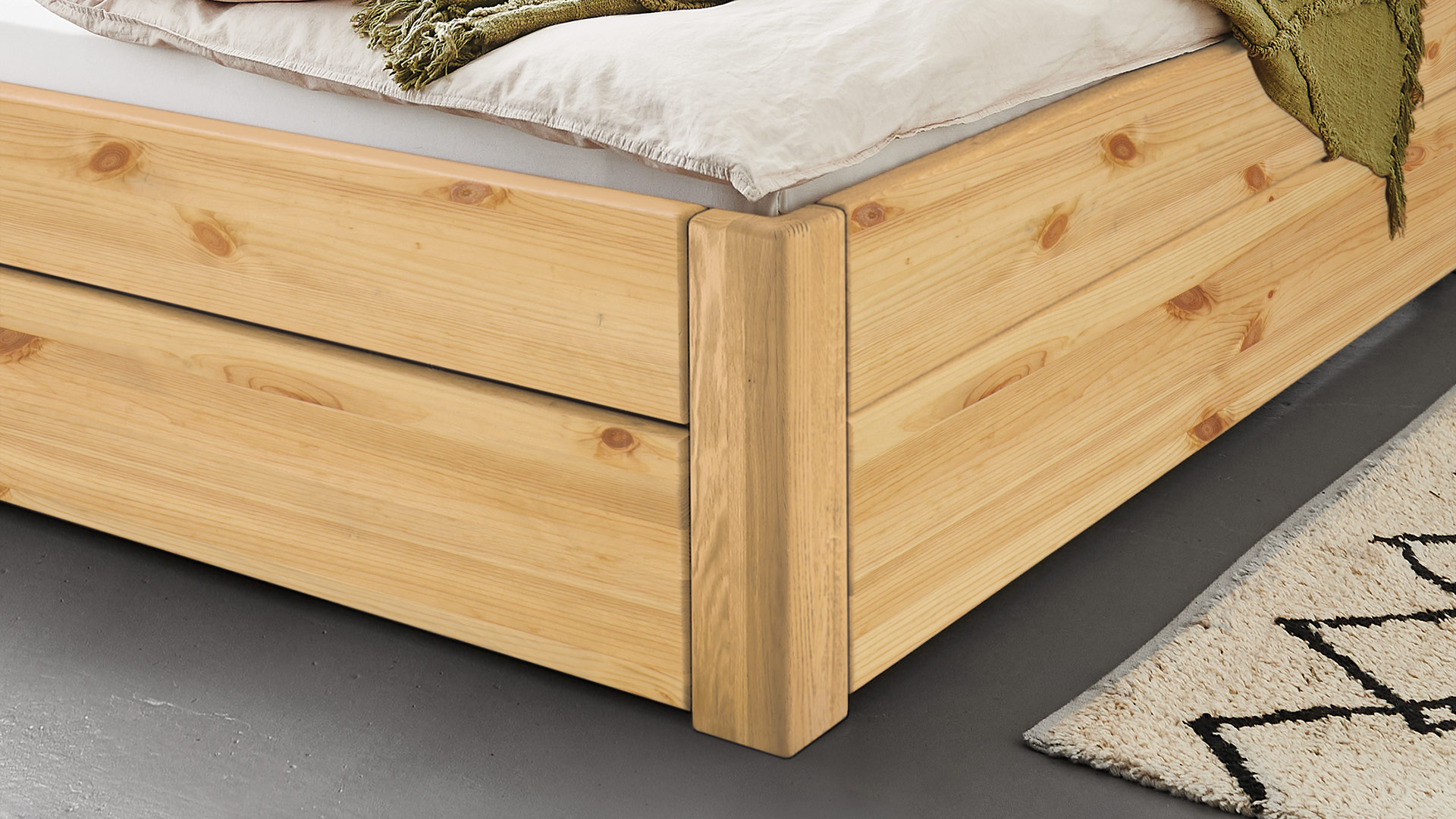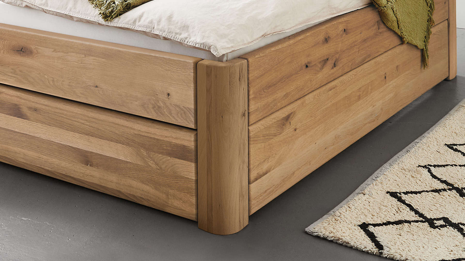 Das edle Schubkastenbett schafft eine heimelige Atmosphäre, wie sie nur von Massivholz ausgehen kann. Es verbindet zeitloses Design mit individueller Ausstrahlung. Neben der Kernbuche, die durch ihre gleichmäßige und dunkle Maserung für eine warme und elegante Atmosphäre sorgt, besticht das Kiefernholz durch seine kontrastreiche und lebhafte Oberfläche. Der ruhige Charakter des schönen Eichenholzes verleiht Ihrem Schlafzimmer eine angenehm warme Stimmung. Gehen Sie zu Bett, kommen Sie zur Ruhe und genießen Sie es, Ihre Seele baumeln zu lassen.