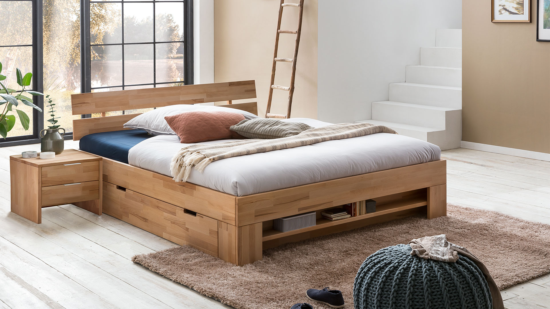 Die beiden Schubkästen mit dezent eingearbeiteten Griffmulden zaubern aus ungenutztem Raum eine praktische Aufbewahrungsmöglichkeit für Bettdecken, Kissen & Co.
