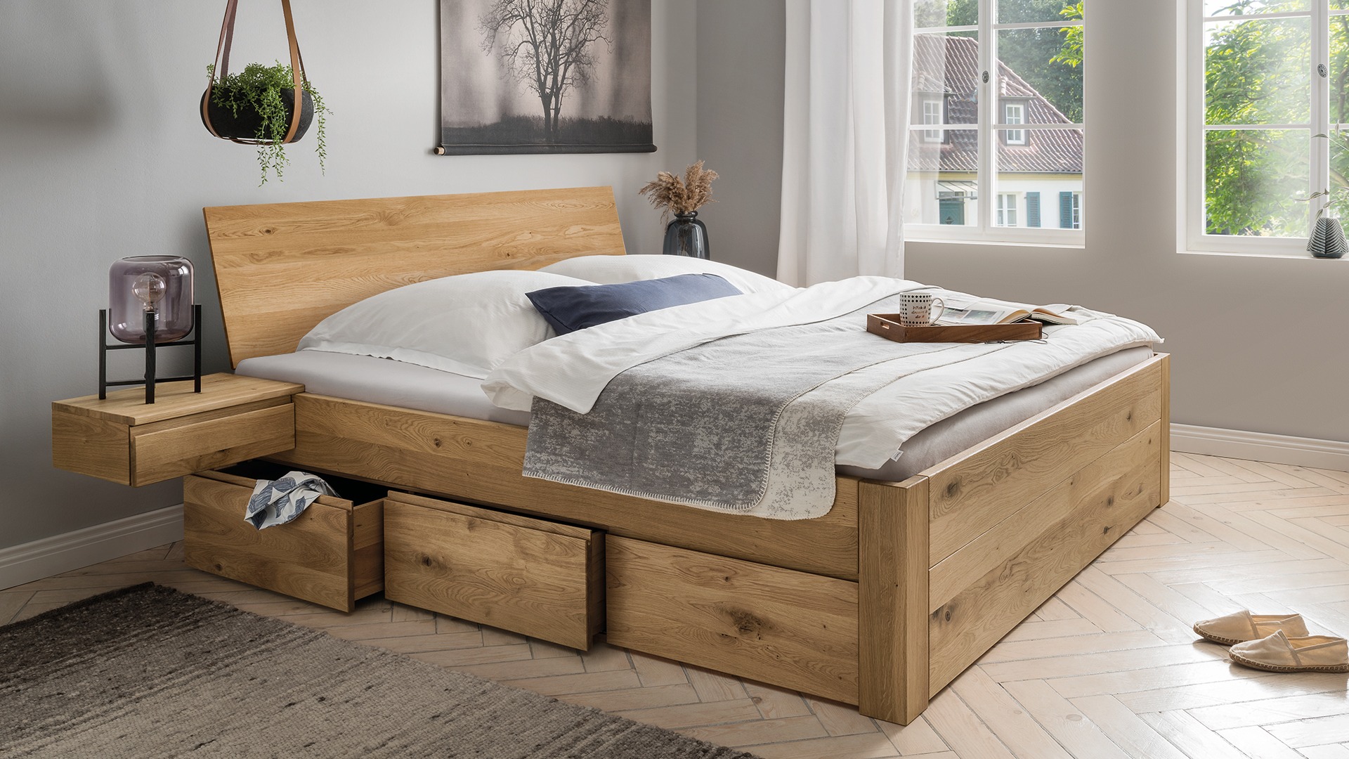 ... in einen zeitlosen Klassiker. Dieses praktische Raumwunder für Ihr Schlafzimmer erhalten Sie in 4 Bettbreiten. Für große Menschen besonders interessant: Schubkastenbett "Svariata" ist auch in der Überlänge 220 cm erhältlich.