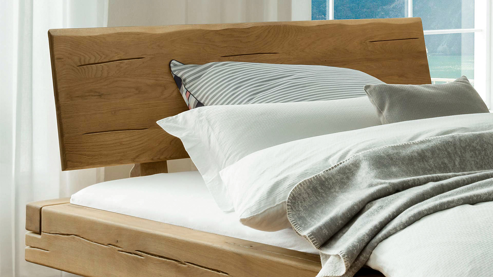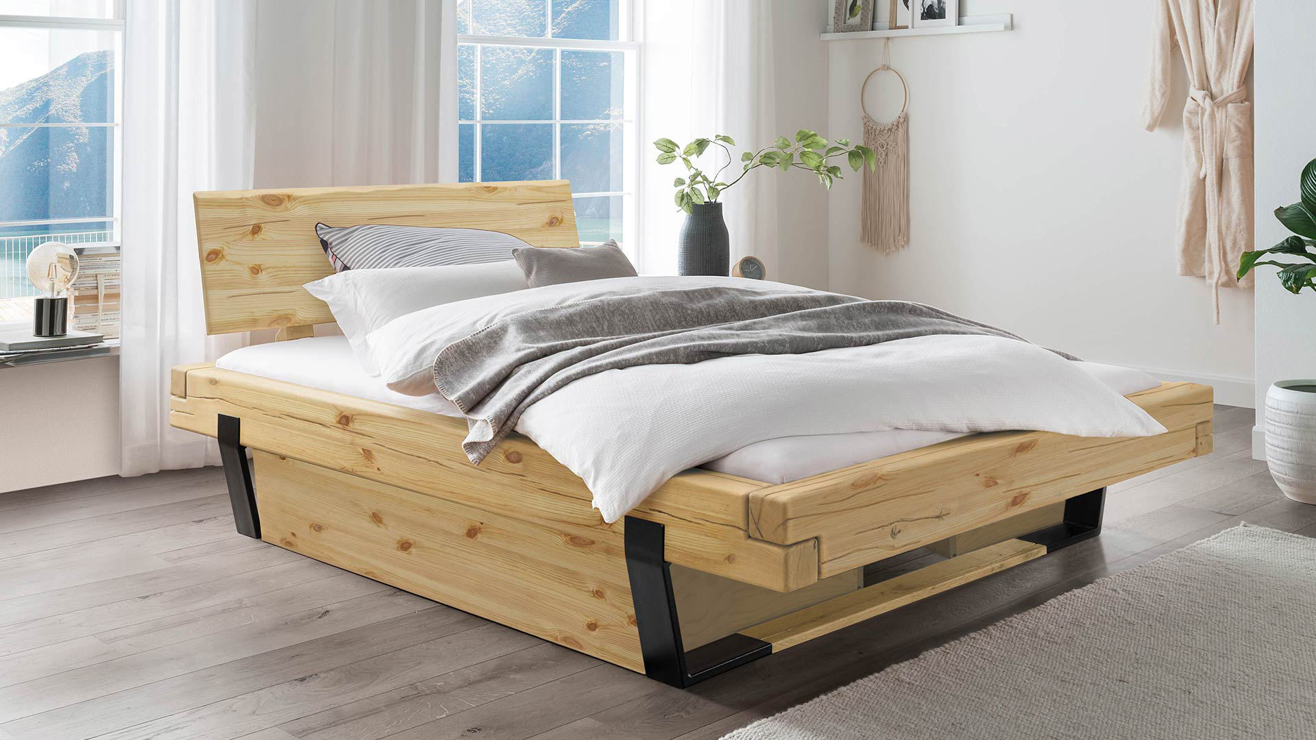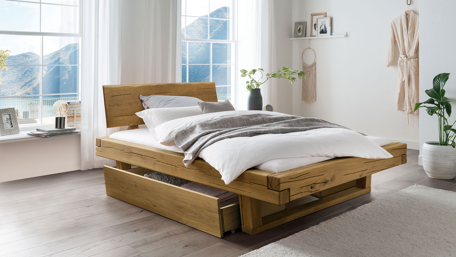 Das Schubkastenbett "Tegora" bringt rustikalen Charme und moderne Eleganz in Ihr Schlafzimmer. Das sanft geneigte Kopfteil mit seinem einzigartigen Baumkanten-Abschluss verleiht dem Bett einen natürlichen, unverwechselbaren Charakter. Die massiven Holzbalken in Kombination mit den schlanken Kufenfüßen sorgen für eine kraftvolle, aber gleichzeitig elegante Optik. Fein eingearbeitete Wuchsrisse im Rahmen und Kopfteil setzen raffinierte Akzente, die das Design auf besondere Weise abrunden.