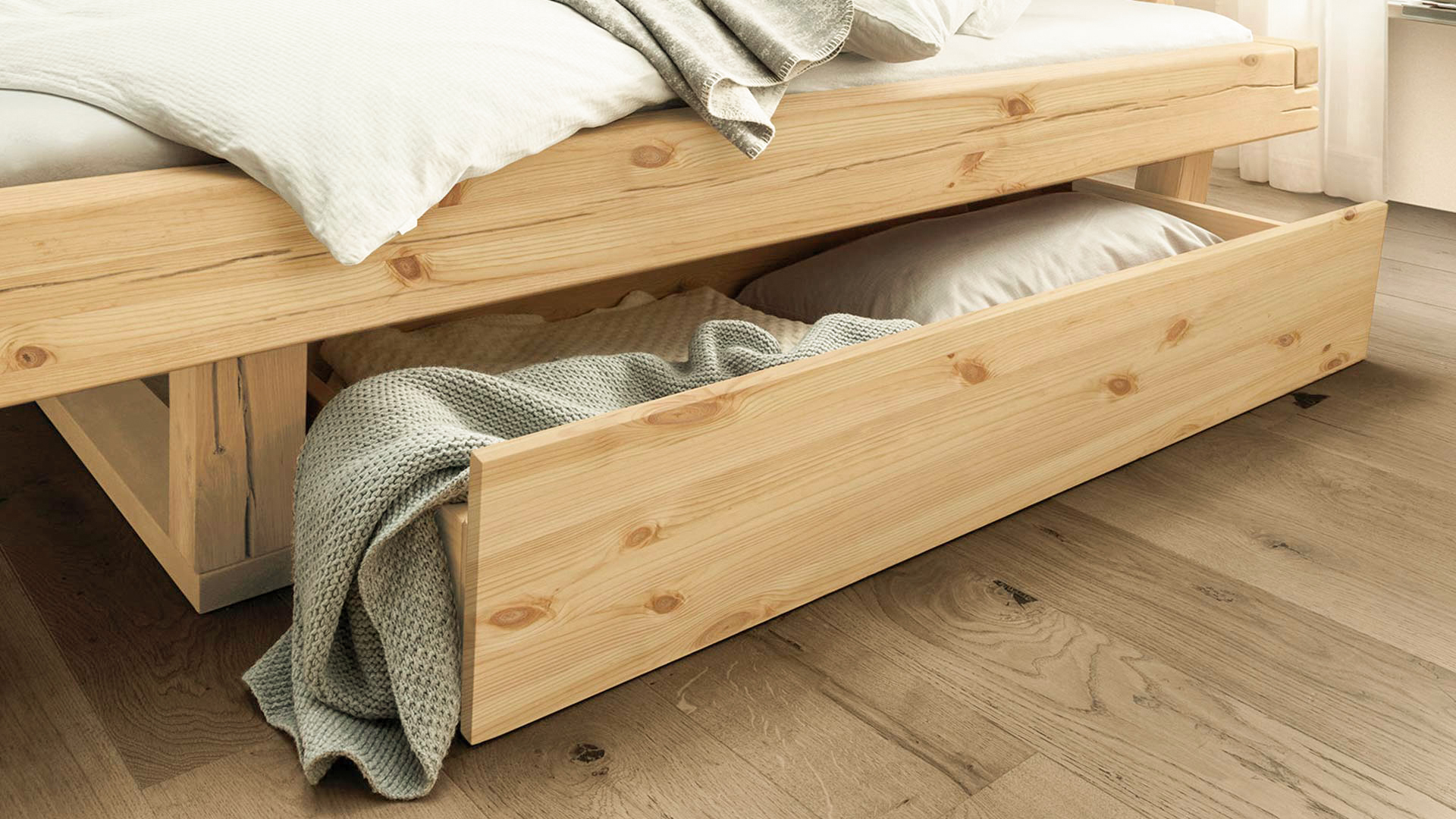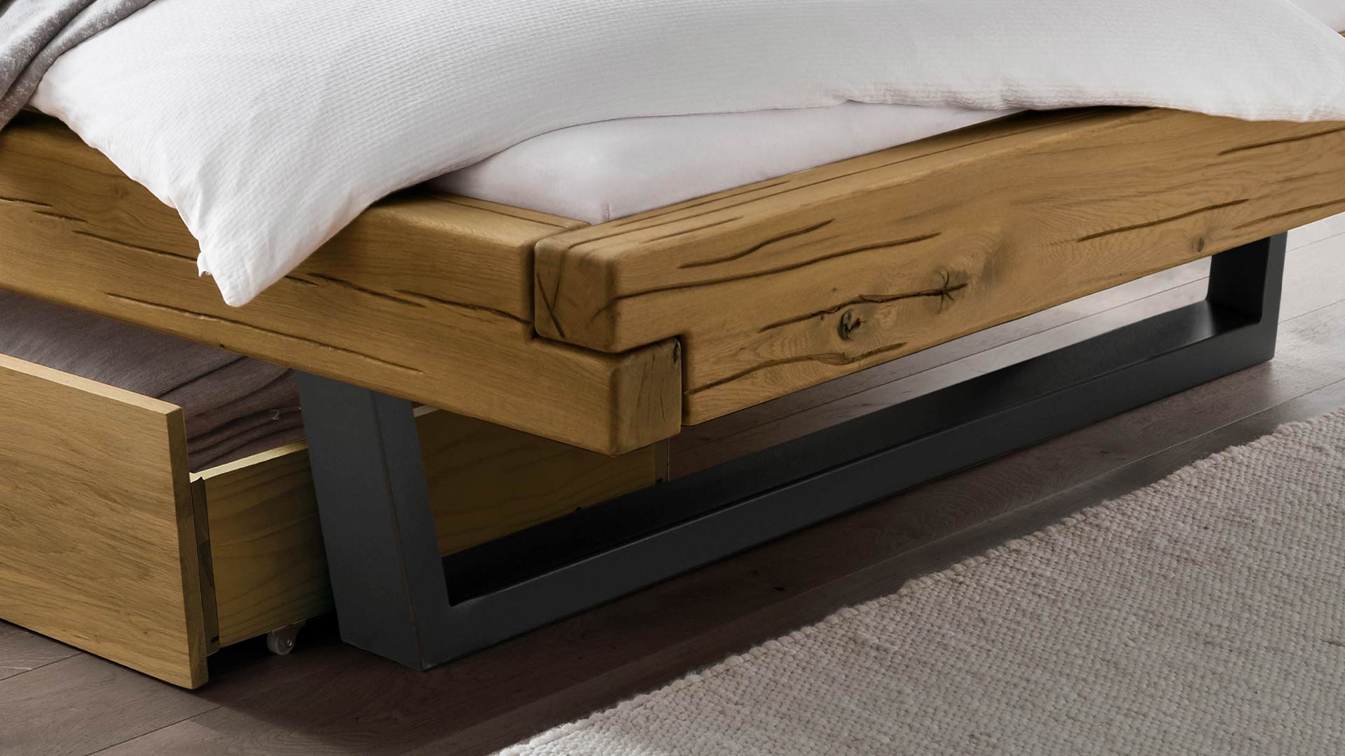 Neben seiner schönen Form überzeugt "Tegora" auch durch seine Funktionalität. Zwei großzügige Schubkästen unter dem Bett bieten viel Stauraum und lassen sich über feine Laschen aus natürlichem Hanf-Gewebe herausziehen. Das Schubkastenbett ist auch ohne Kopfteil erhältlich, wodurch es auch perfekt unter eine Dachschräge gestellt werden kann. Wählen Sie zwischen trendigen Metallkufen, natürlichen Holzkufen oder einer stilvollen Mischung aus Holz und Metall und entscheiden Sie sich für helle, leichte Fichte oder rustikale Wildeiche, je nachdem, welcher Stil besser zu Ihrem Zuhause passt.