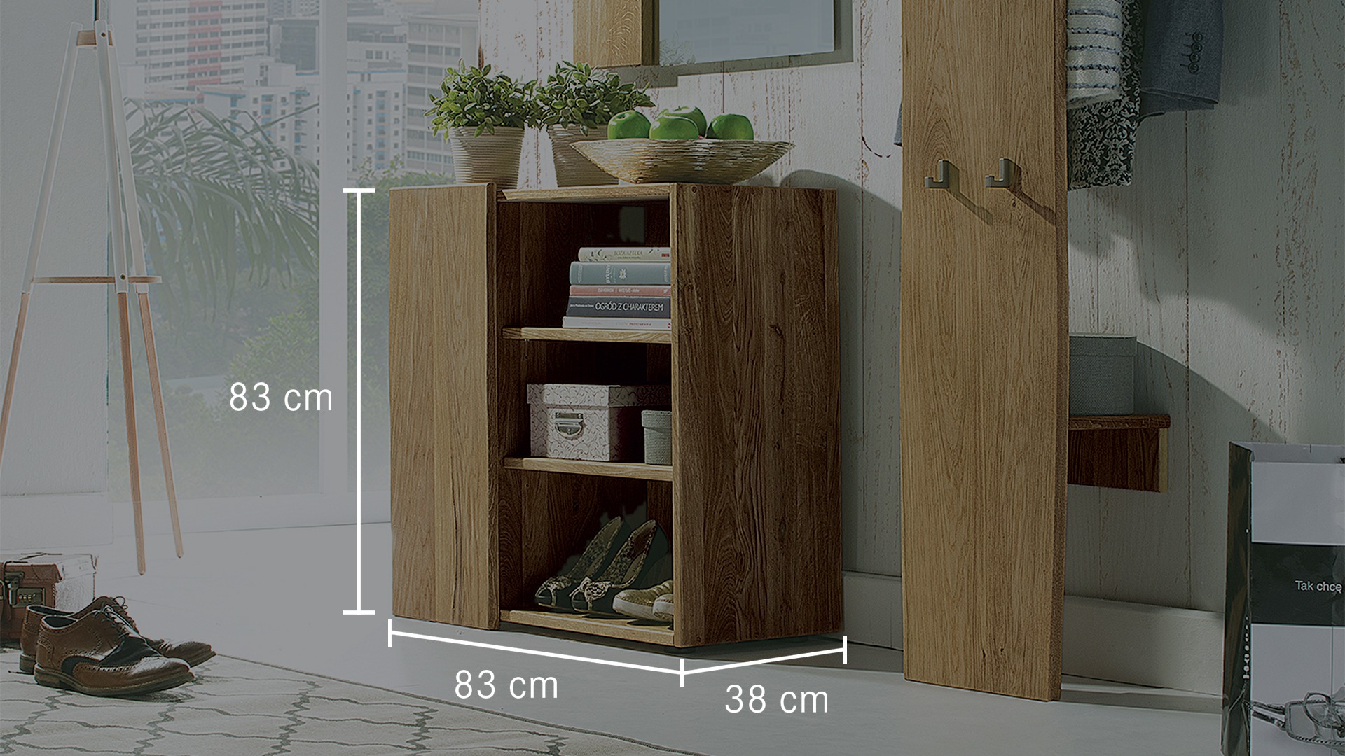 Selbstverständlich haben die Massivholz-Spezialisten auch an Ihre Schuhe gedacht. Hinter der Tür in Naturform finden Sie praktische Schuhablage, auf denen Sie je nach Schrank-Variante bis zu 5 Paar Schuhe verstauen können. Genug für den Eingangsbereich. Morgens kommen die Hausschuhe der Familie hinein, abends werden sie gegen Ihre Straßenschuhe getauscht. So wird Ordnung in der Diele ein Kinderspiel.