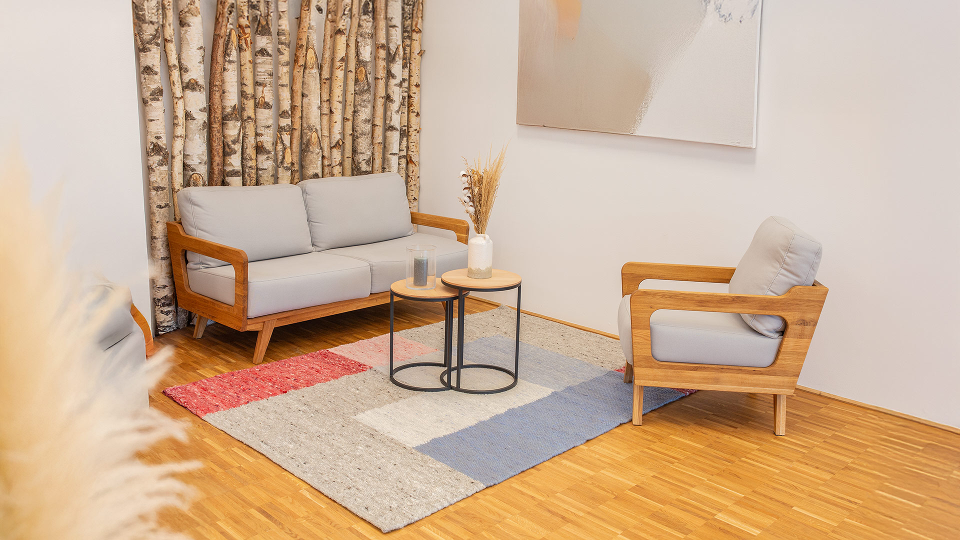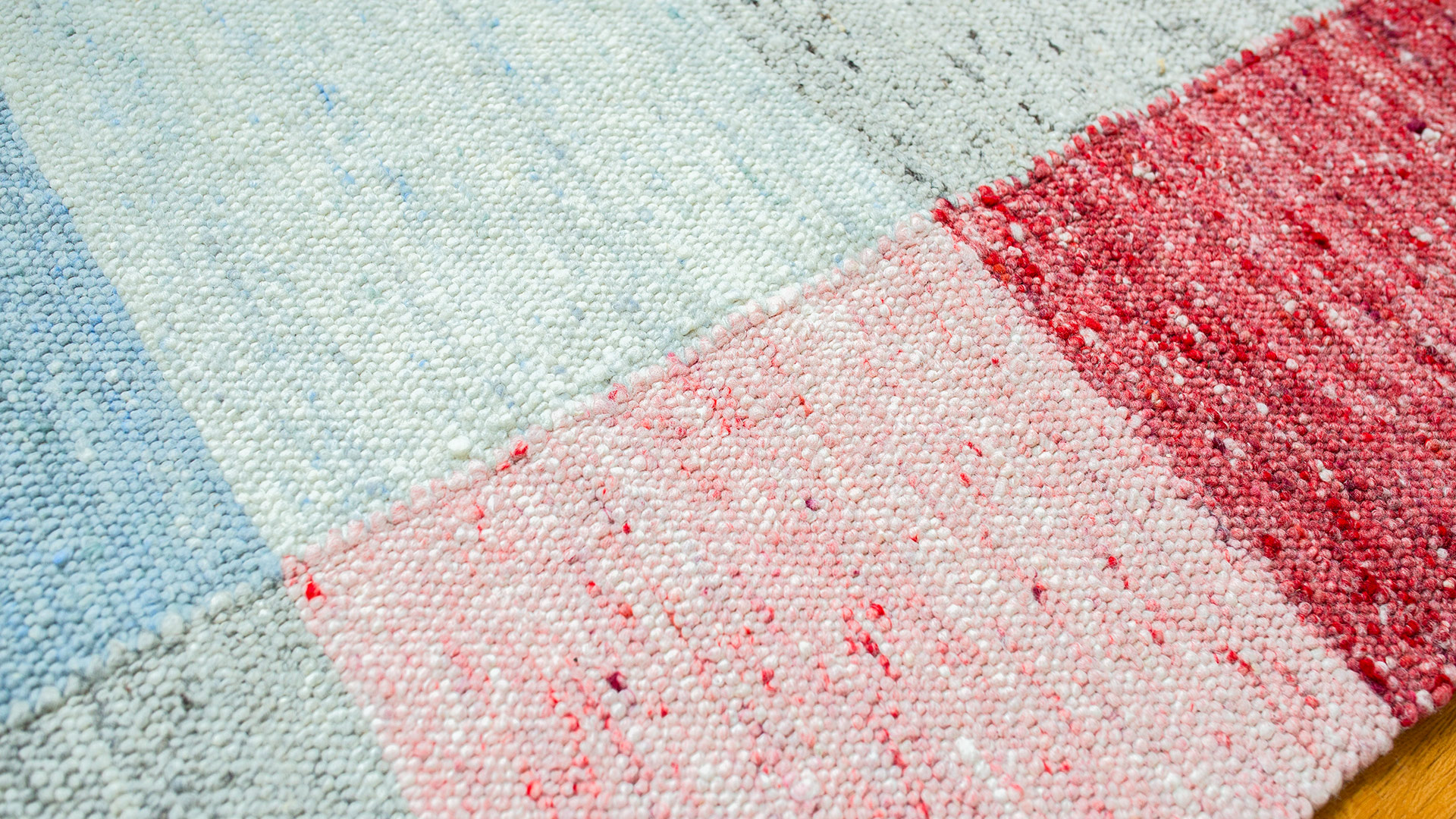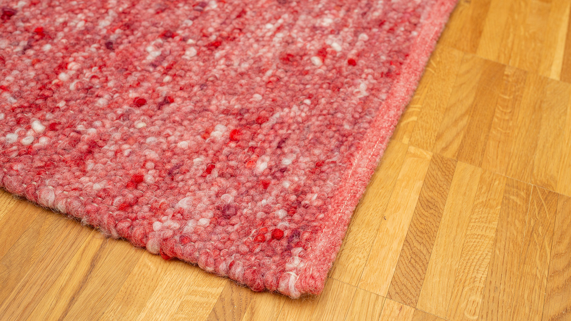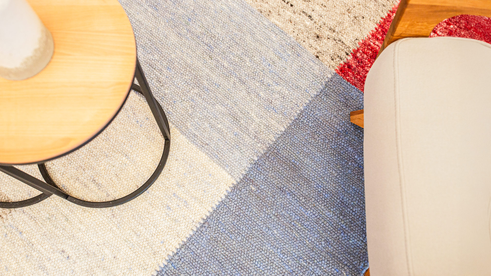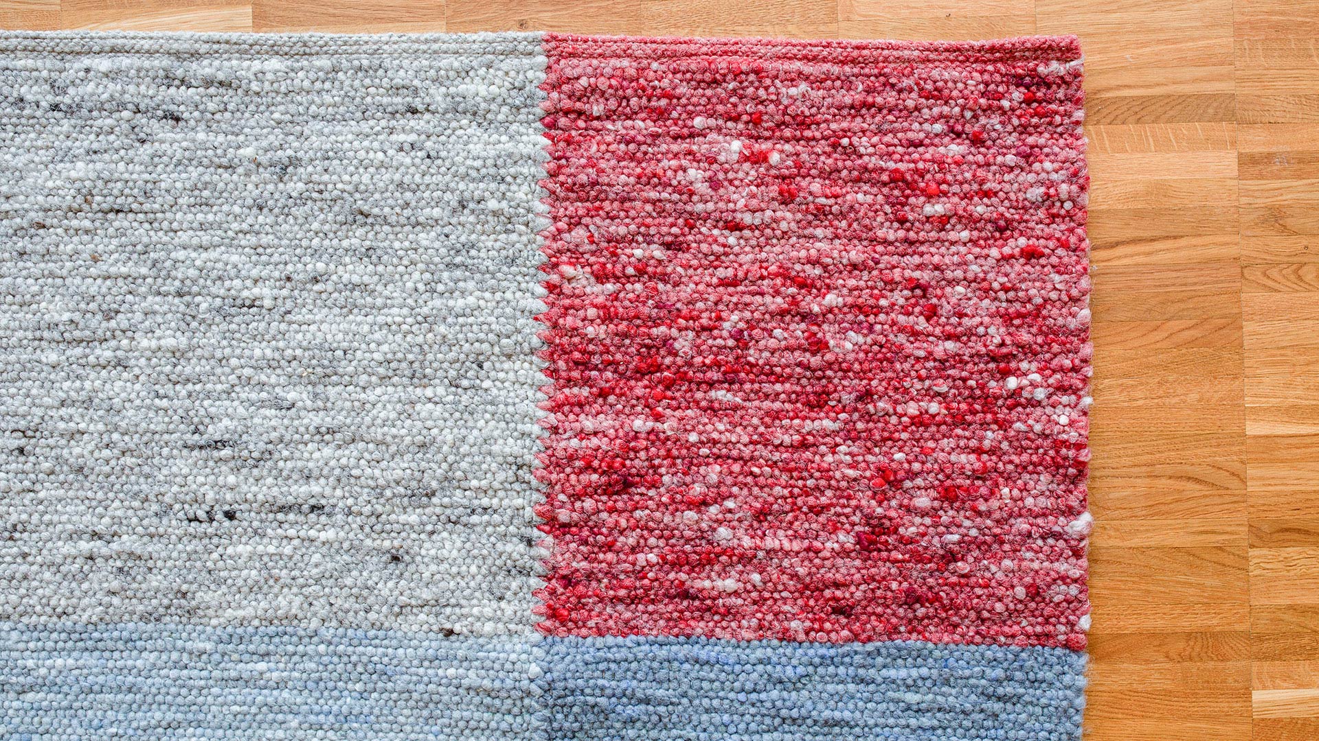 Der Schurwollteppich "Pattia" vereint warme Rottöne mit sanften Grau- und Blaunuancen zu einem harmonischen Gesamtbild. Das klare, grafische Muster verleiht dem Raum eine ruhige, wohnliche Atmosphäre und schafft gleichzeitig einen schönen farblichen Akzent auf dem Fußboden. Die ungewalkte Schurwolle sorgt zudem für eine besonders weiche Oberfläche, die angenehm unter den Füßen ist.